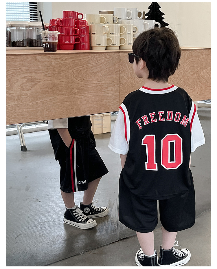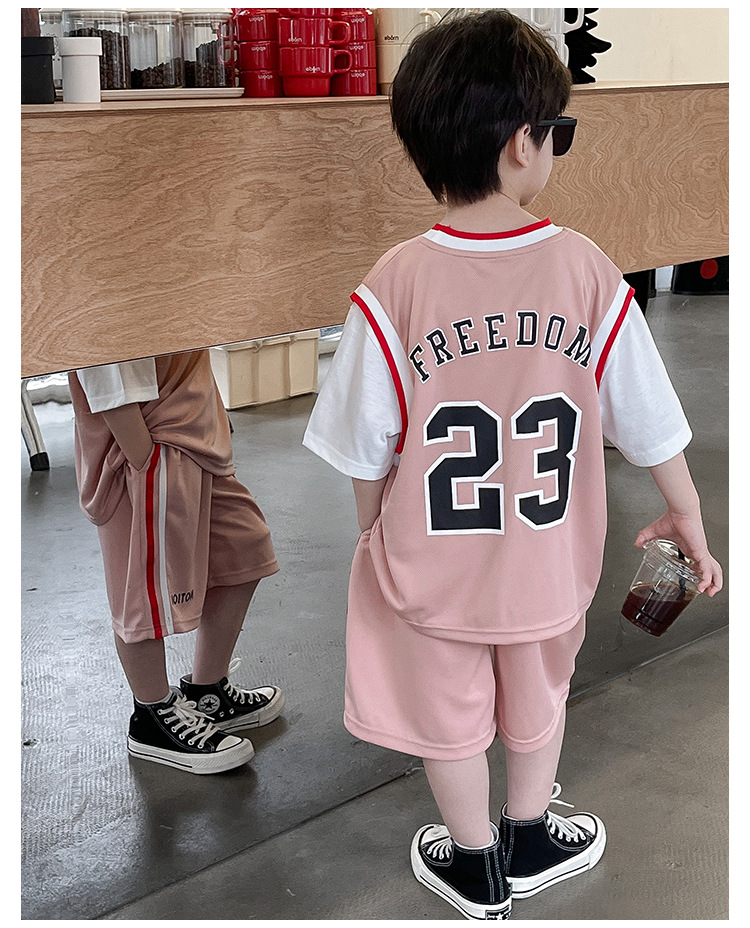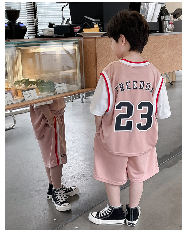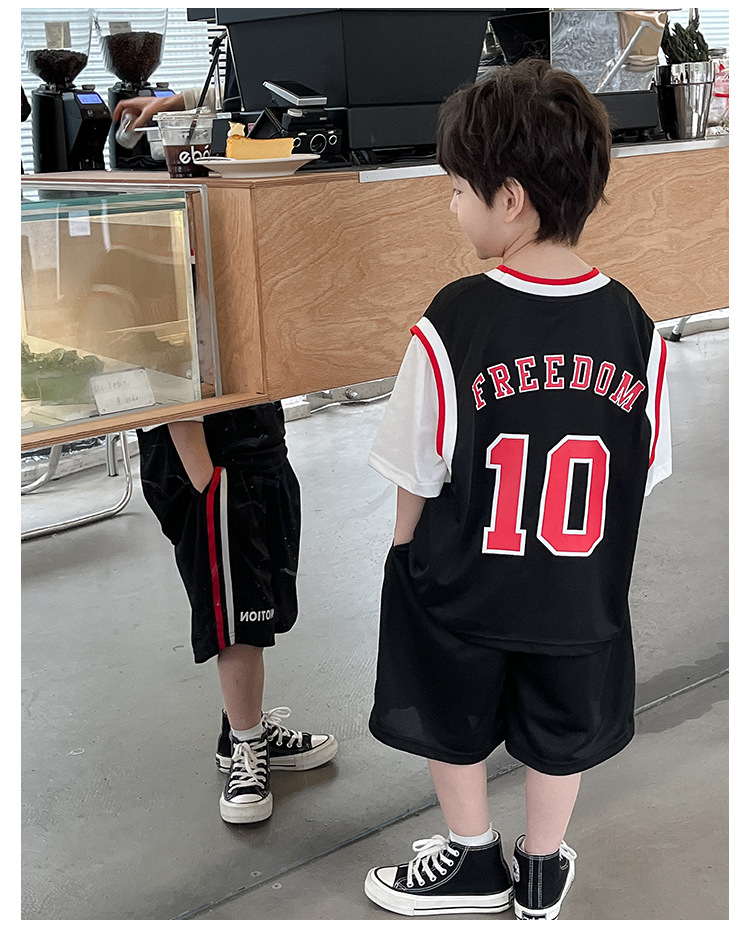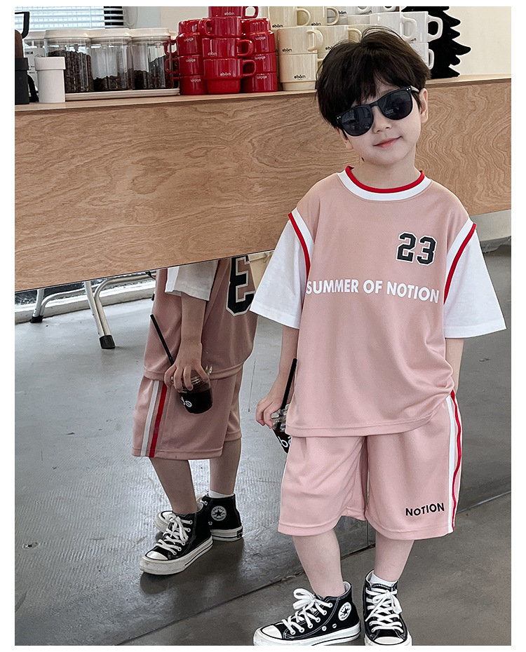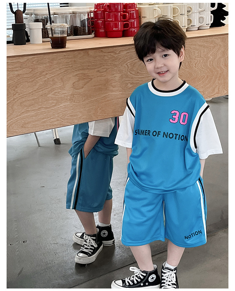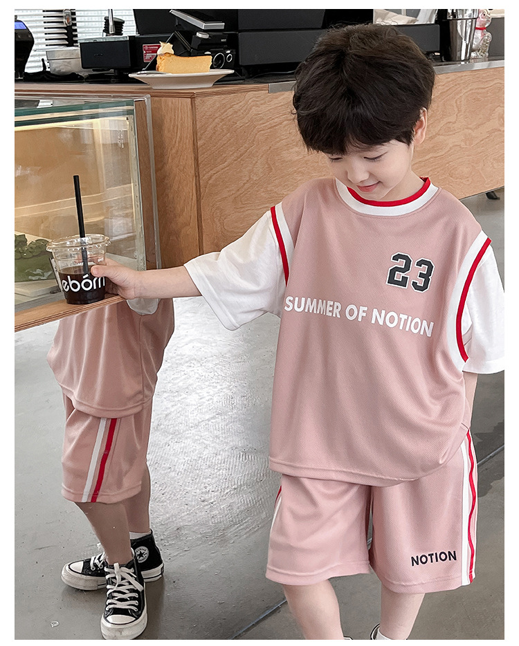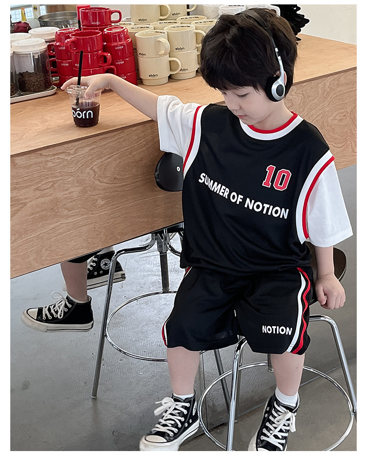 童酷2024儿童夏季新款韩版宝宝字母印花假两件短袖篮球服男童套装