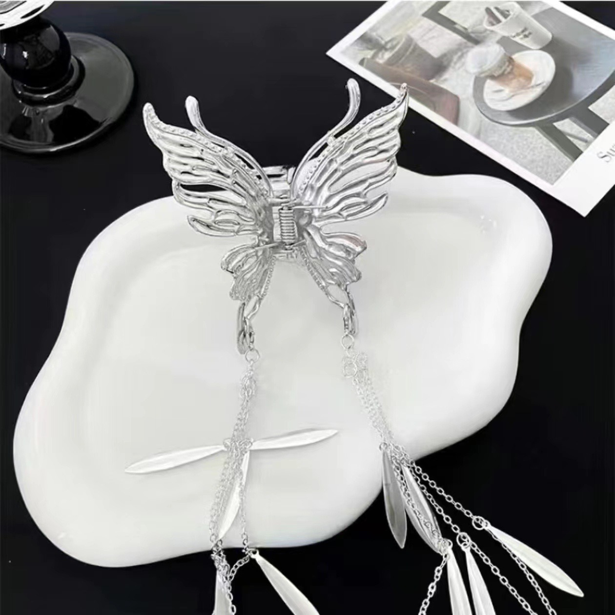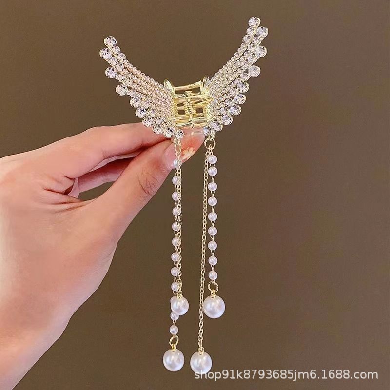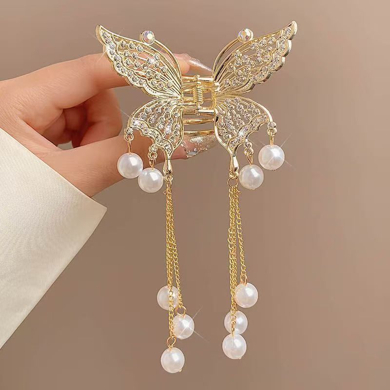优雅缕空镶钻珍珠蝴蝶流苏爪夹夏季金属发夹女后脑勺束发卡发抓夹