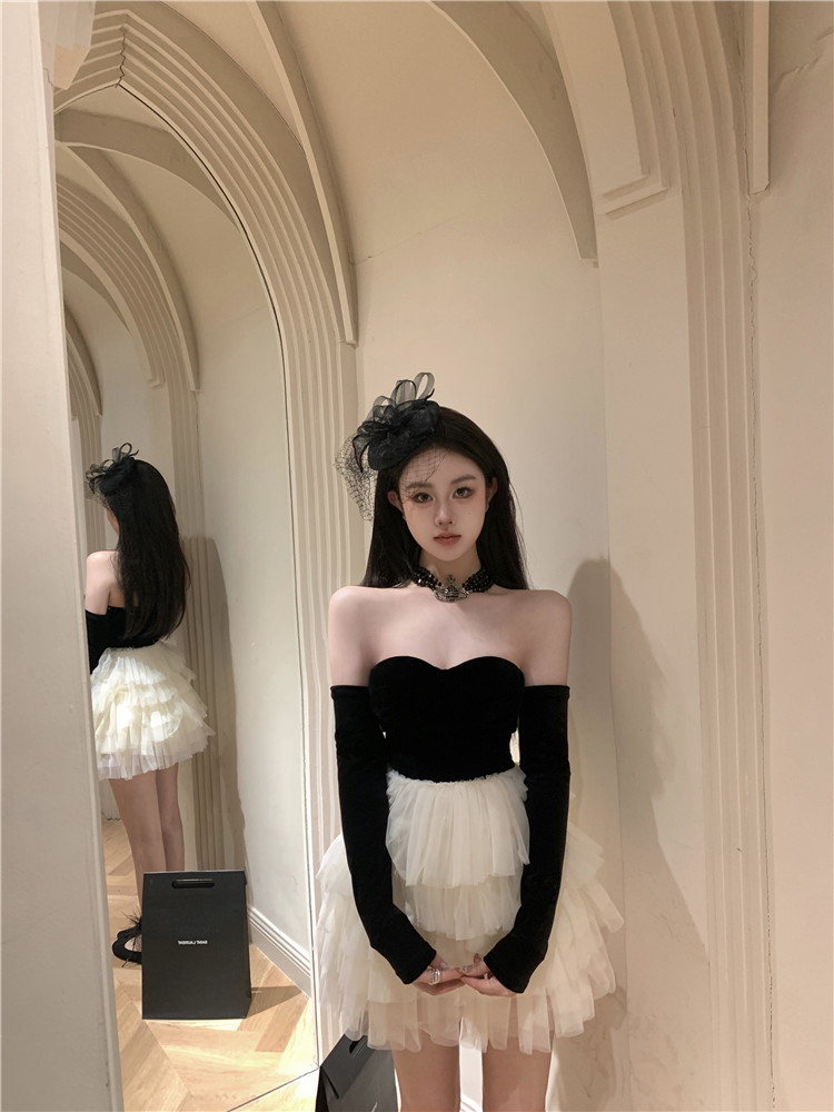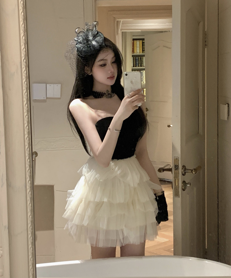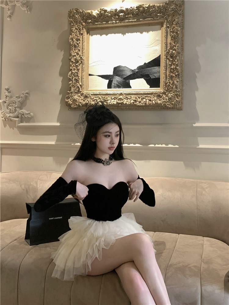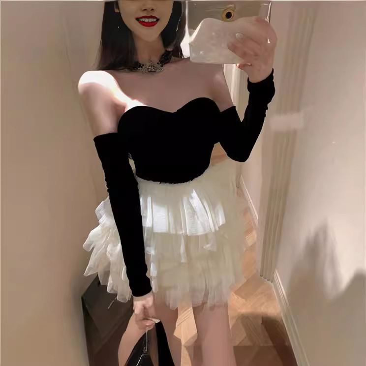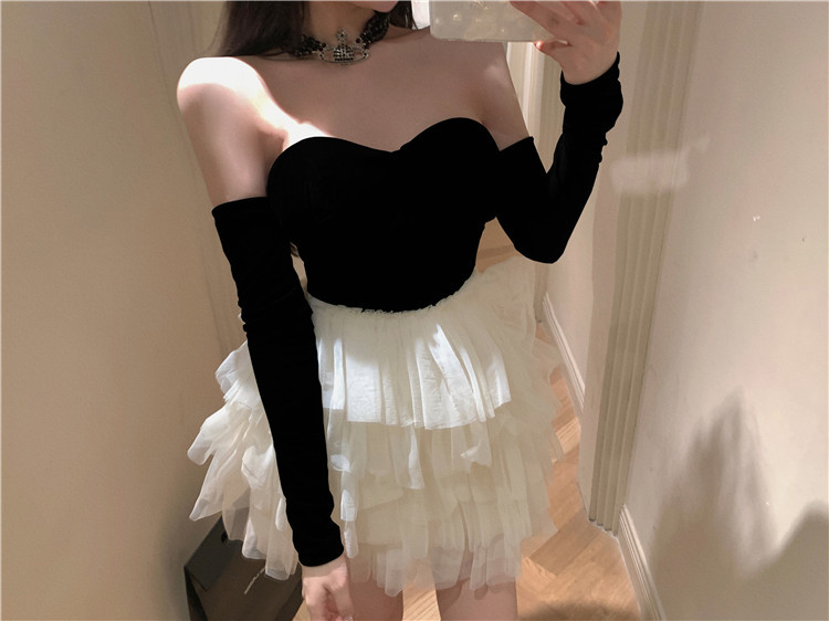 实拍现货高品质性感抹胸型高腰芭蕾舞风网纱拼接蛋糕裙短裙+袖套