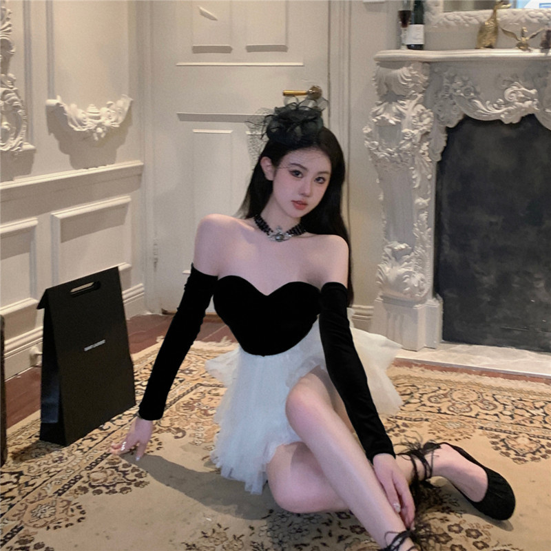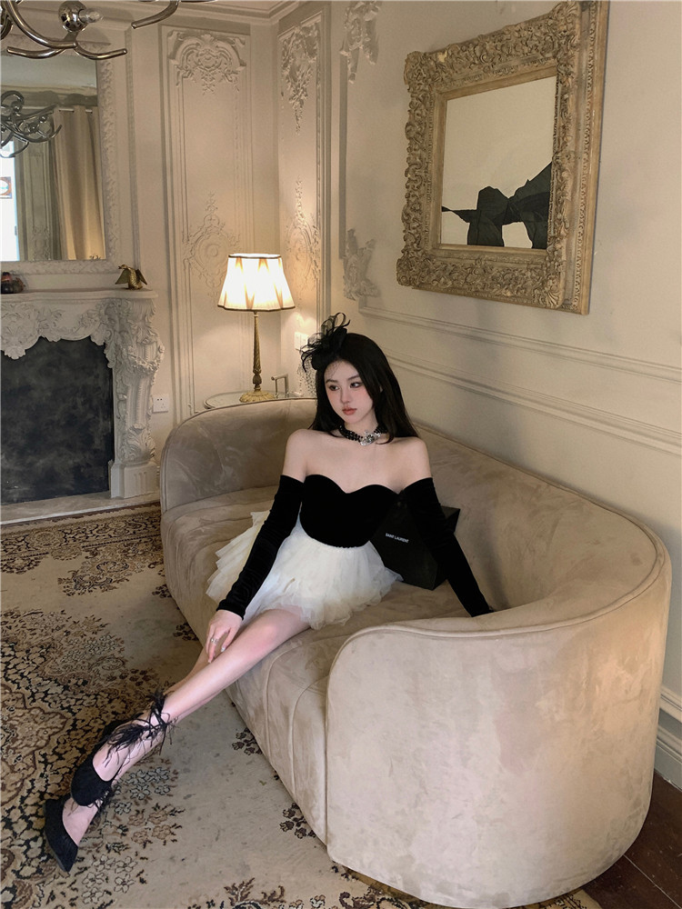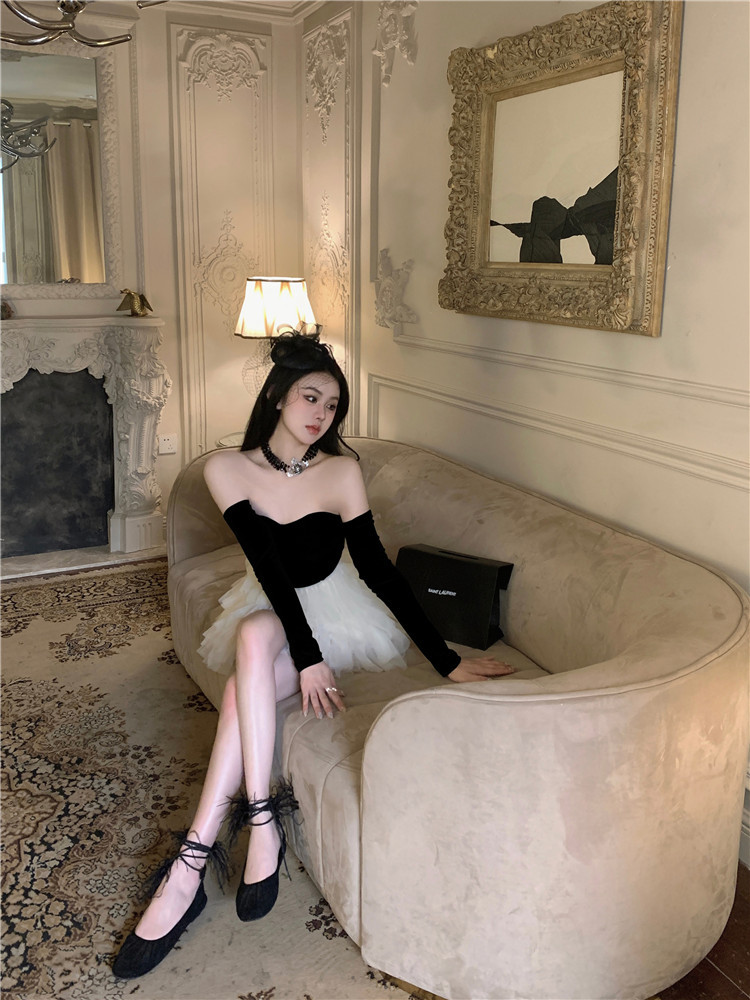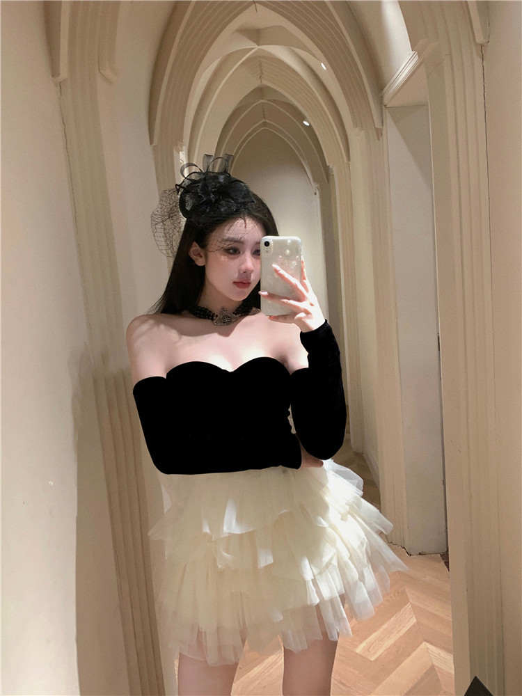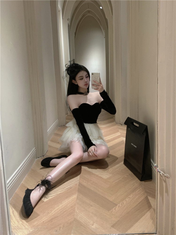 实拍现货高品质性感抹胸型高腰芭蕾舞风网纱拼接蛋糕裙短裙+袖套
