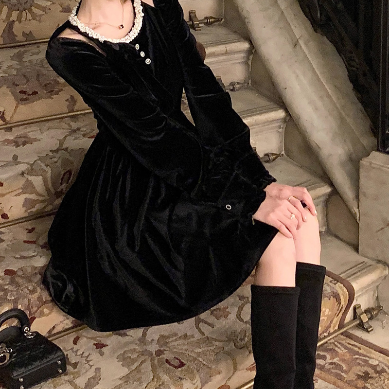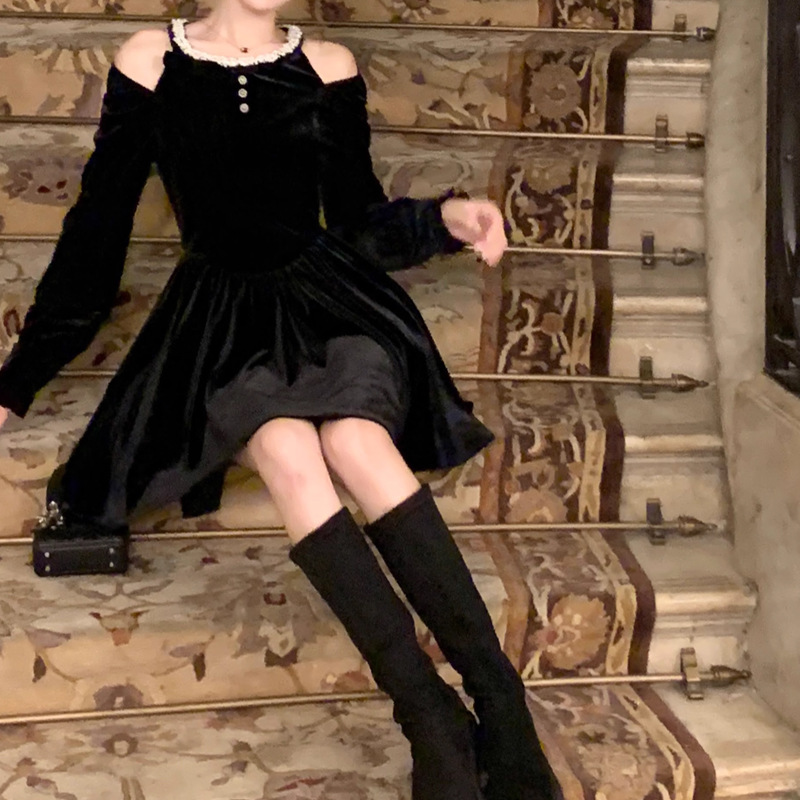 MEIPIN芭蕾舞会/法式千金小香风丝绒连衣裙秋miu系挂脖长袖小黑裙