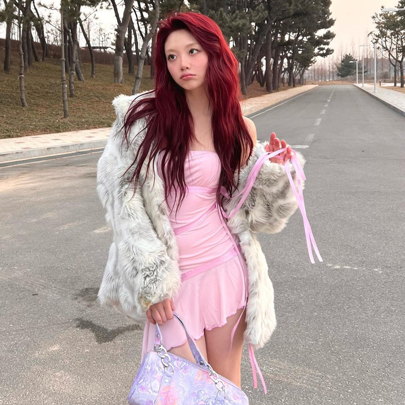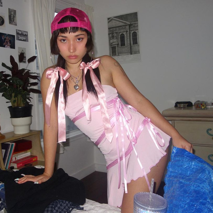 Gia粉色绸缎绑带不规则裙子摆丝带设计芭蕾舞风辣妹抹胸连衣裙ins