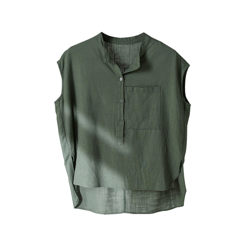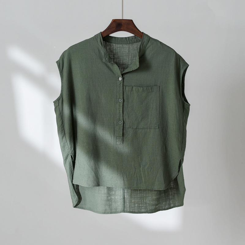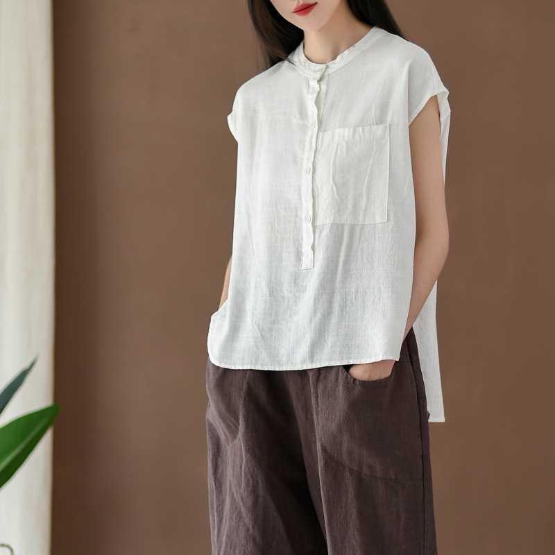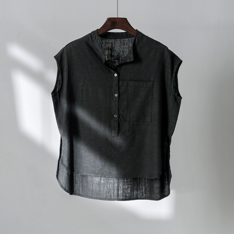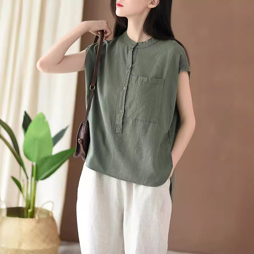 2024夏季棉麻女装新款文艺宽松立领亚麻上衣女式短袖衬衫T恤