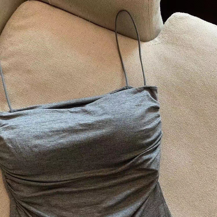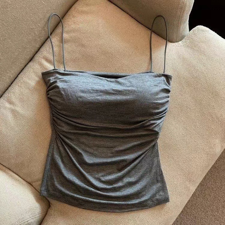 纯欲细肩带辣妹褶皱小吊带背心女带胸垫裹胸甜辣无袖外穿显瘦上衣