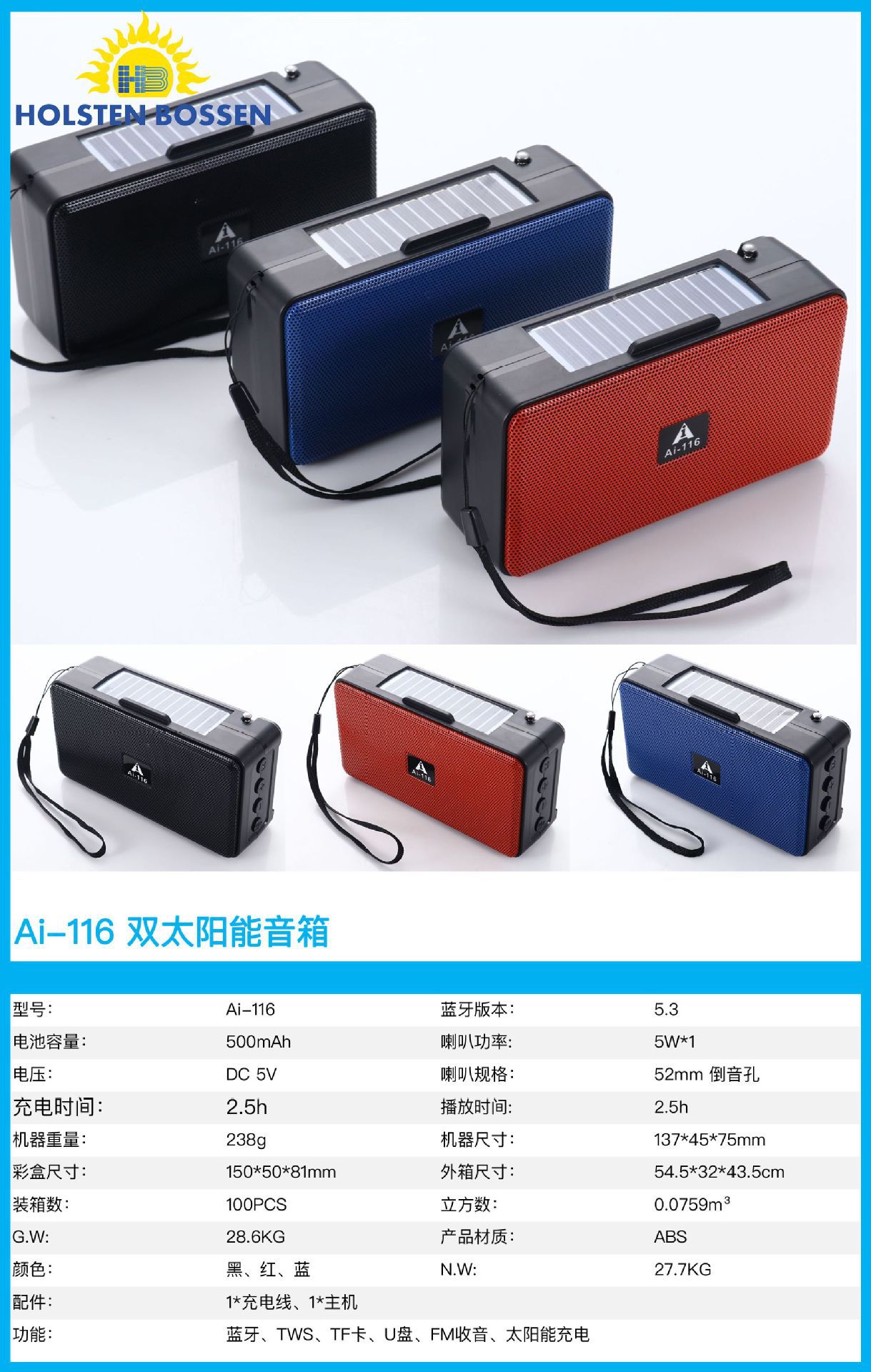 Ai-116双太阳能音箱 FM收音机无线蓝牙小音响大音量3d环绕低音炮