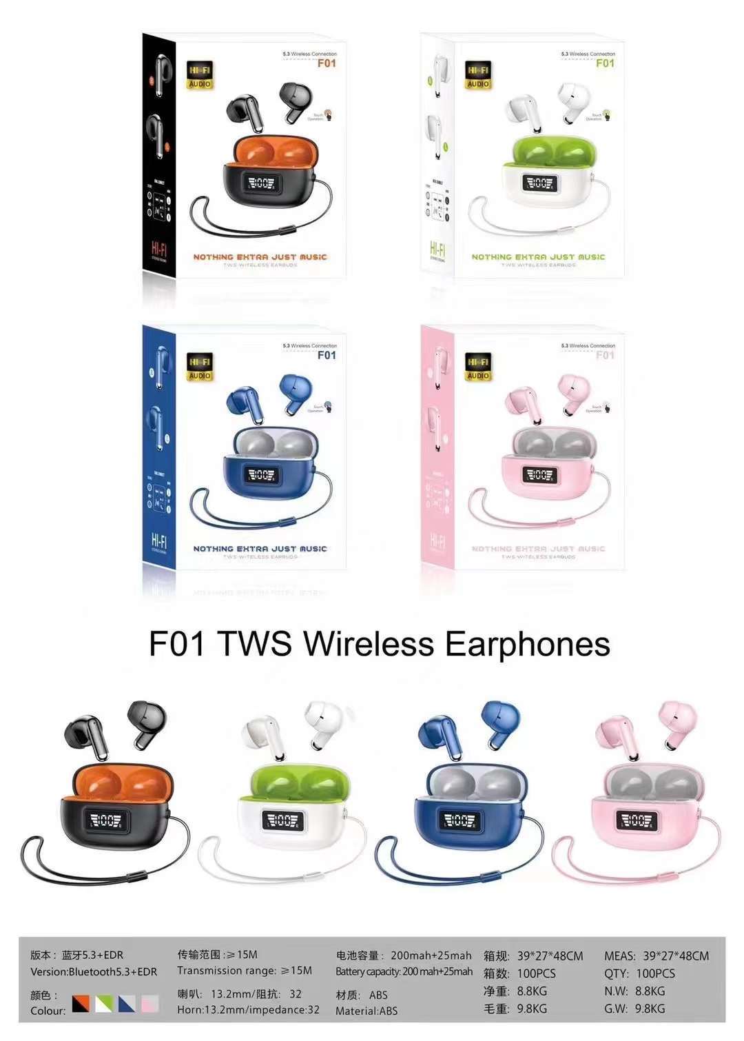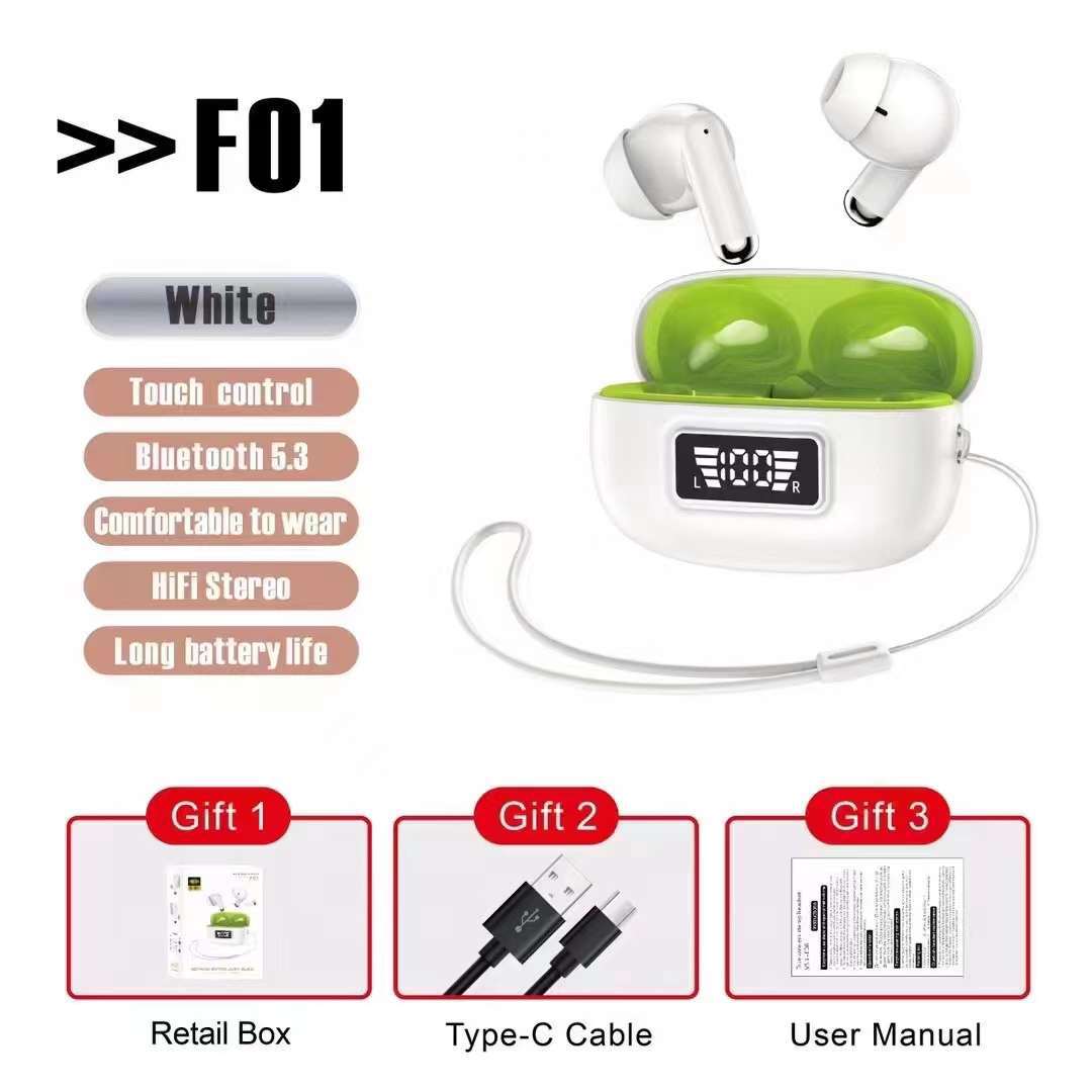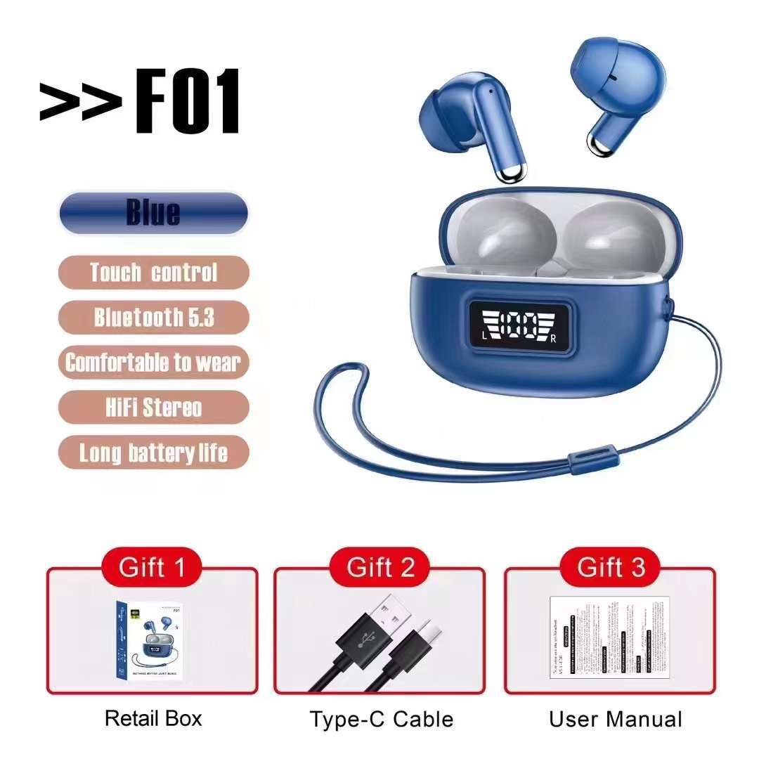 跨境新款 F01无线蓝牙耳机 5.3低延迟长续航TWS 智能数显运动耳机