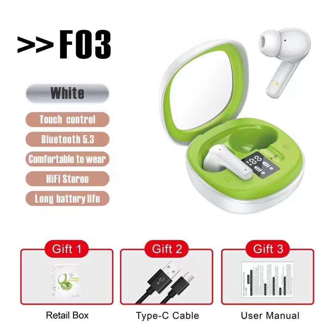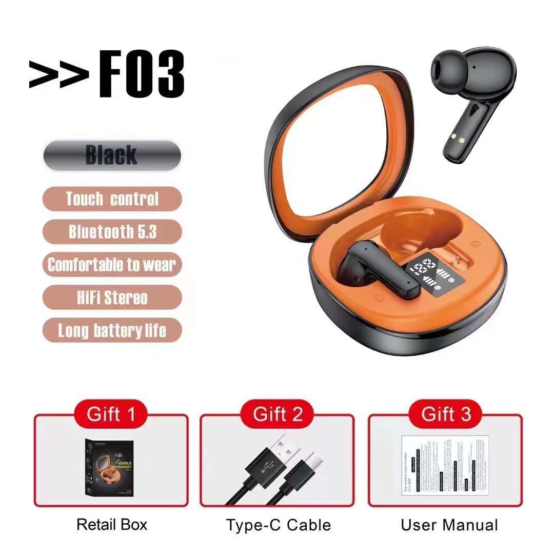 跨境新款F03无线蓝牙耳机5.3透明太空舱运动耳机低延迟长续航TWS