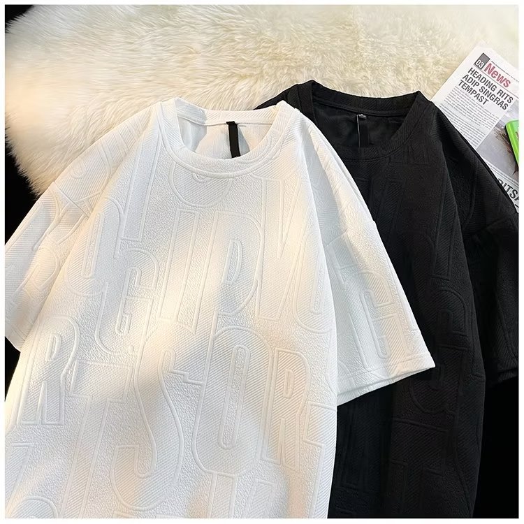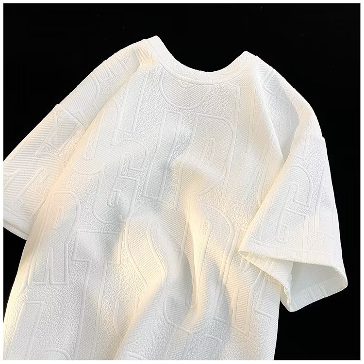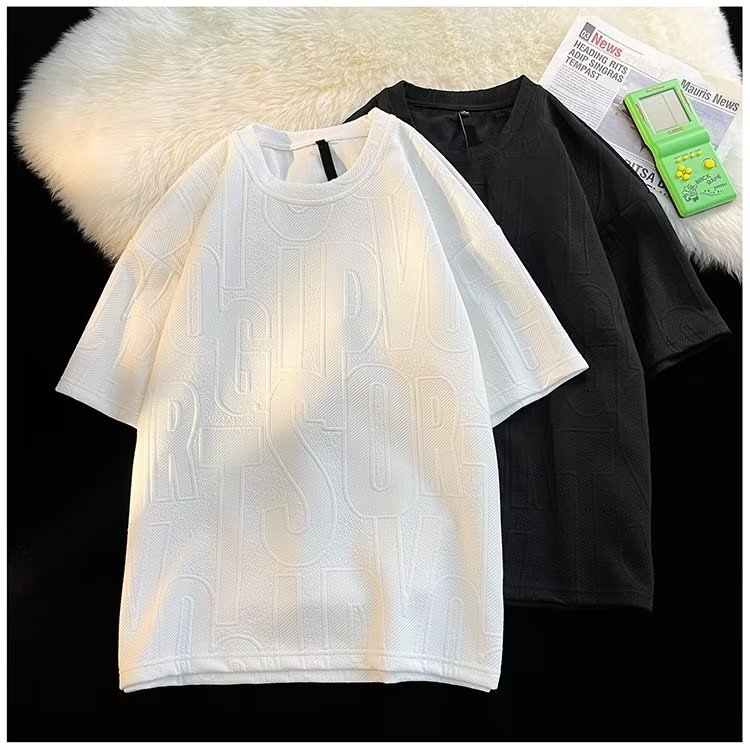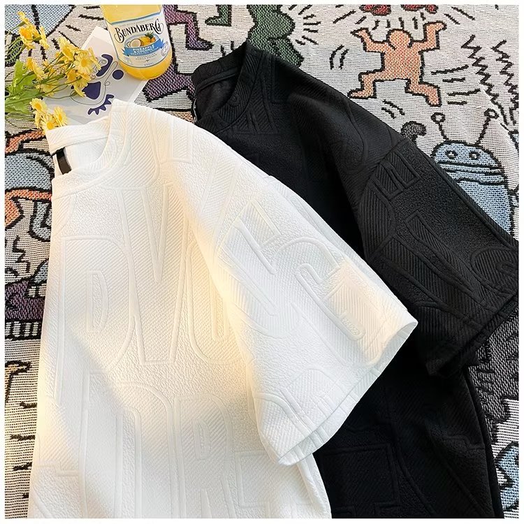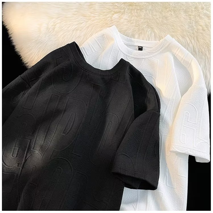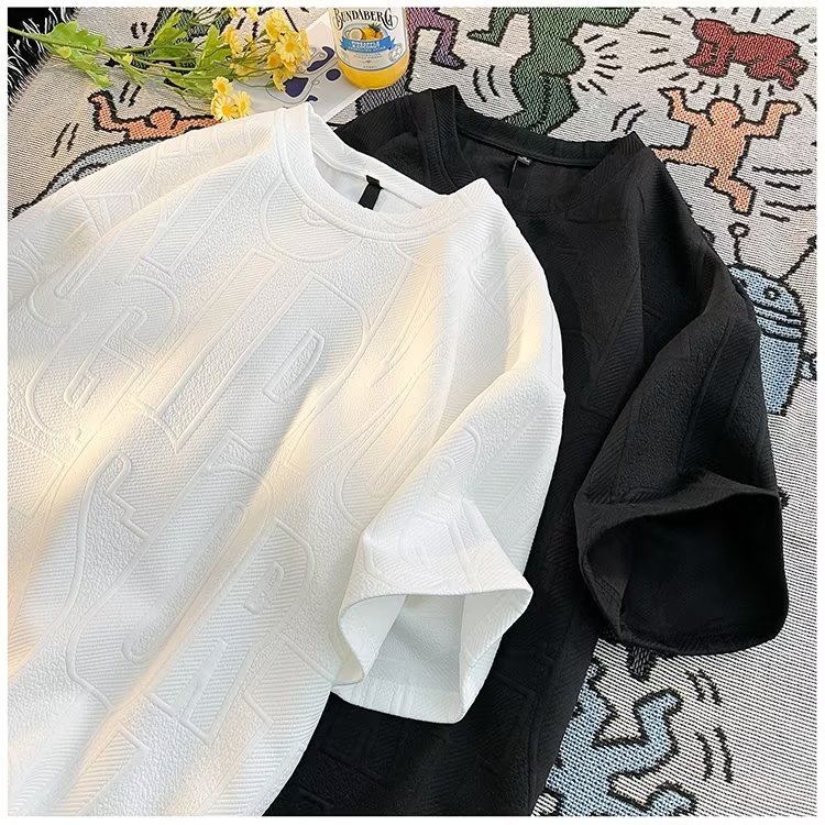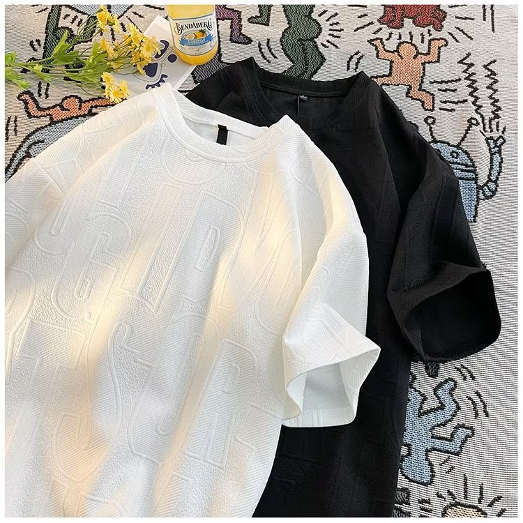 美式高街立体提花短袖t恤男2023夏季宽松潮牌休闲复古ins五分半袖