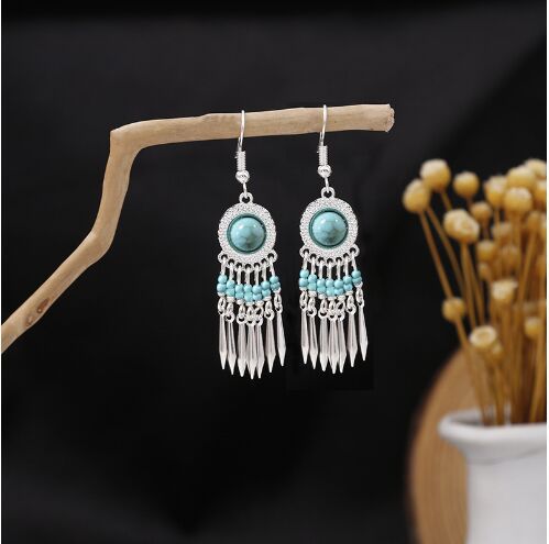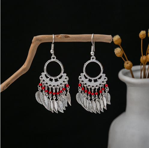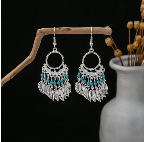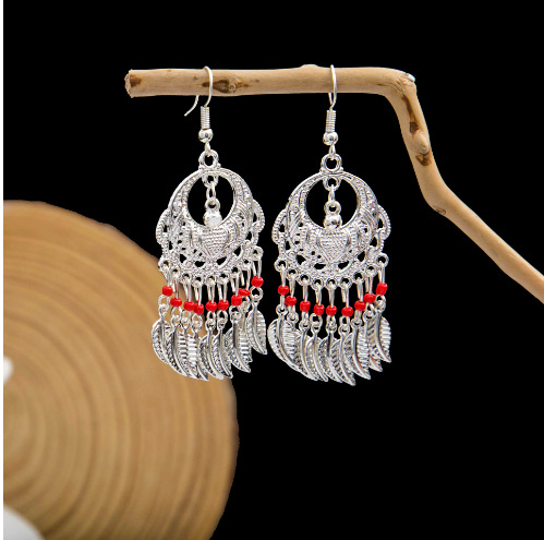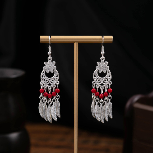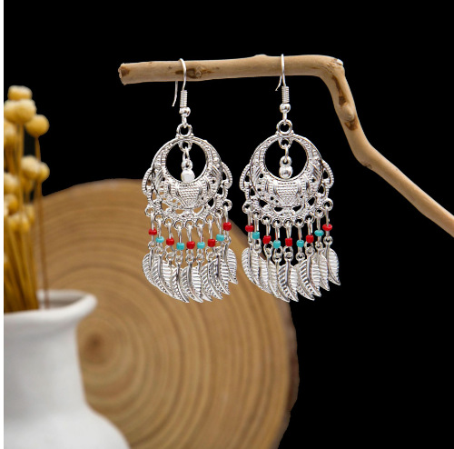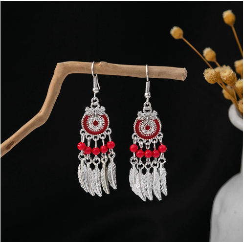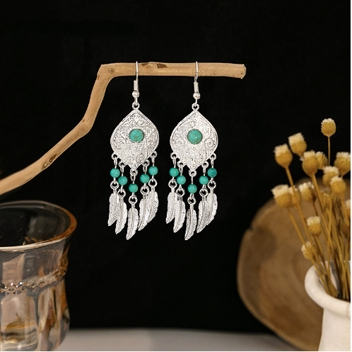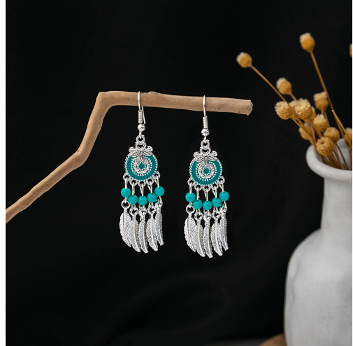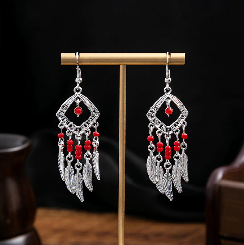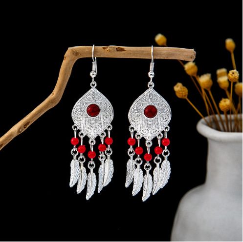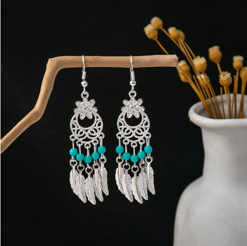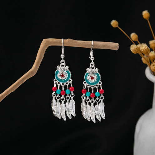 民族风仿银耳环 彩色长款羽毛流苏耳坠波西米亚景点热卖耳饰批发