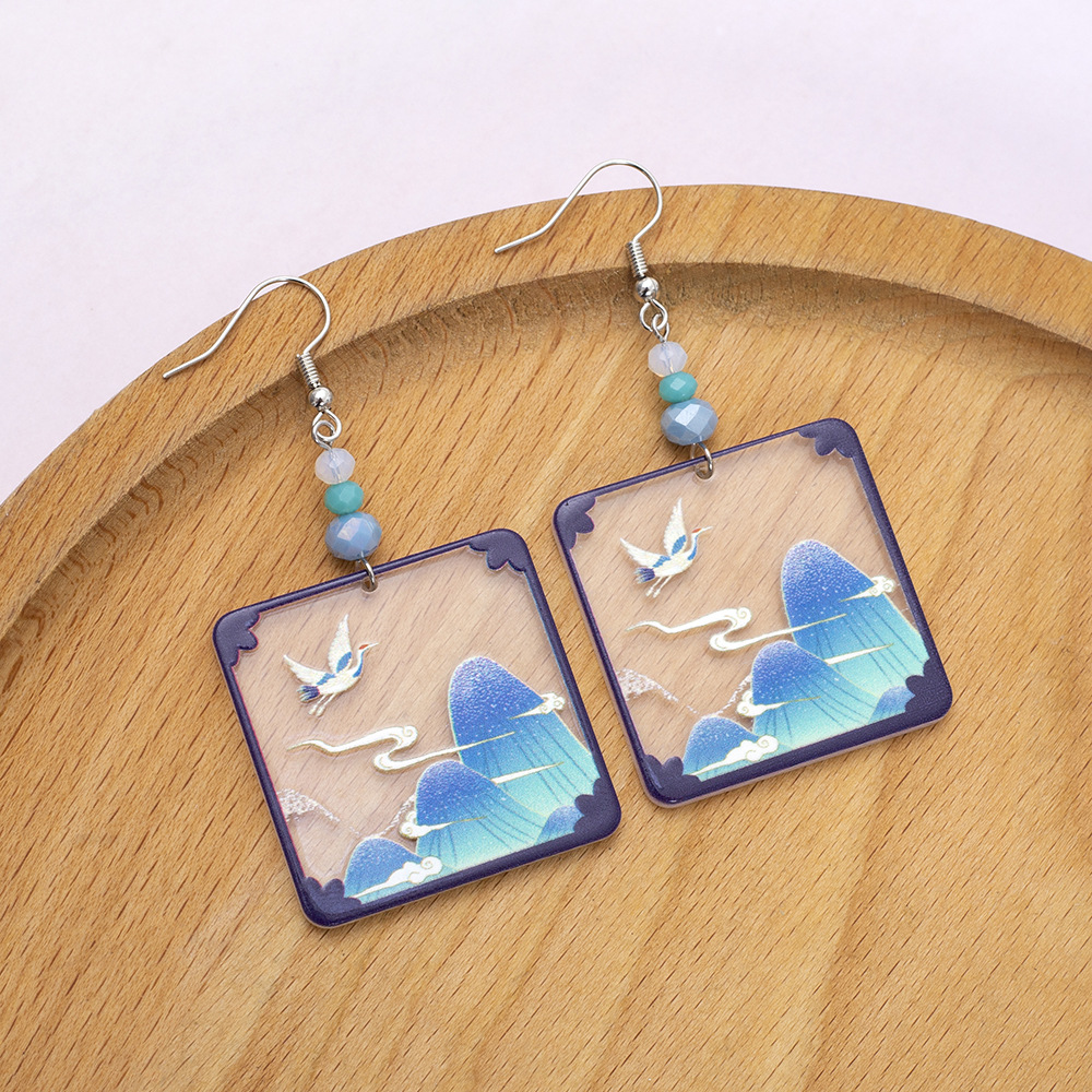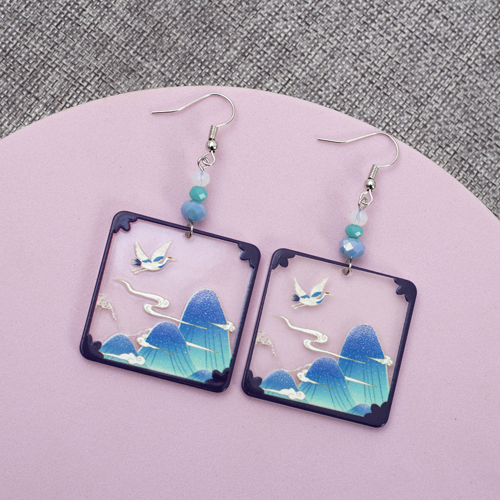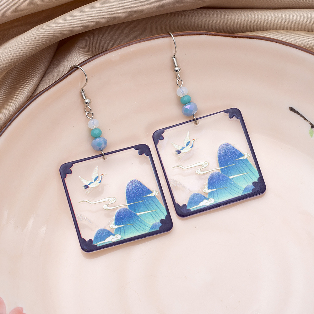 清新时尚国风山水画仙气设计感女士几何方形透明亚克力耳环气质