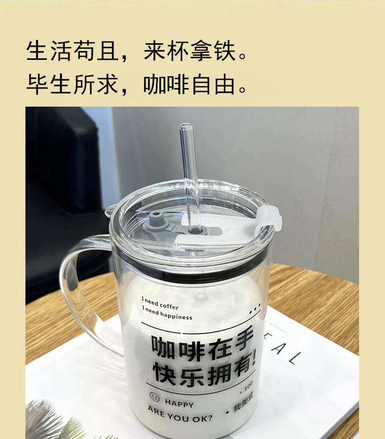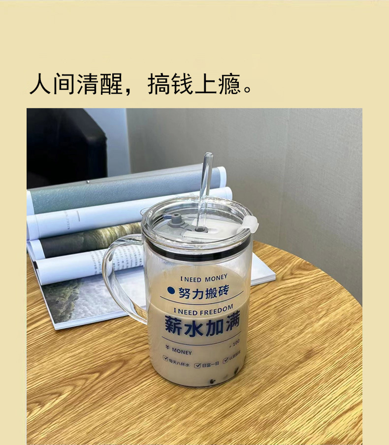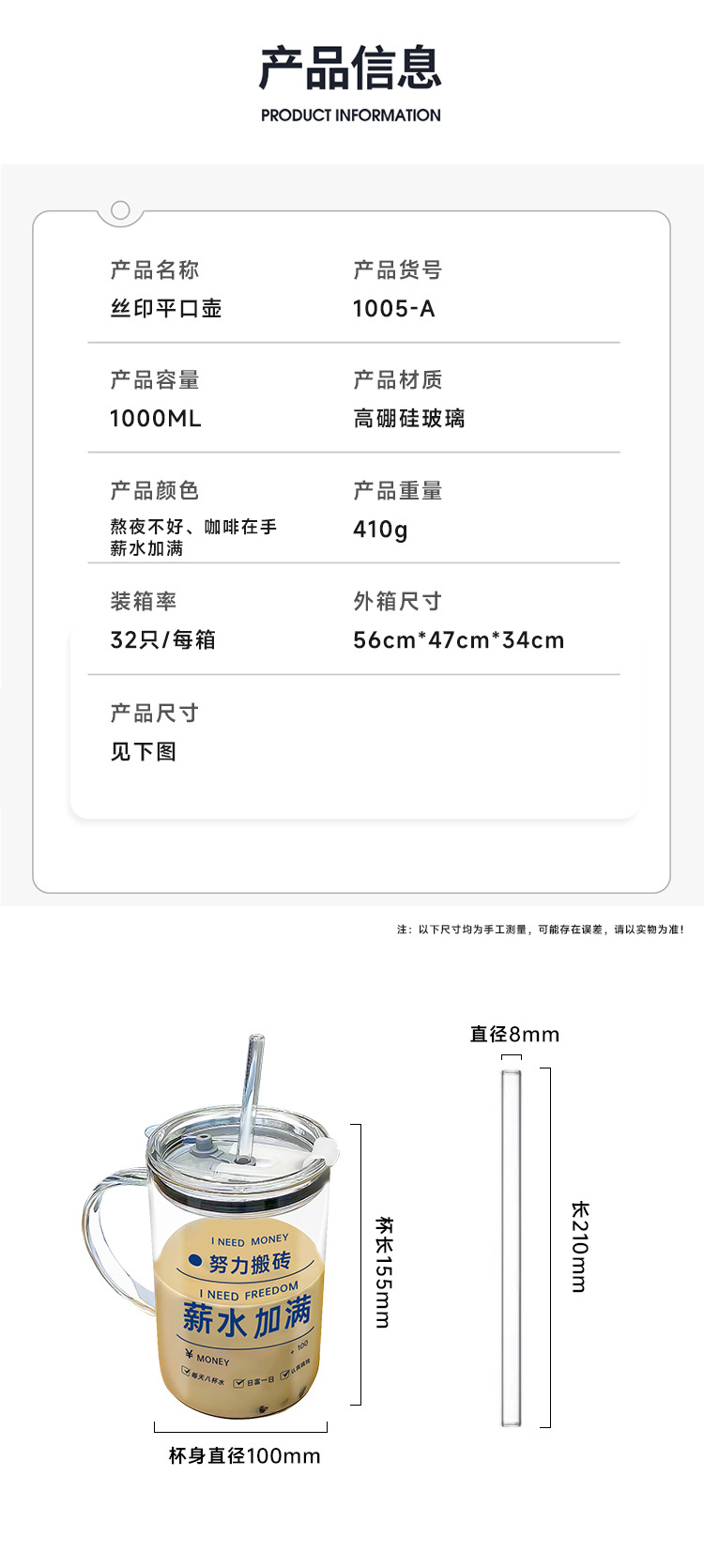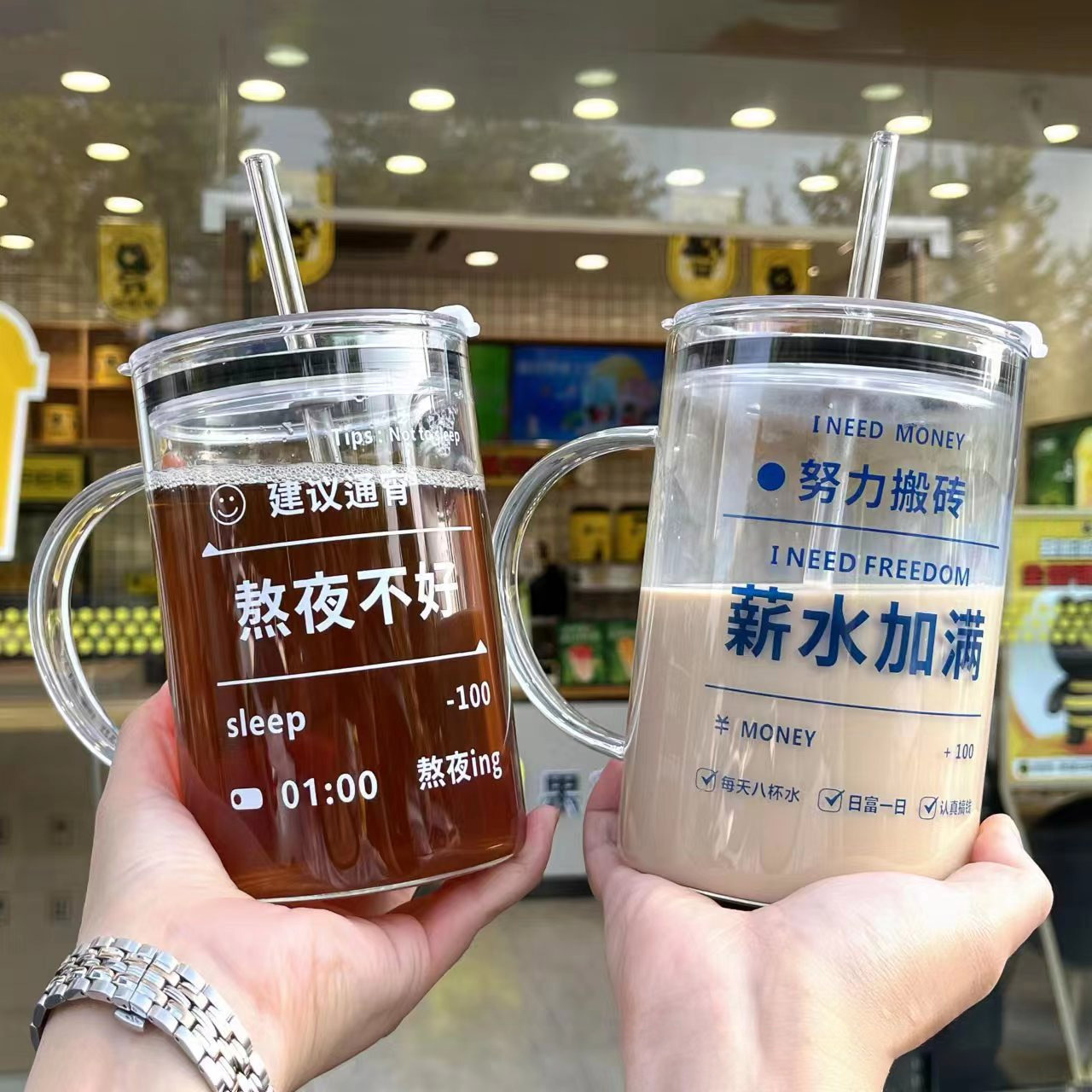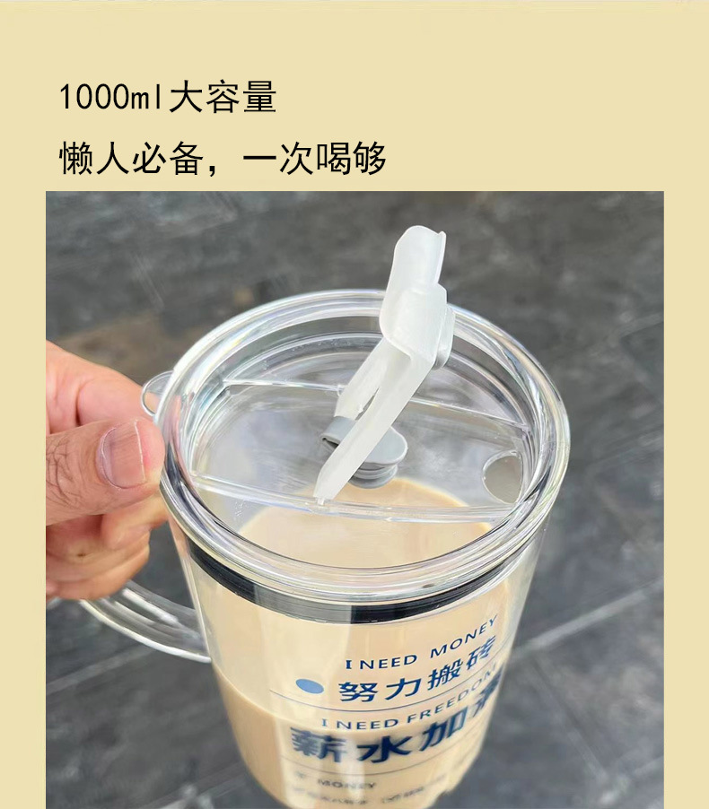 1000ml大容量办公室把手女生吸管杯奶茶杯咖啡杯耐高温网红玻璃杯