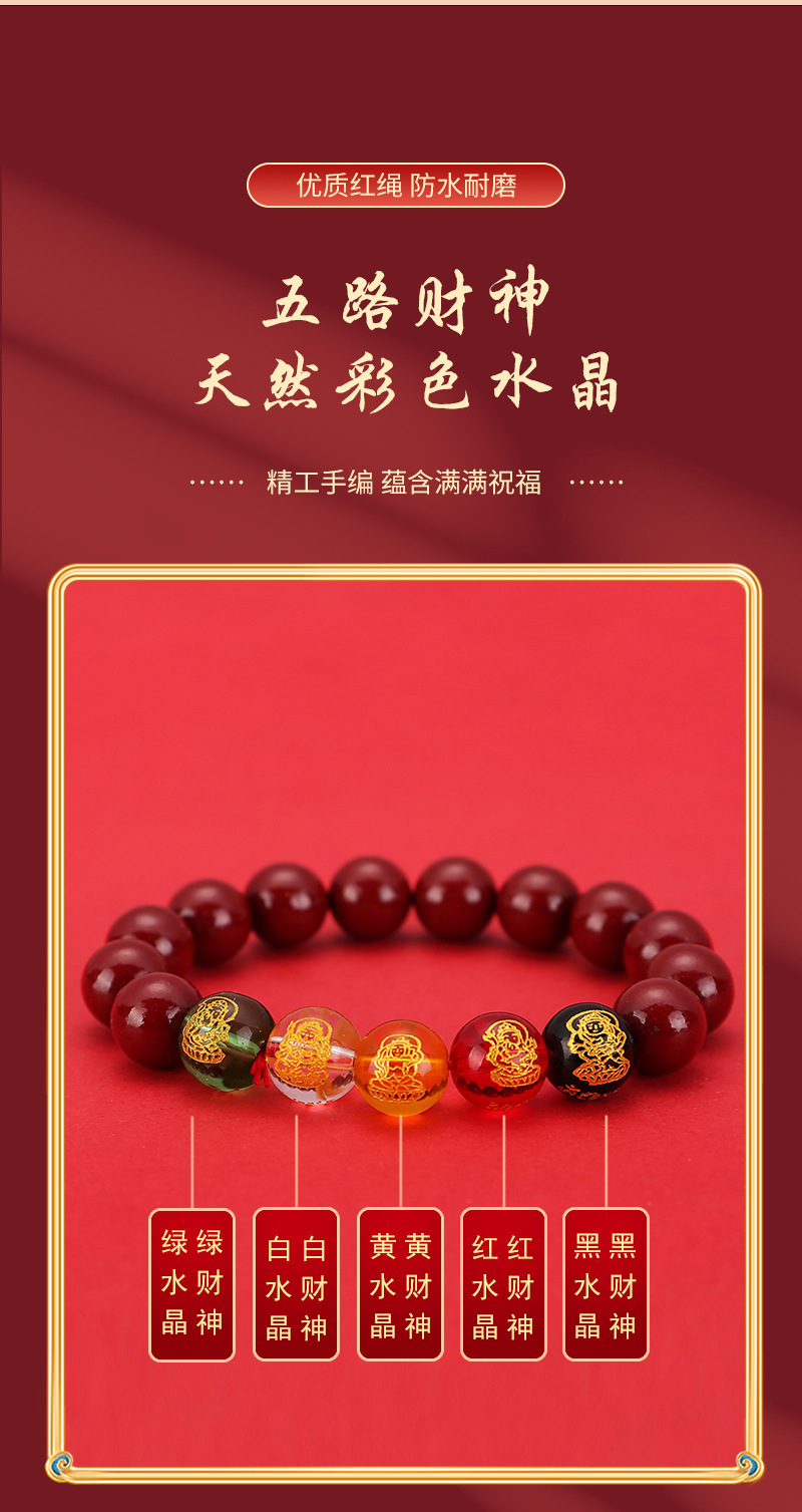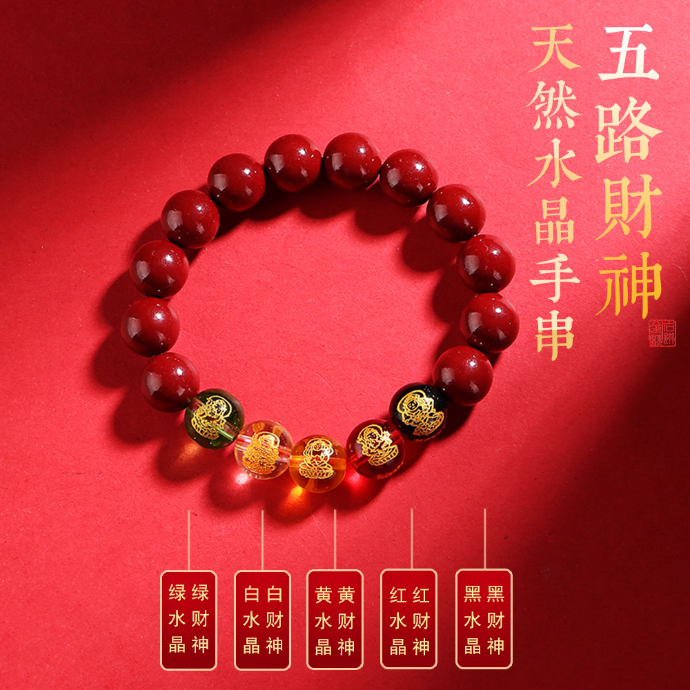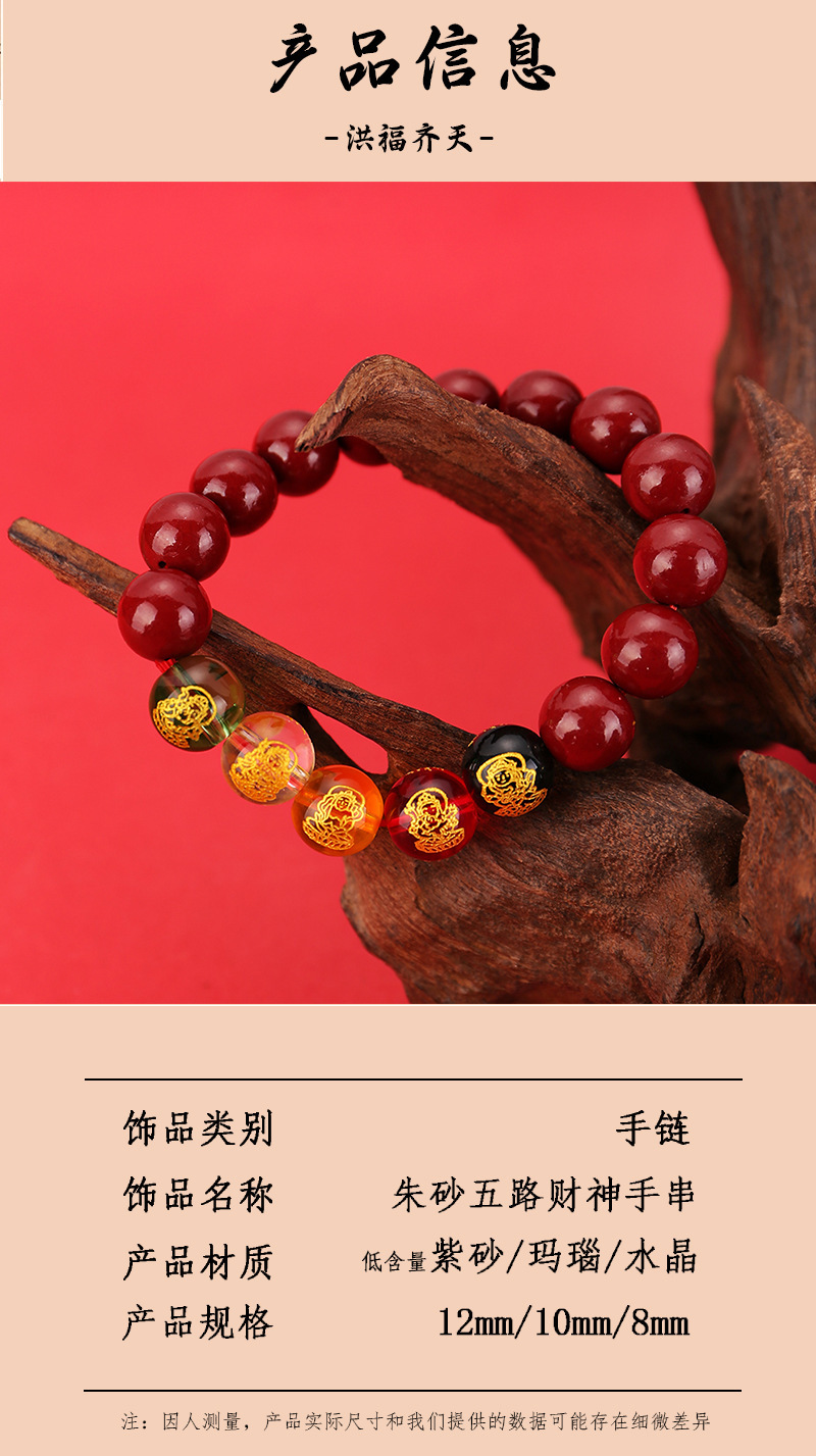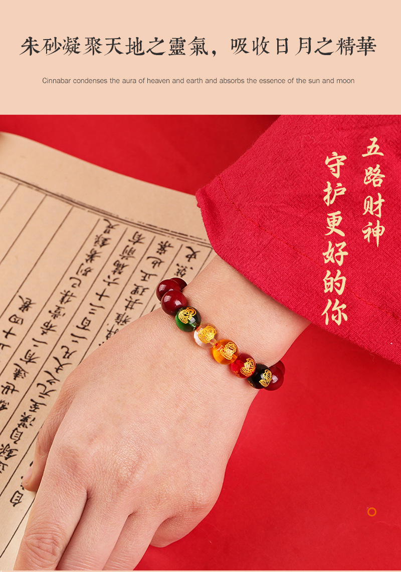 2024龙年8mm五路财神朱砂手链男女款紫金砂五色水晶手串批发代发