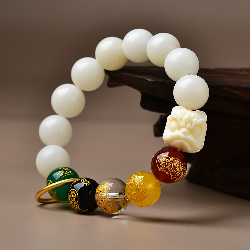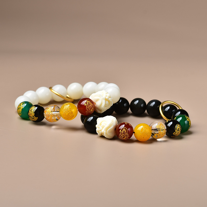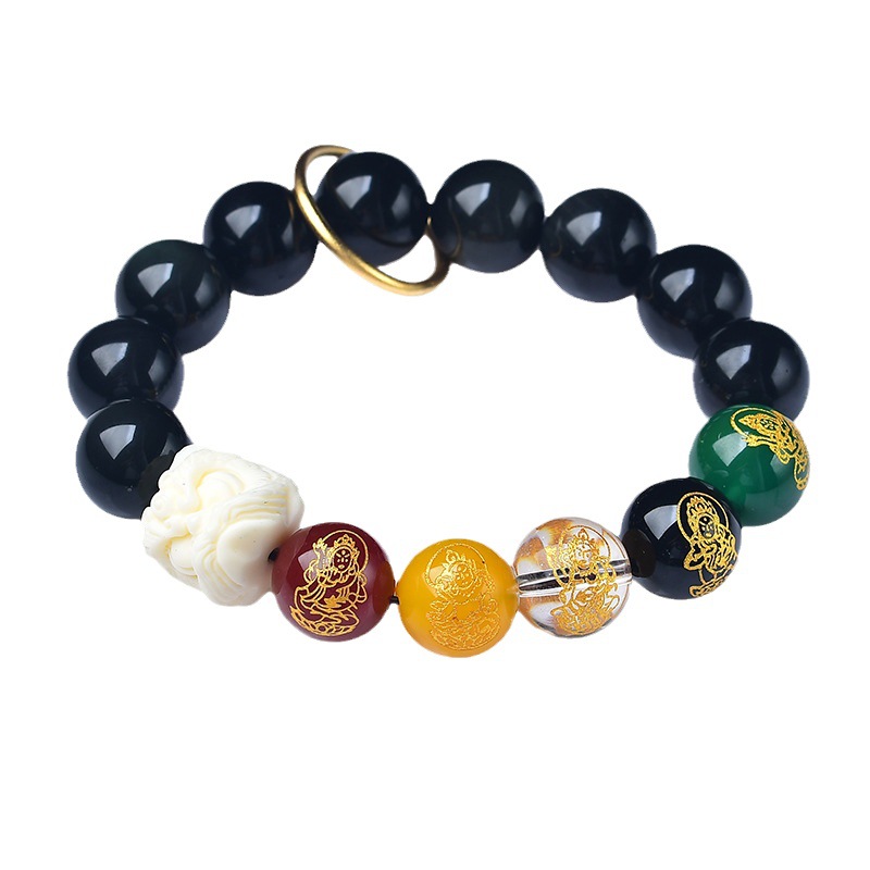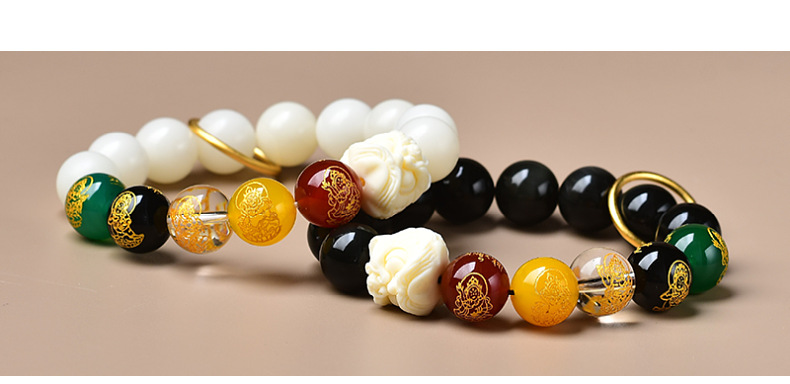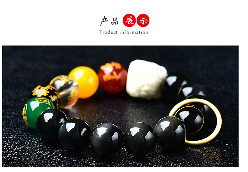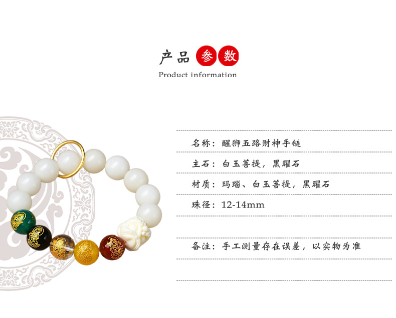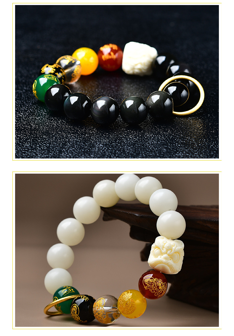 天然黑曜石五路财神手链雕刻醒狮手串白玉菩提手链男女士文玩手链