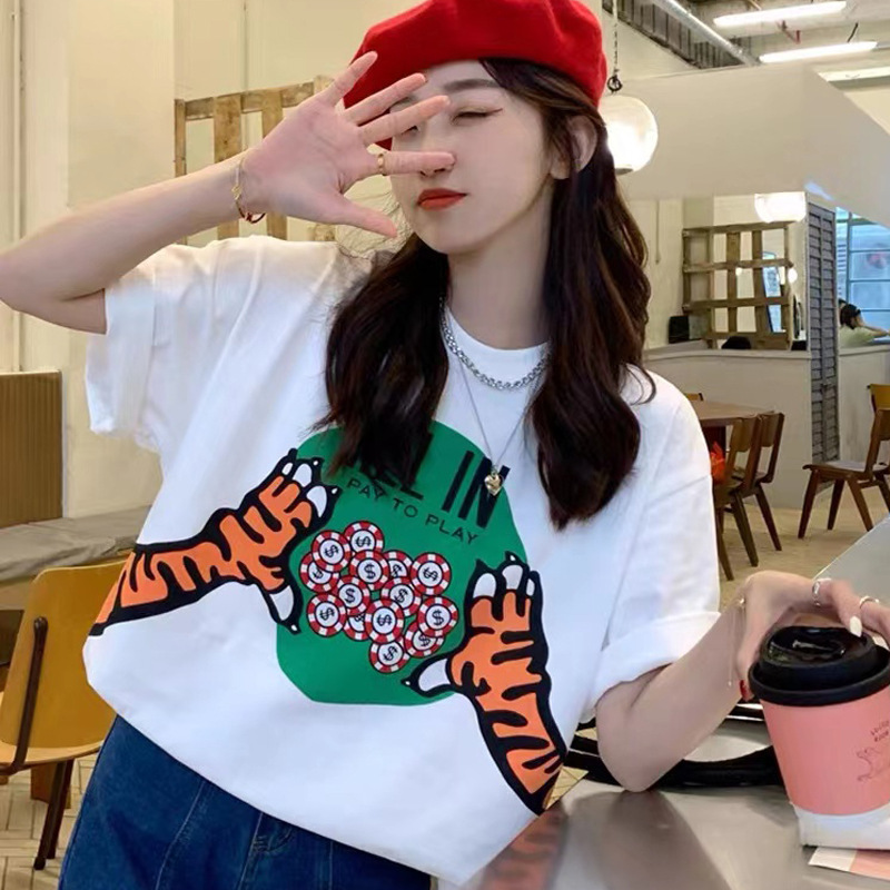 韩国ins夏季纯棉短袖T恤女圆领宽松白色宽松百搭卡通印花体恤上衣
