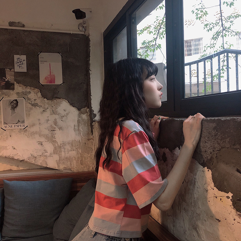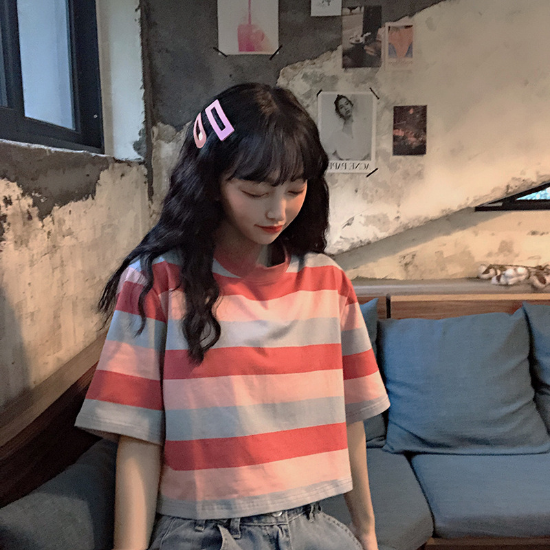 跨境外贸夏季新款韩版宽松彩虹条纹短袖T恤女学生短款露脐上衣 潮