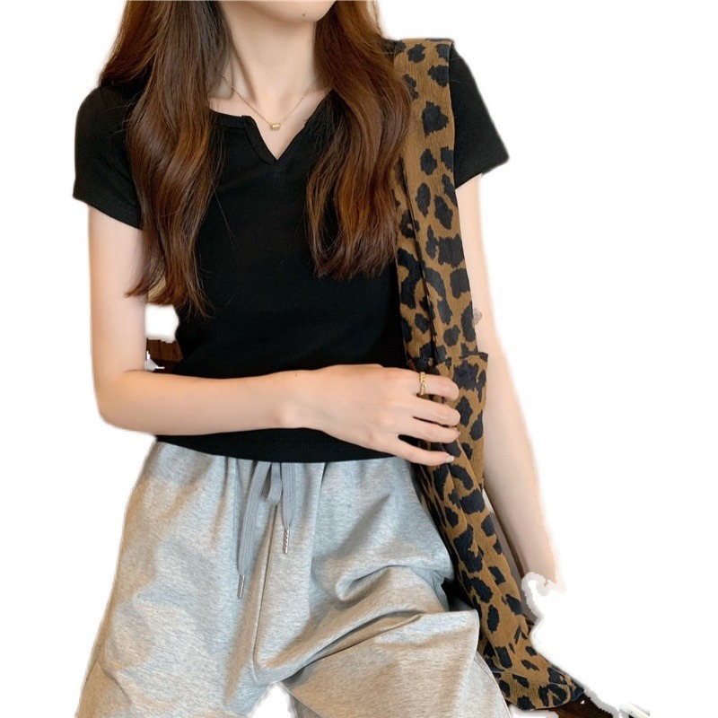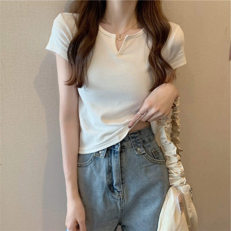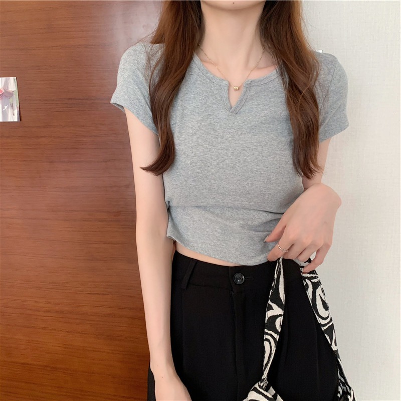 夏季露脐纯色短袖T恤女性感外贸女装潮小V领短款设计感修身上衣女