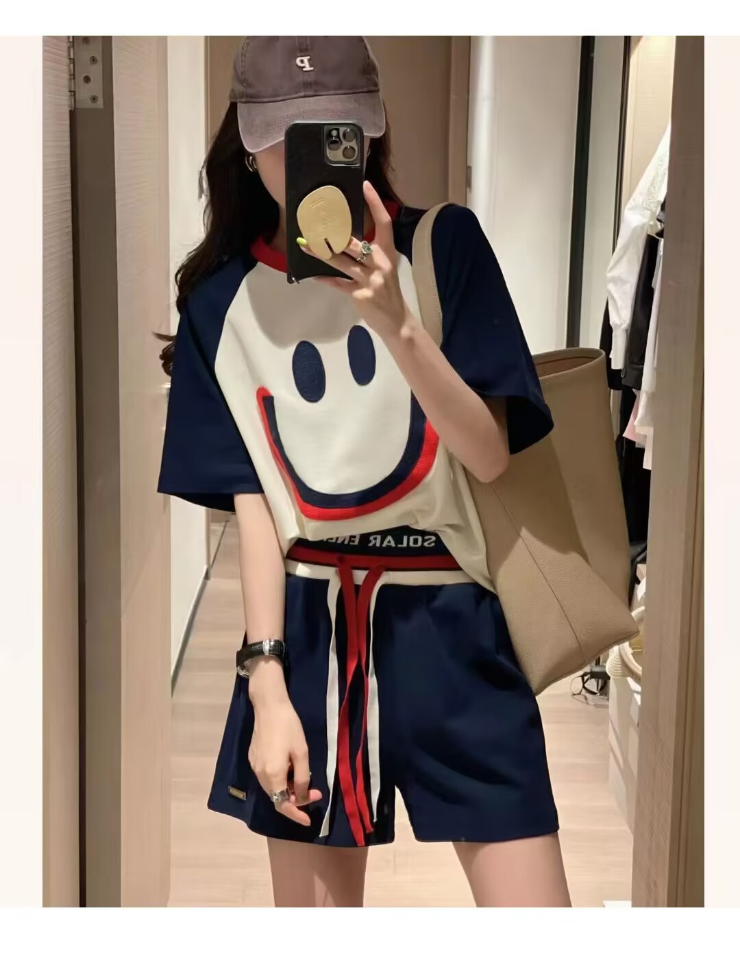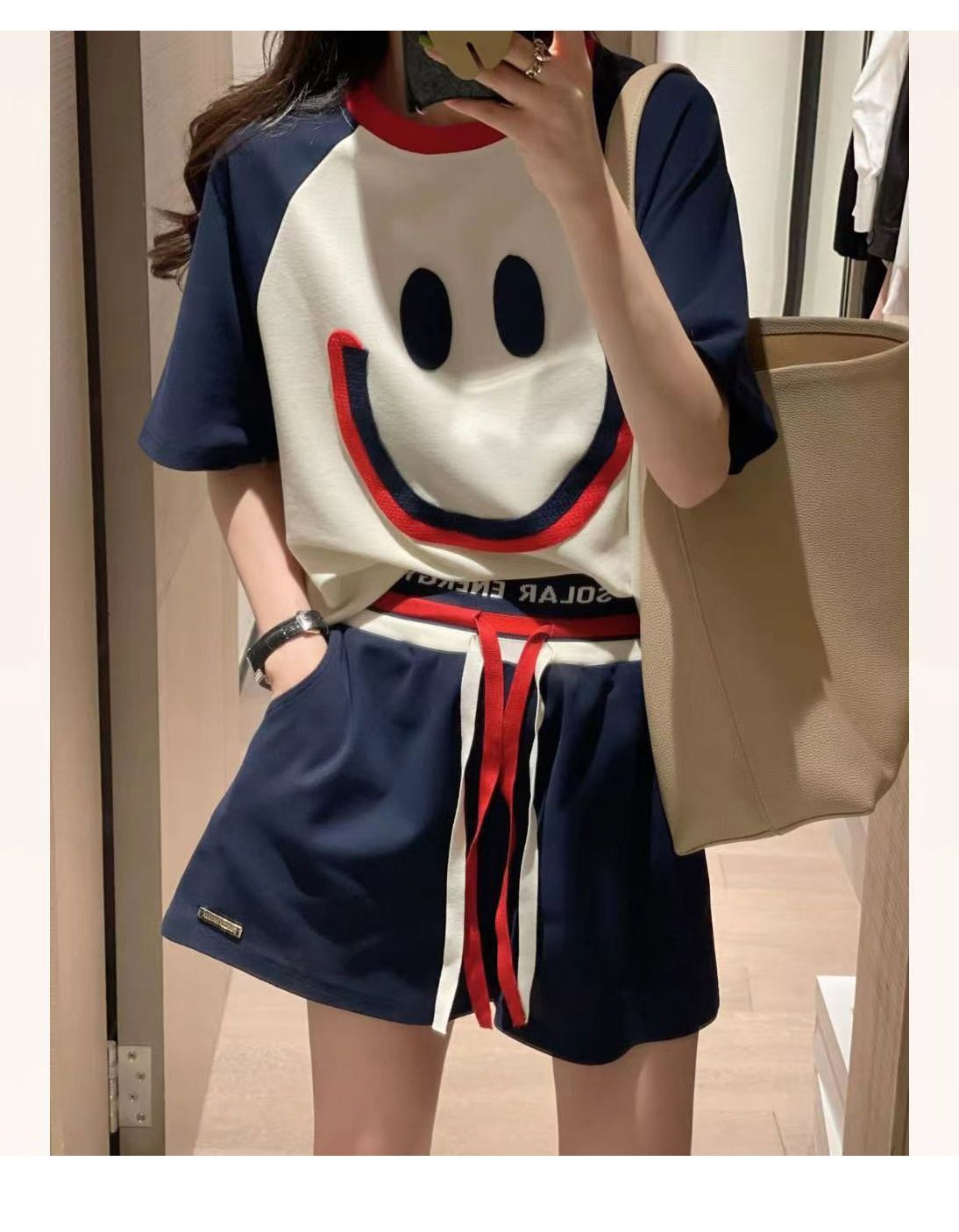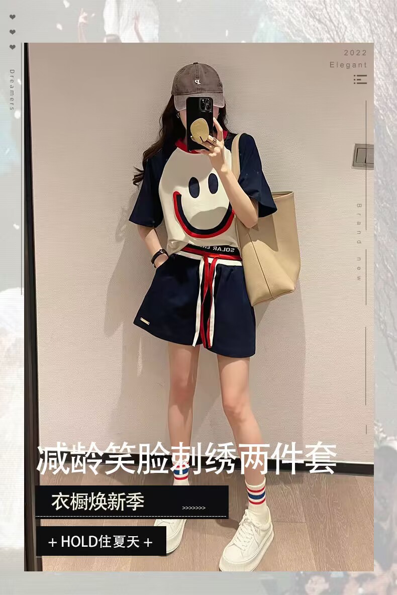 200斤大码笑脸刺绣运动套装女2024夏新款宽松休闲短袖短裤两件套