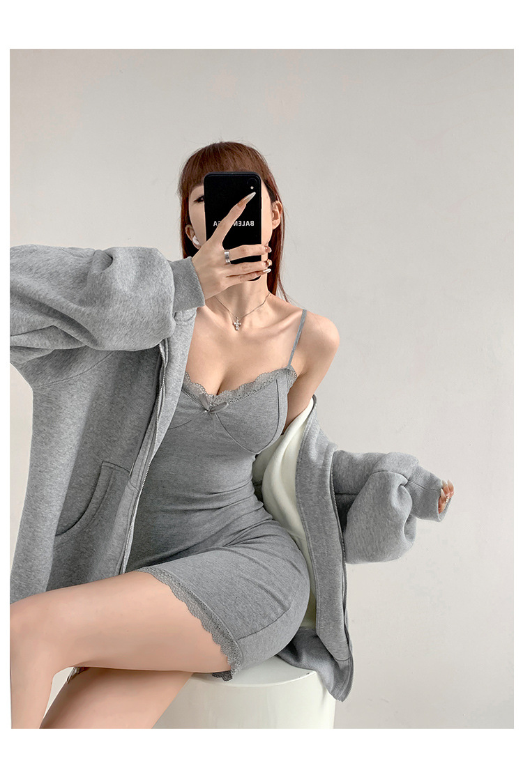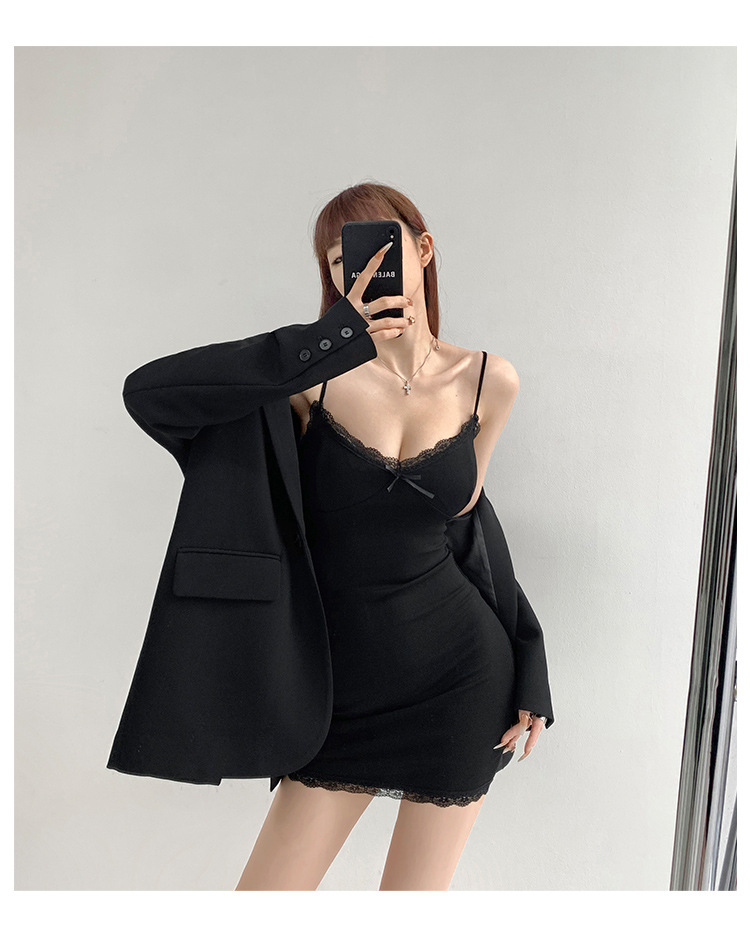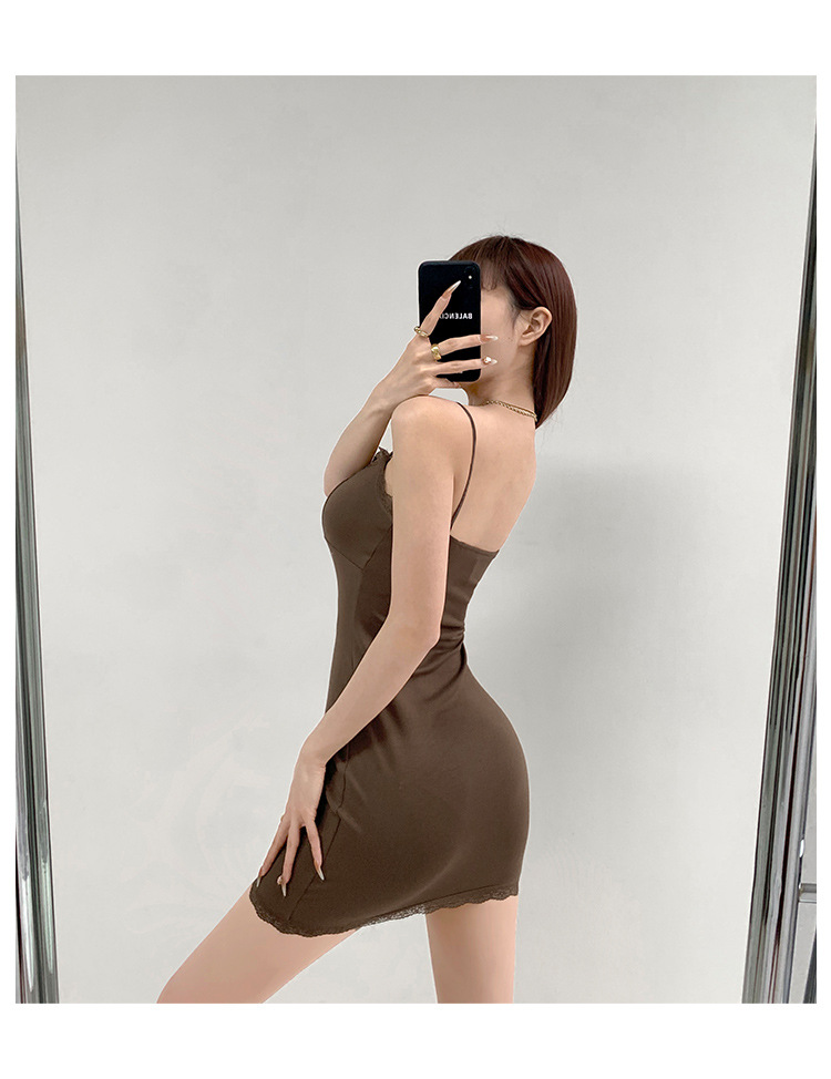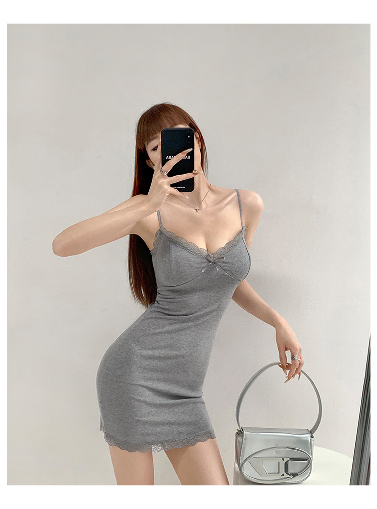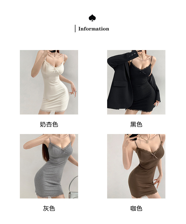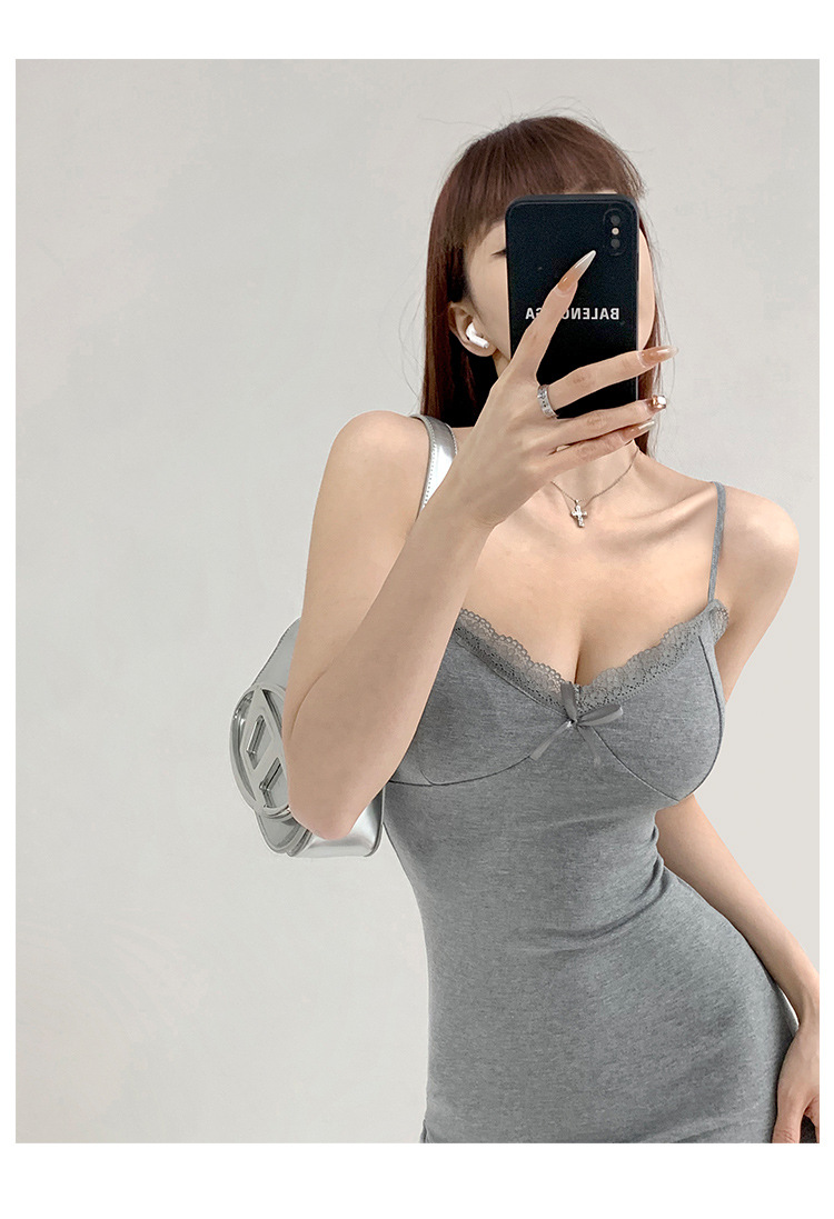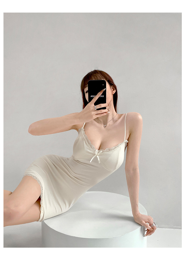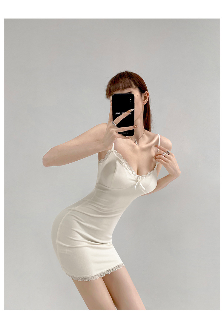 纯欲蕾丝边性感收腰吊带裙女包臀无袖连衣裙法式带胸垫打底短裙