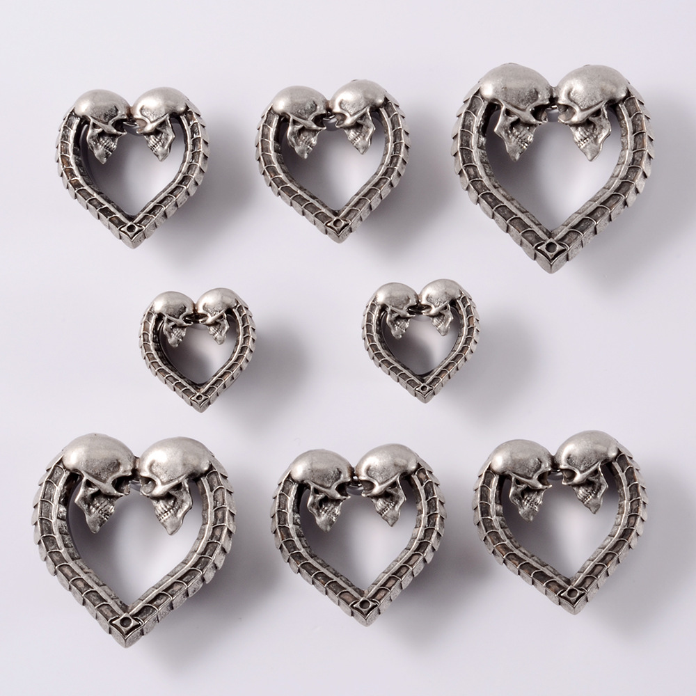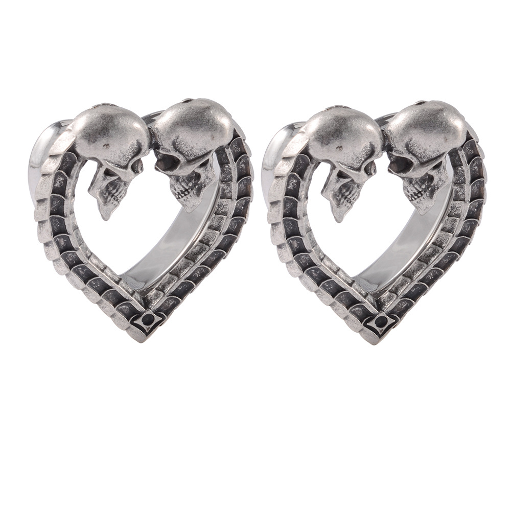 .名称:跨境一体式心形空心喇叭耳廓不锈钢古银色骷髅头骨纹耳扩穿刺耳环