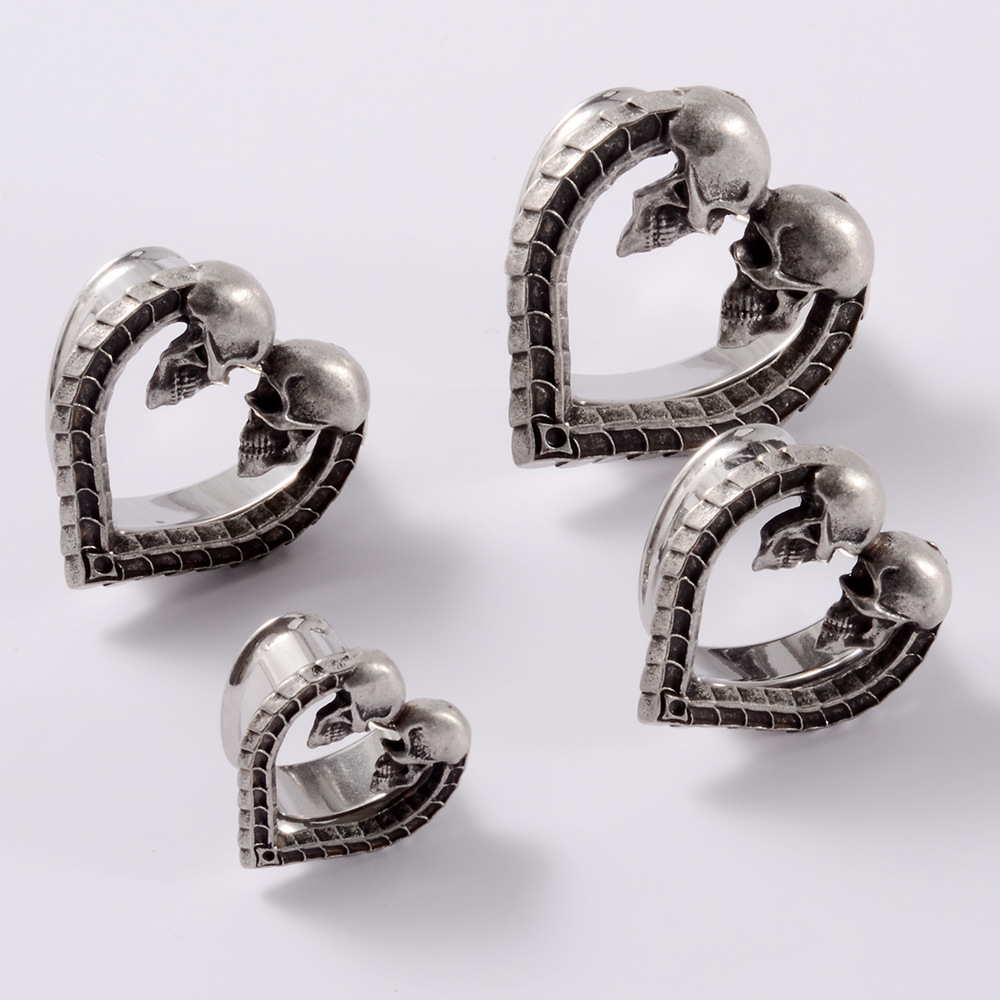 跨境一体式心形空心喇叭耳廓不锈钢古银色骷髅头骨纹耳扩穿刺耳环