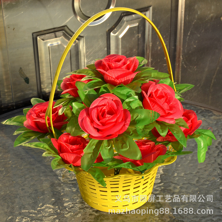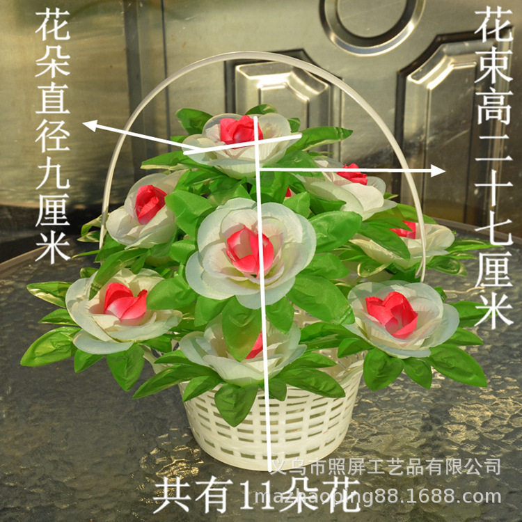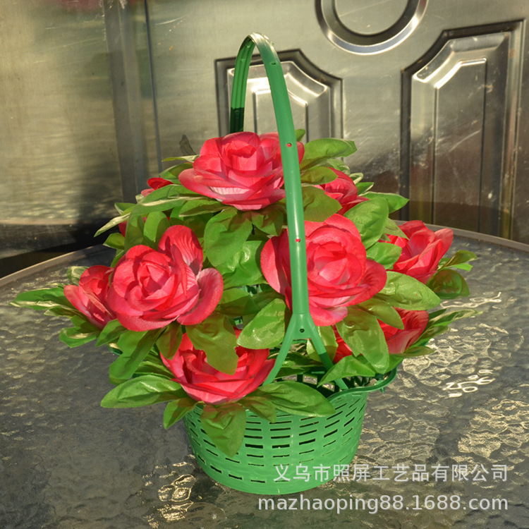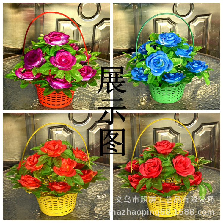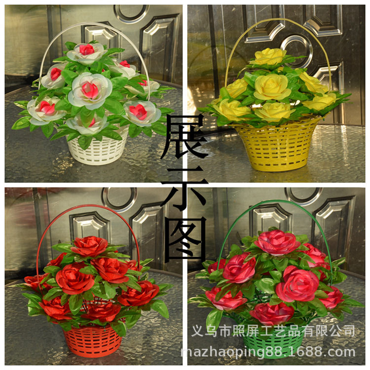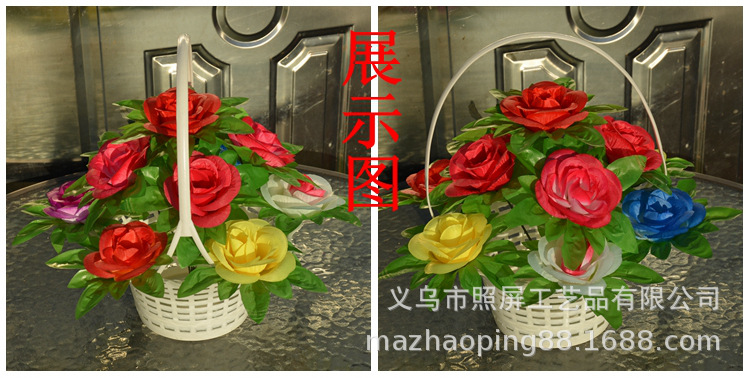 厂家批发的清明节绢花祭祀玫瑰花篮11头仿真假花七彩玫瑰套装花篮