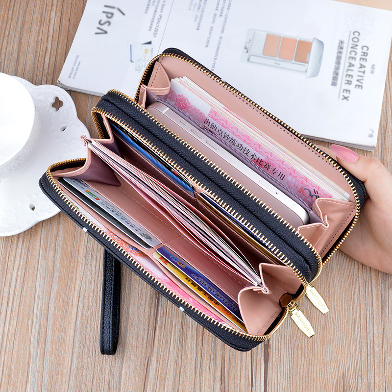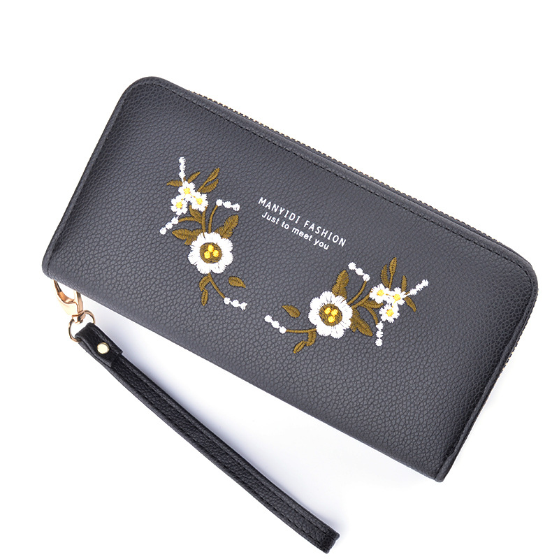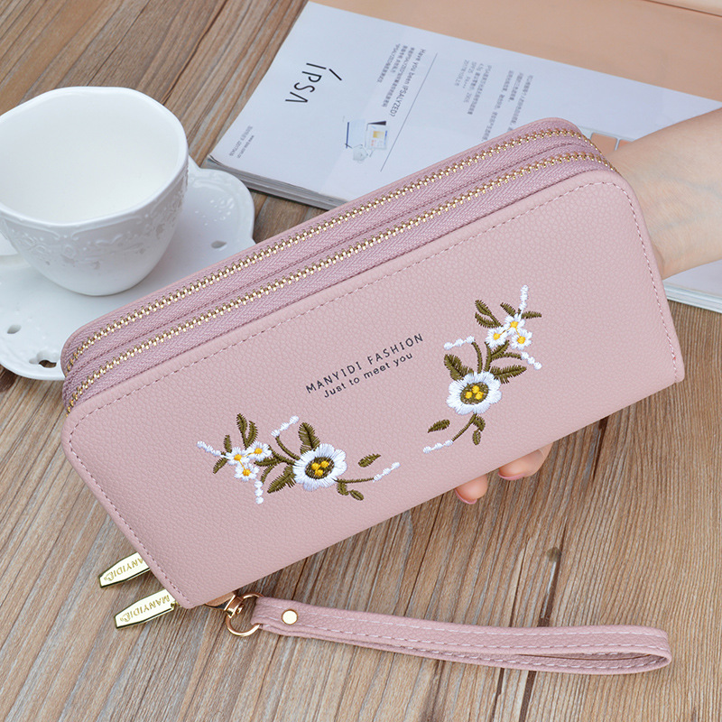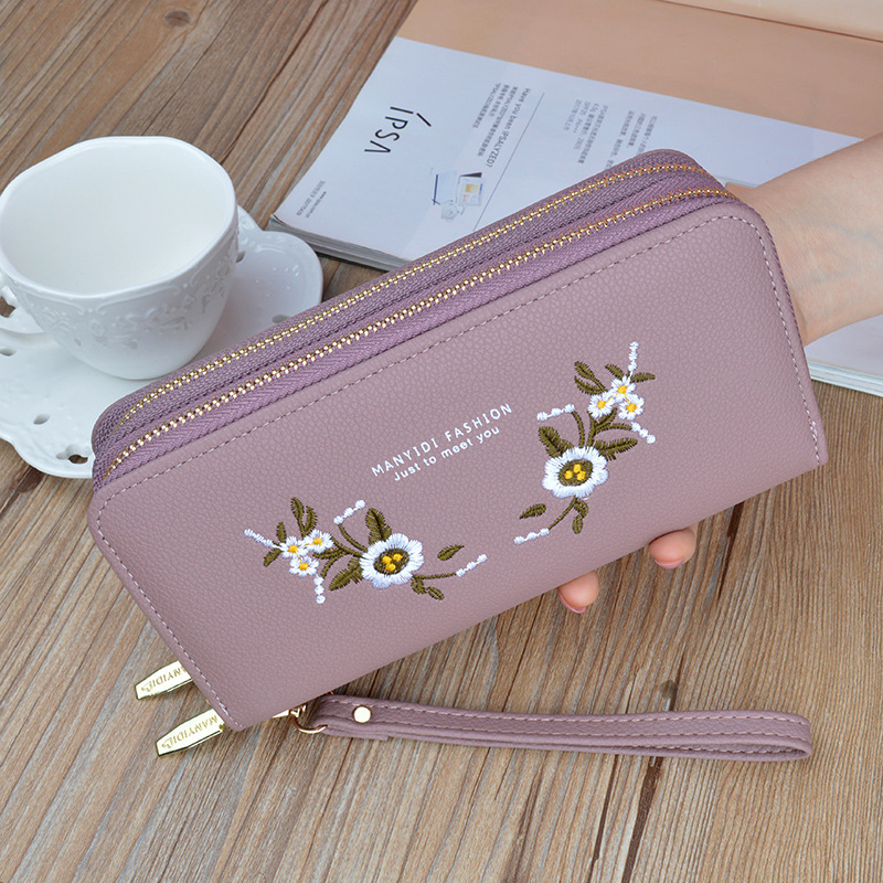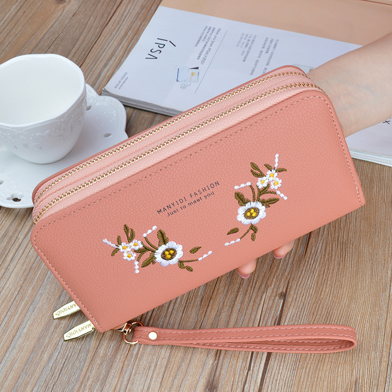 新款钱包女士长款双拉链手拿包时尚绣花大容量双层软皮钱夹手机包