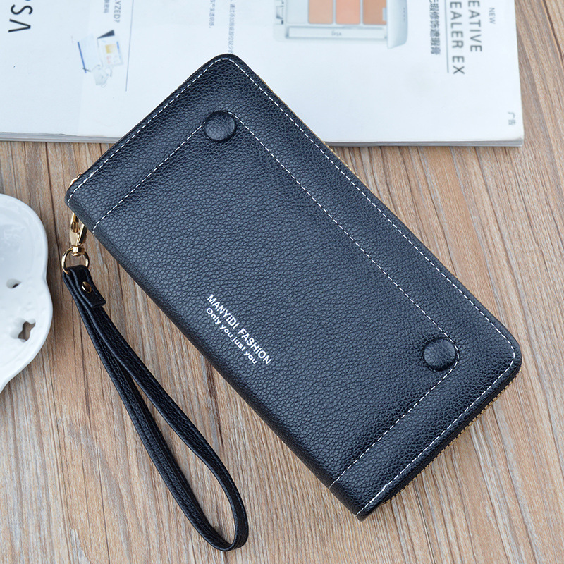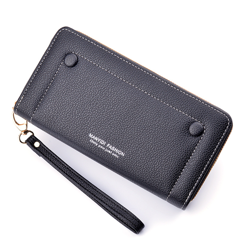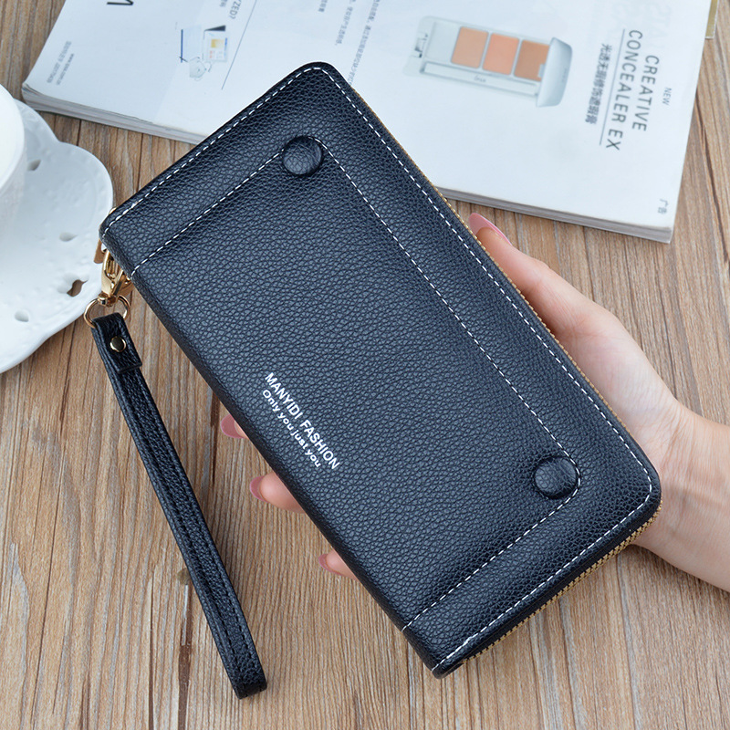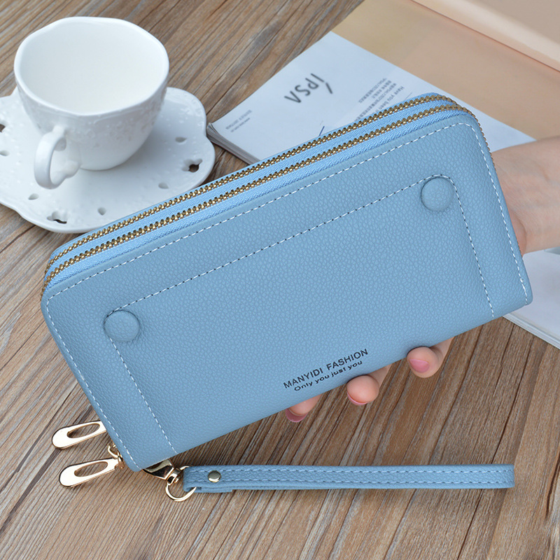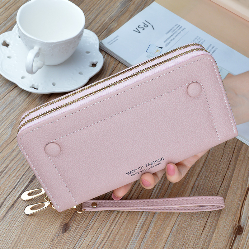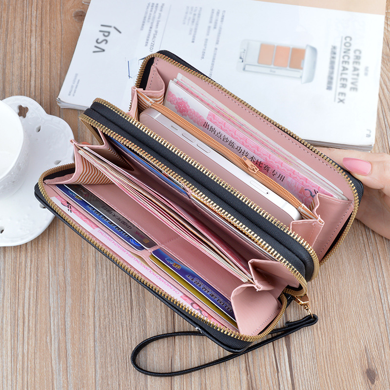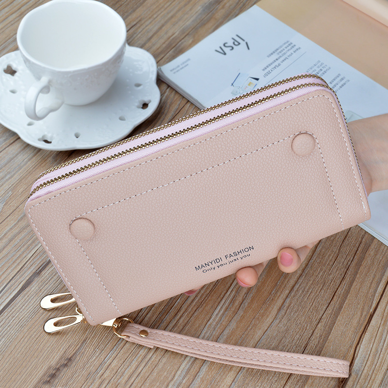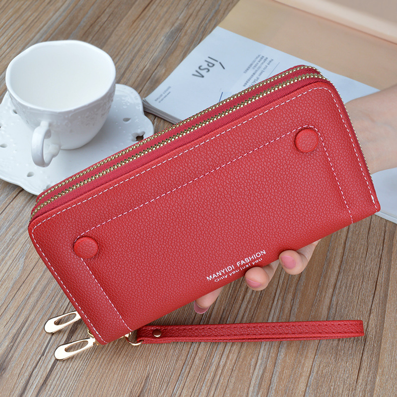 新款双拉链手拿钱包女士钱包长款时尚荔枝纹大容量双层钱夹手机包