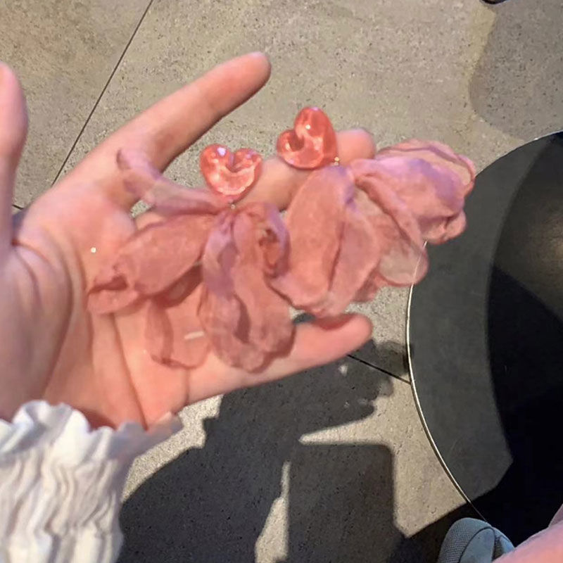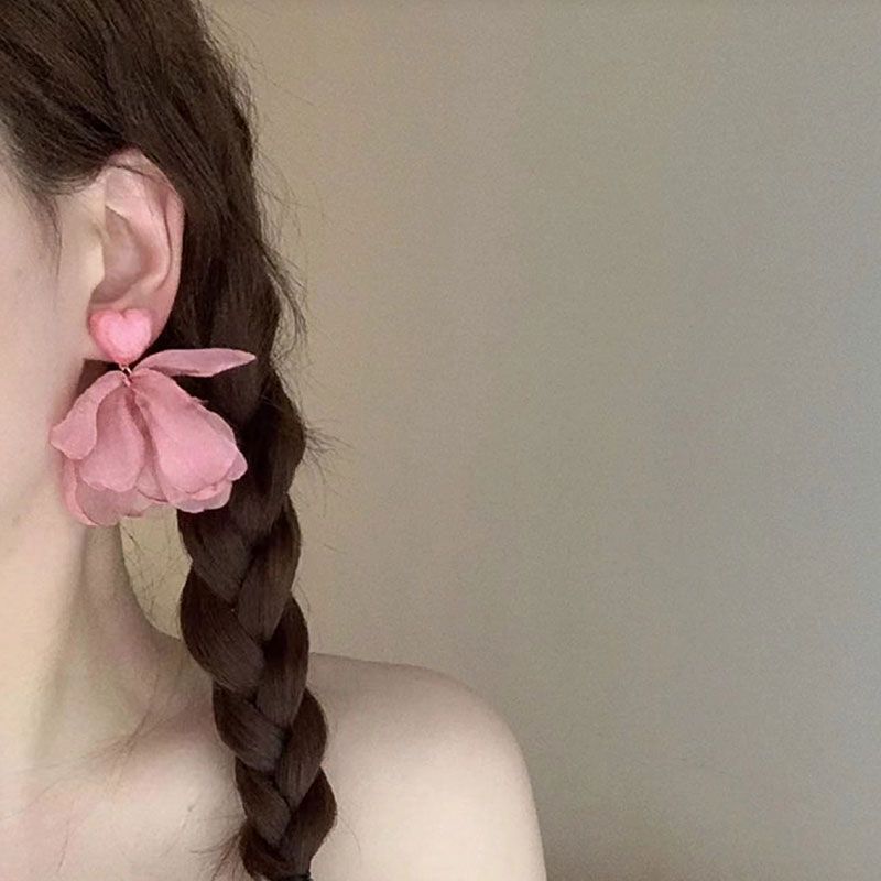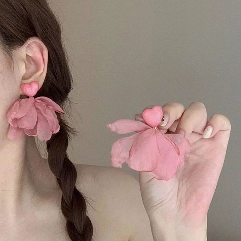 方圆脸适合的甜美粉爱心雪纺花瓣耳钉大脸显瘦小众设计感耳环