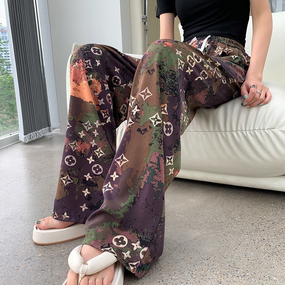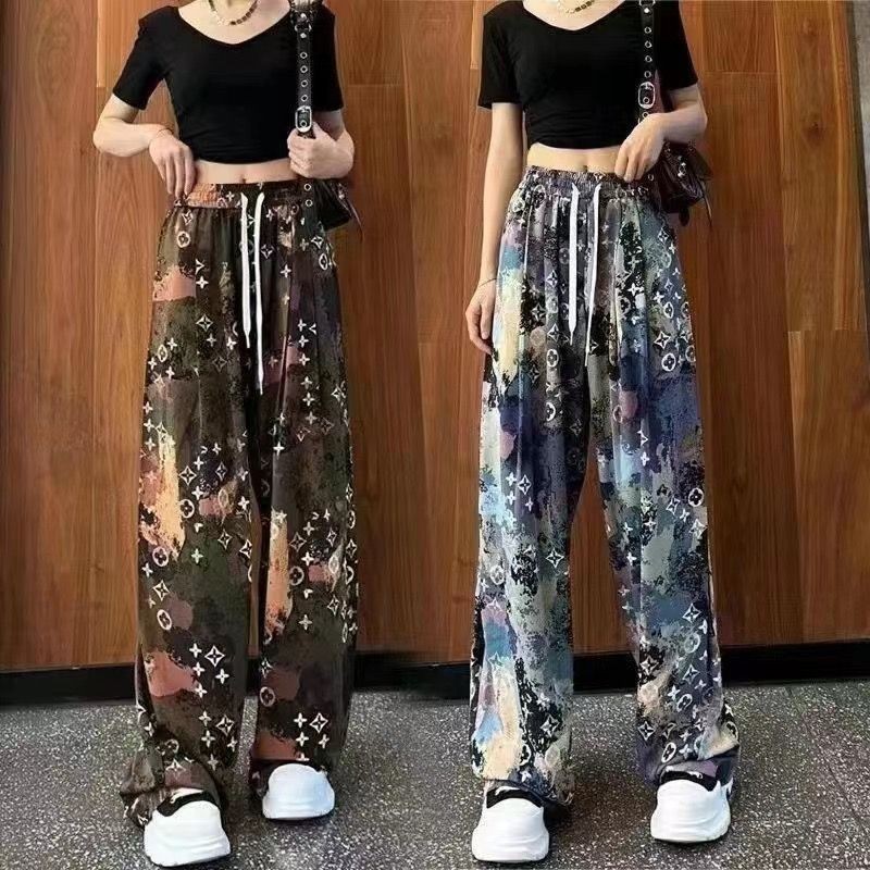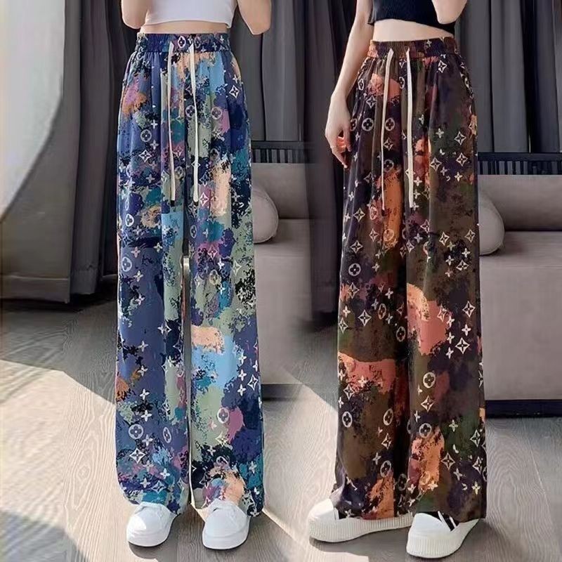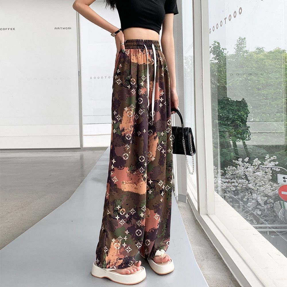 阔腿裤女2023新款夏季高腰印花设计垂坠感宽松百搭口袋扎染拖地裤