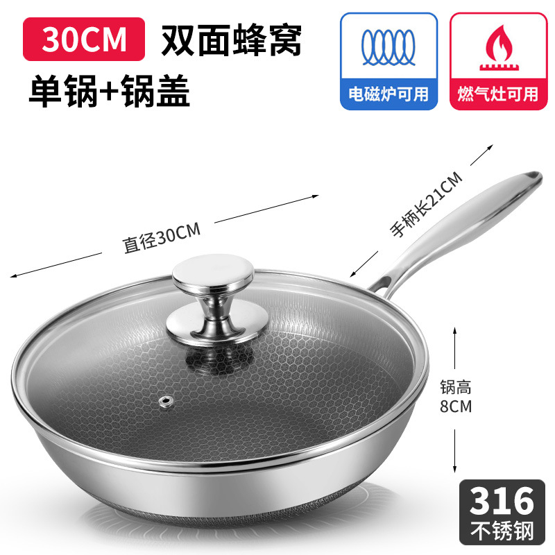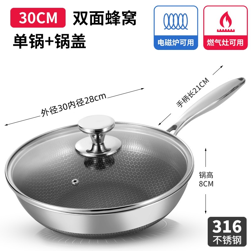 316L不锈钢双面炒锅少油烟蜂巢平底不粘炒菜锅家用燃气电磁炉锅具