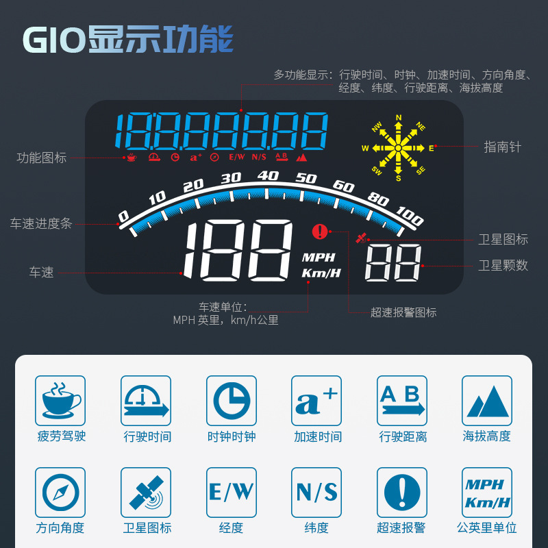 汽车抬头显示器GPS无线HUD货车速度显示器新能源多功能仪表投影仪