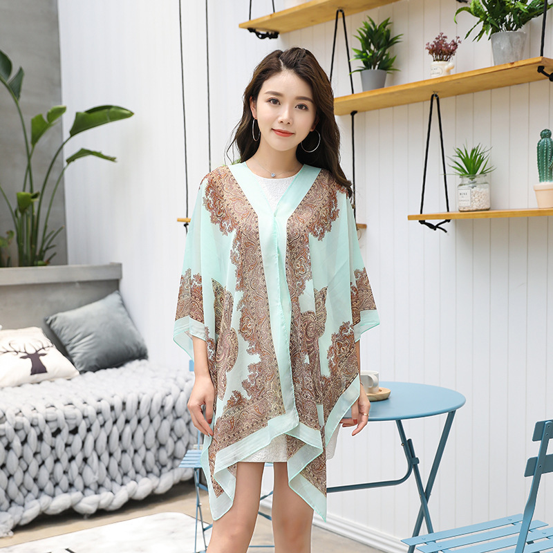 夏季防晒披肩女腰果印花珍珠扣雪纺丝巾防晒衣户外沙滩巾网红直播