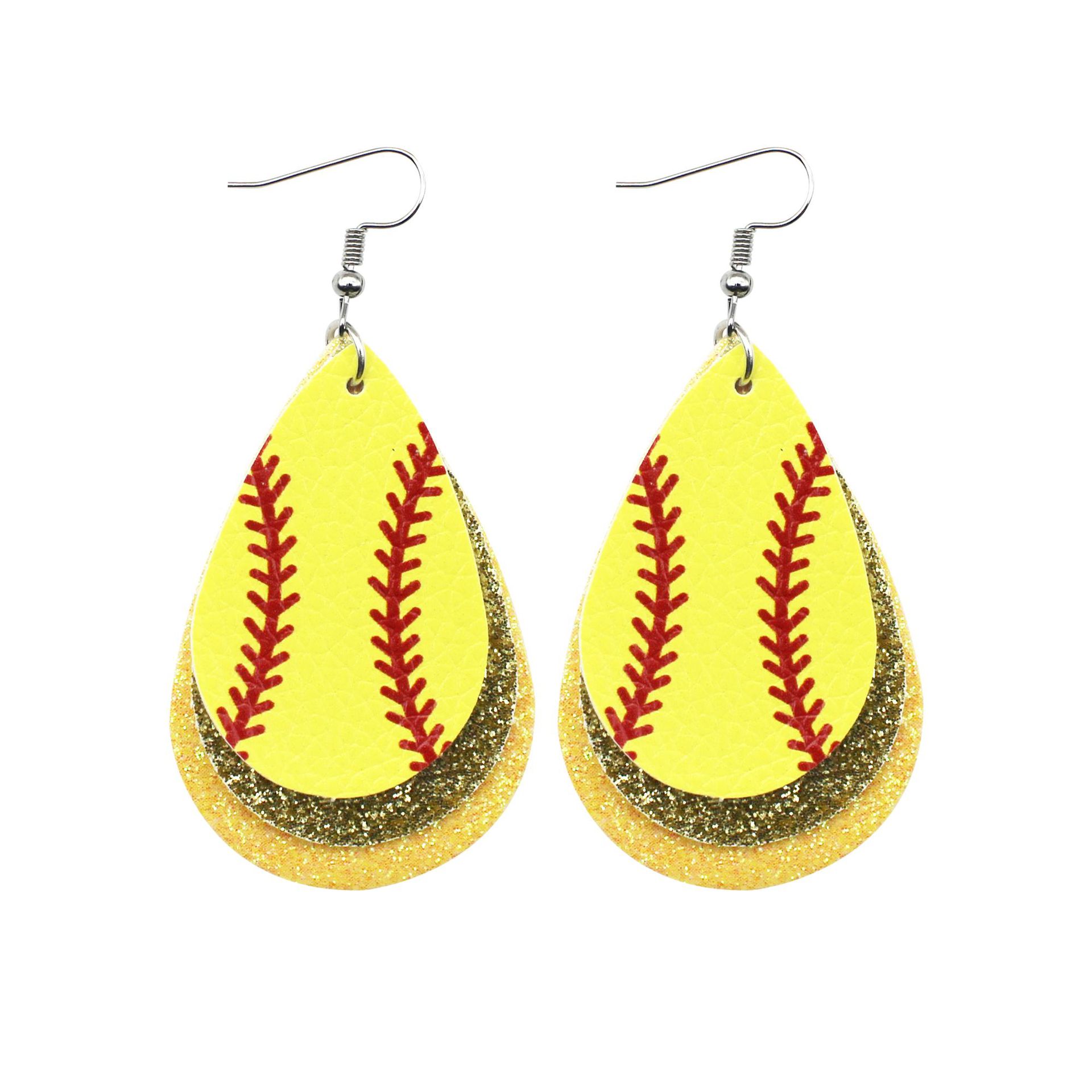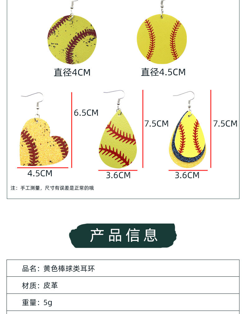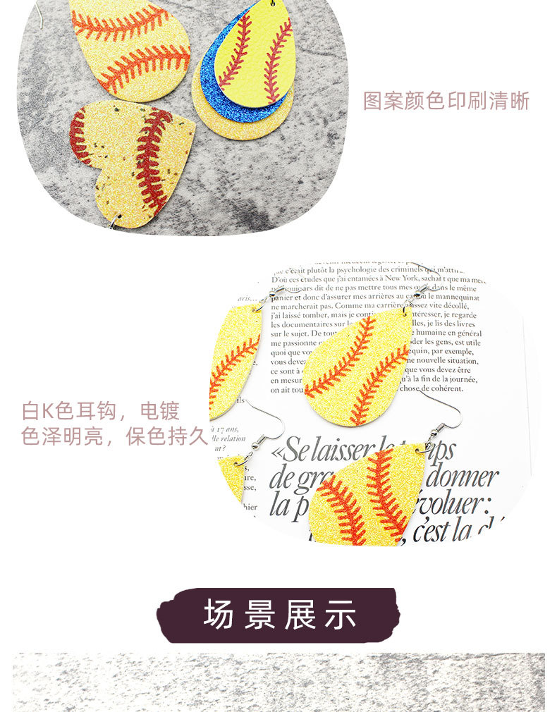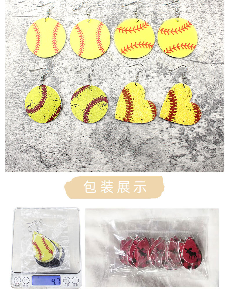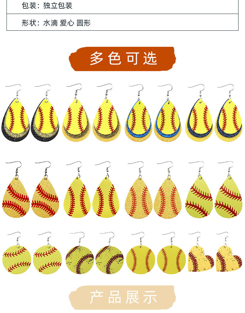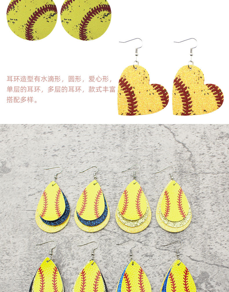 跨境棒球耳环三层水滴皮革耳环爱心球形棒球PU耳环亚马逊速卖通