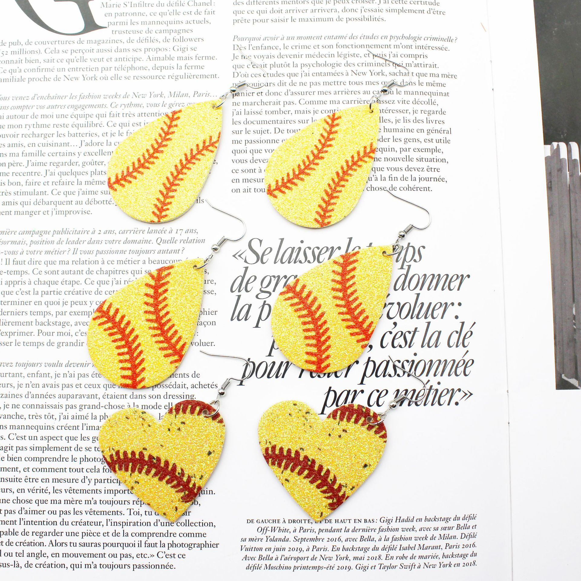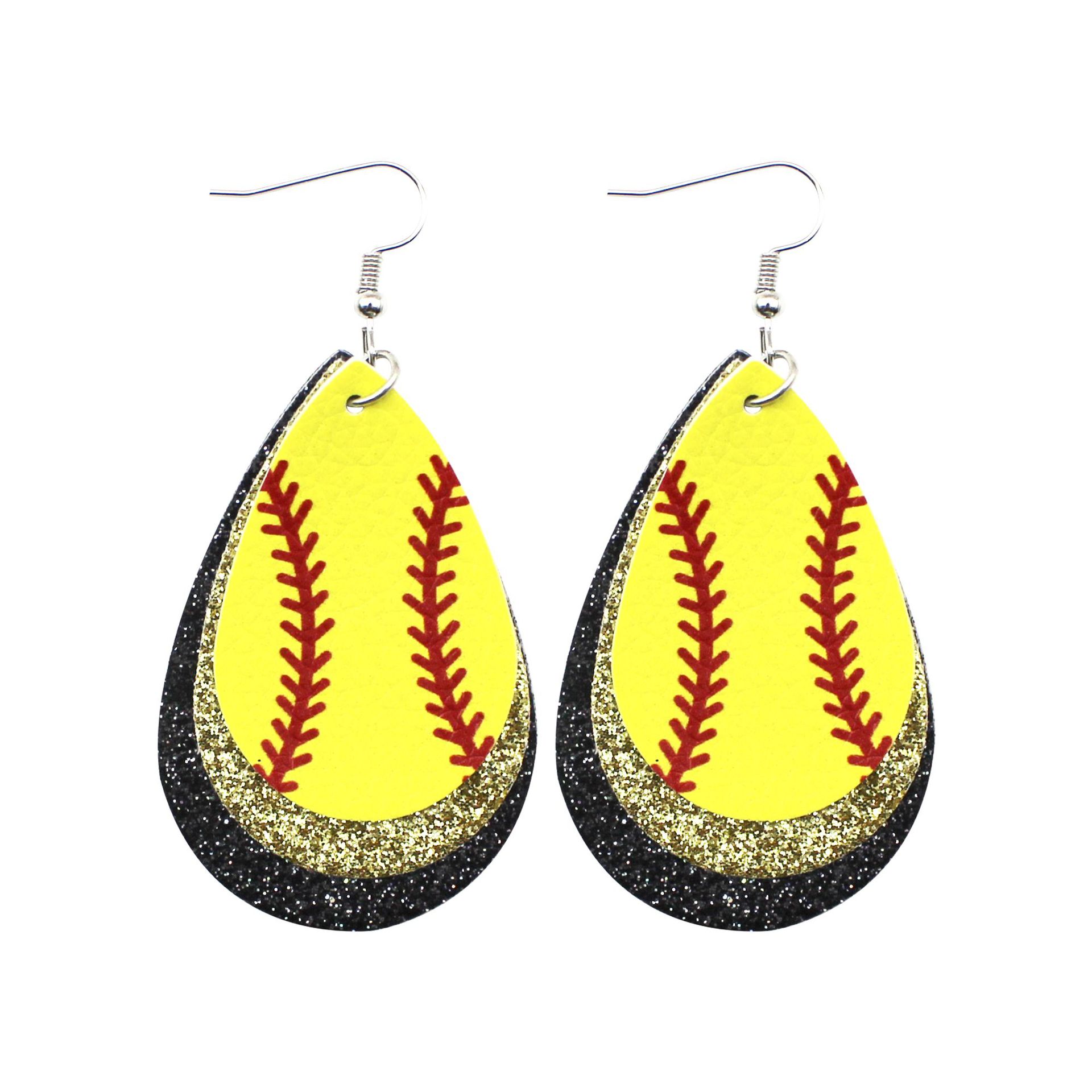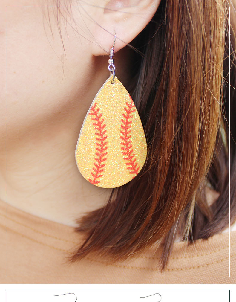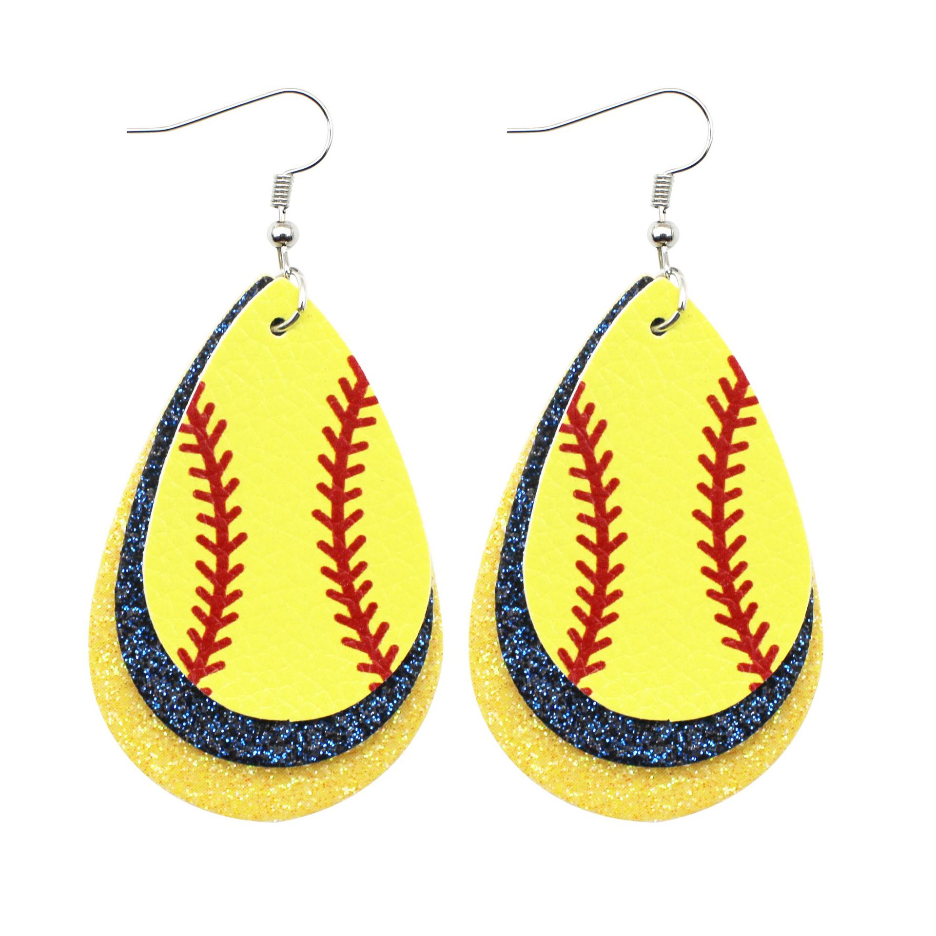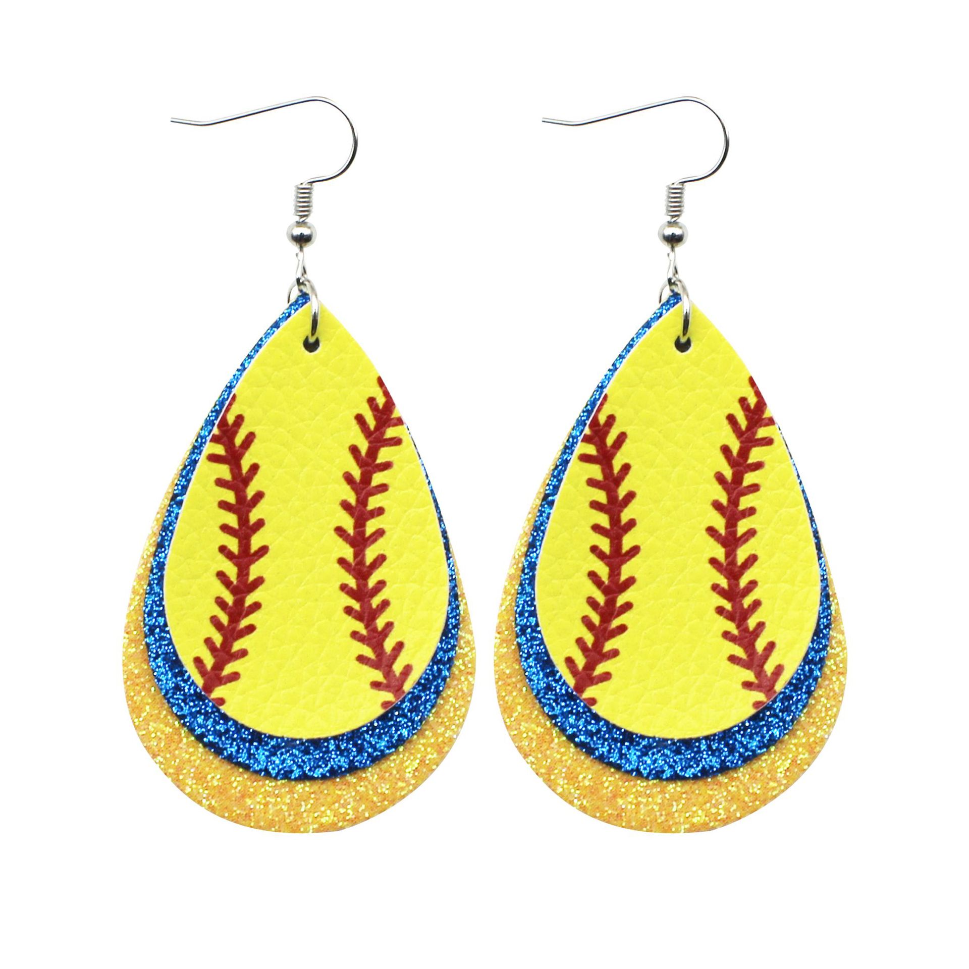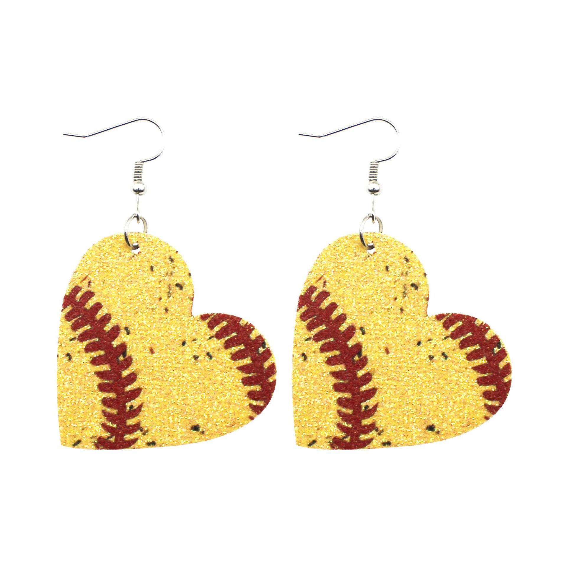 跨境棒球耳环三层水滴皮革耳环爱心球形棒球PU耳环亚马逊速卖通