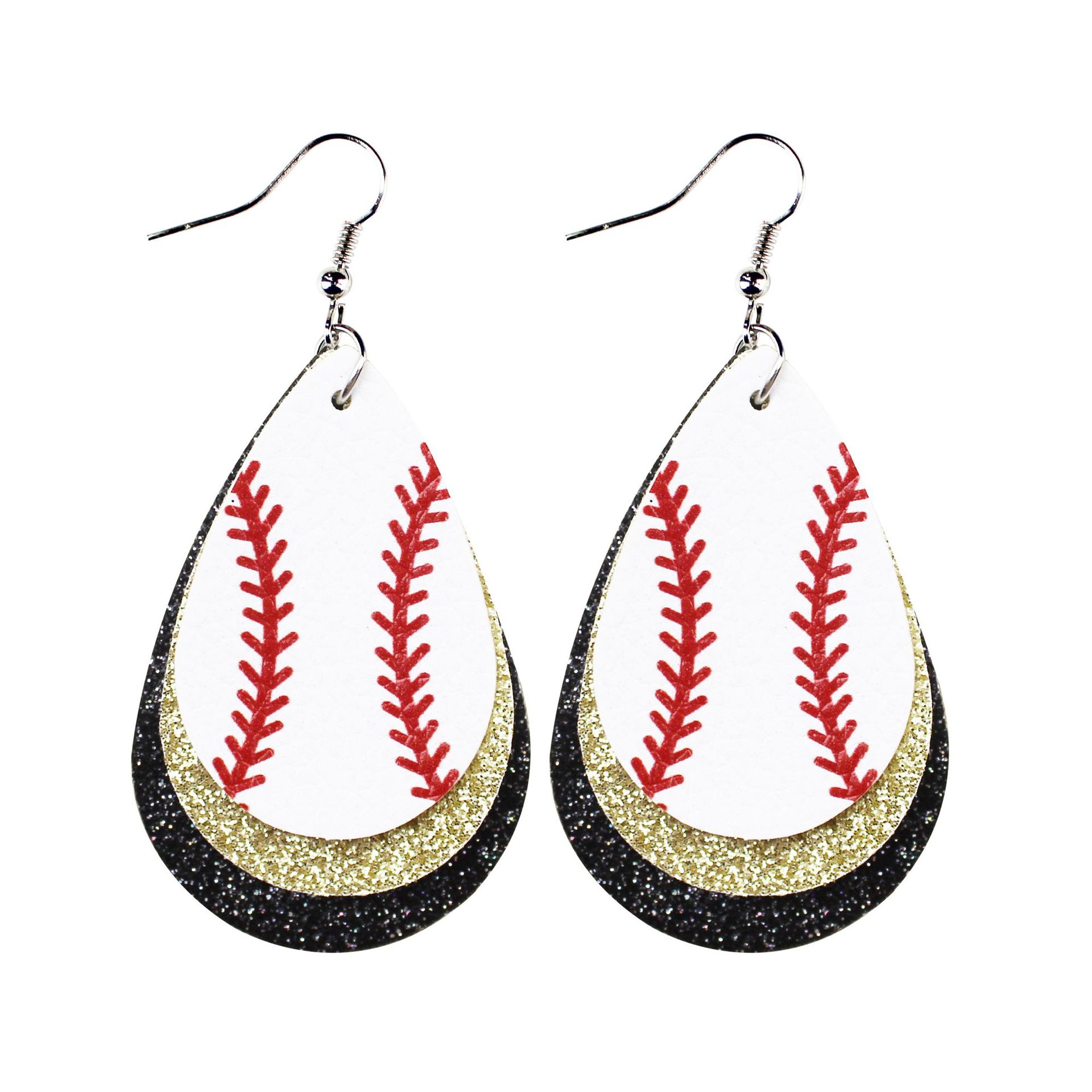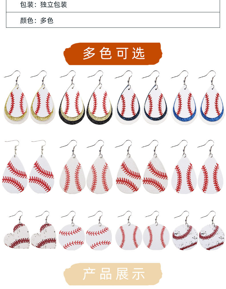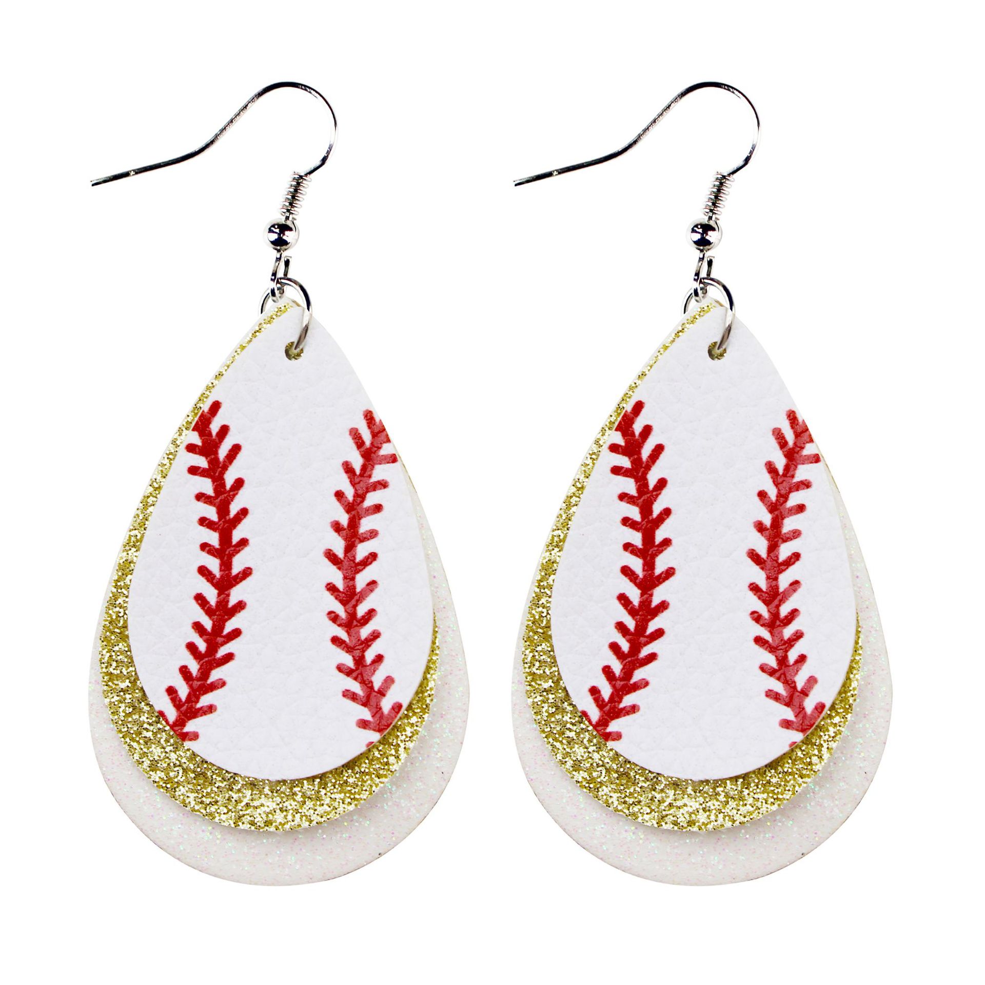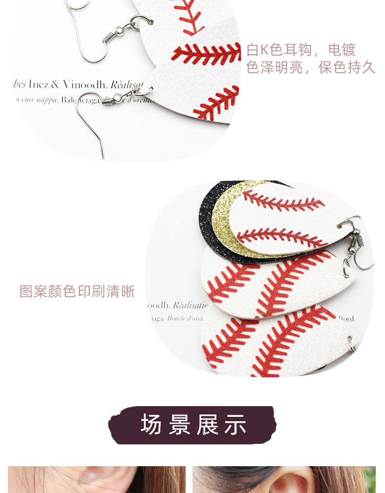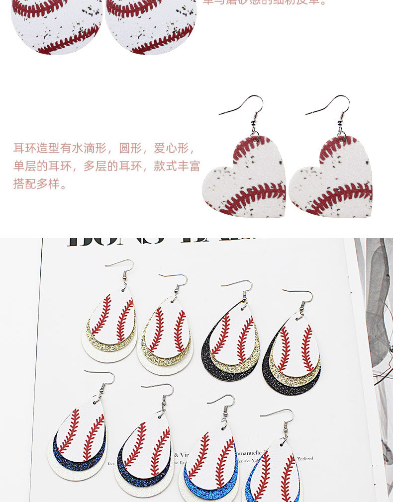 跨境白色皮革棒球主题耳环闪粉PU圆形爱心水滴三层亚马逊速卖通