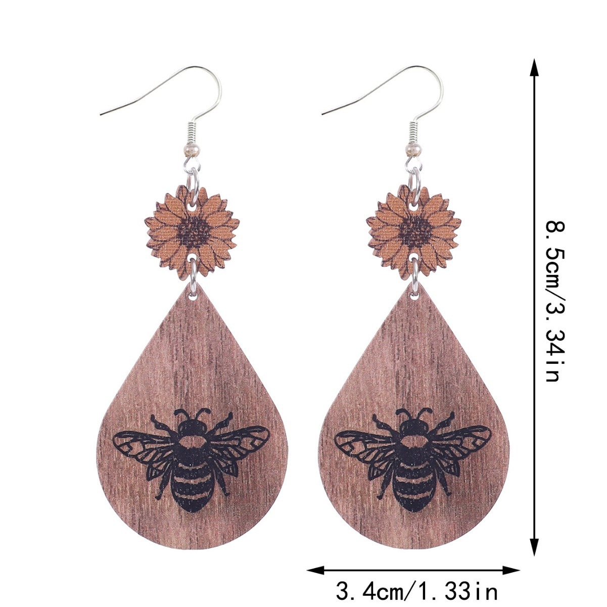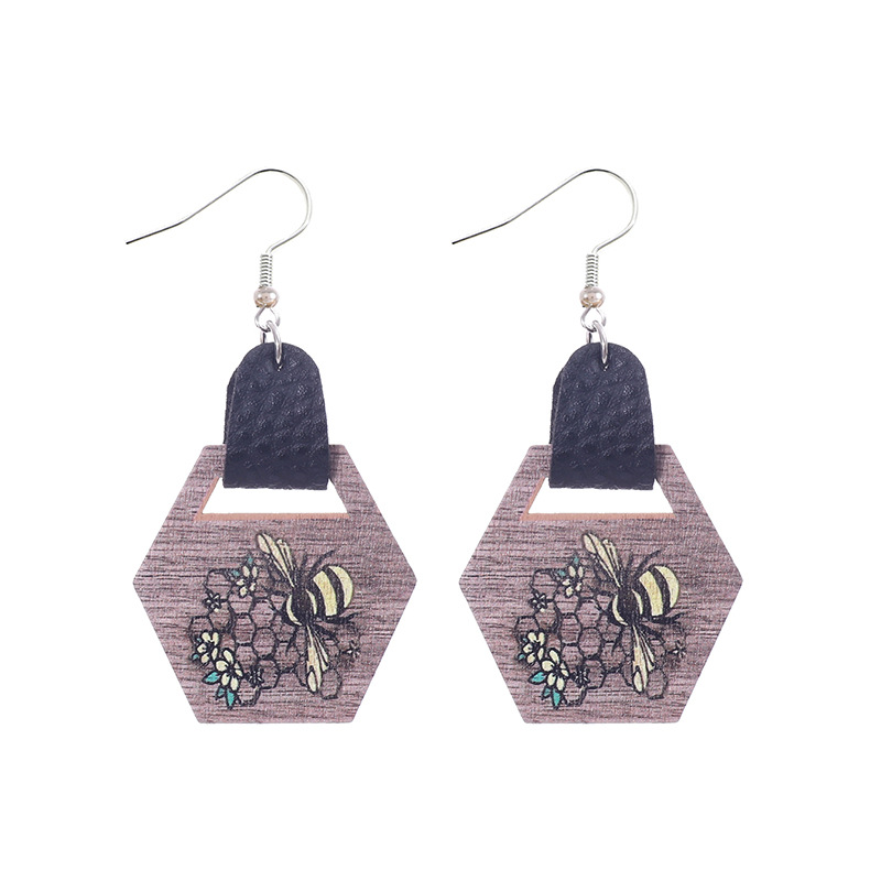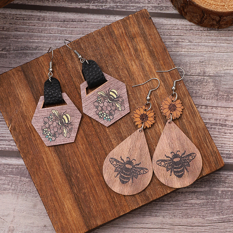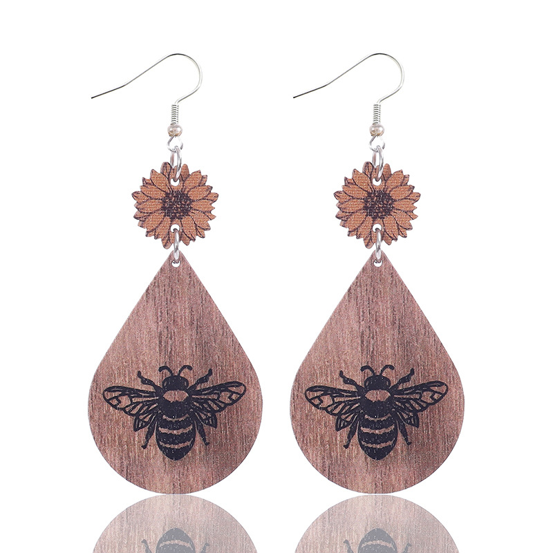 跨境欧美新款农场系列耳饰向日葵蜜蜂图案皮革水滴型耳环亚马逊速