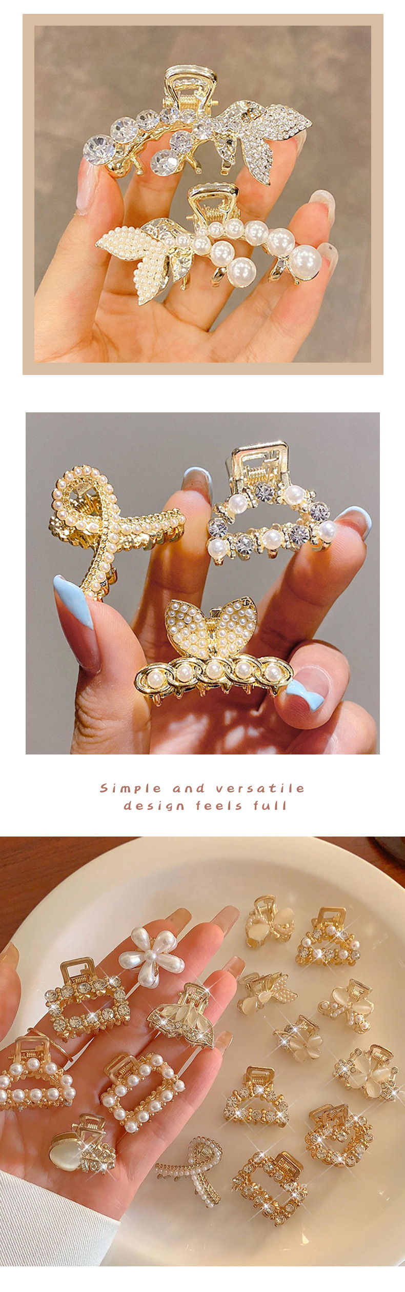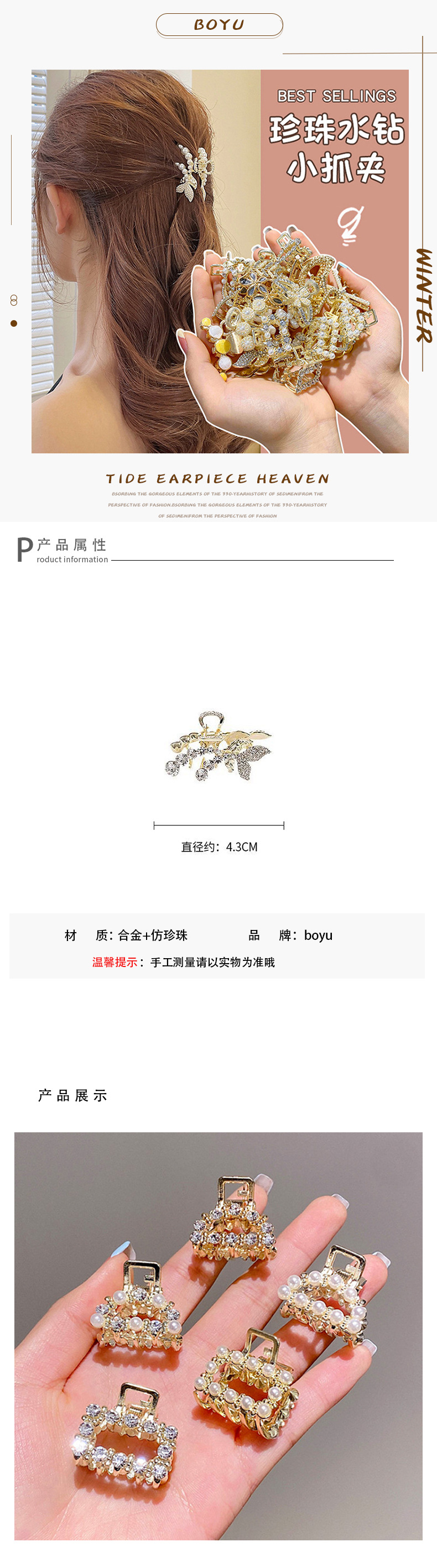 半扎发发夹女后脑勺夹子头饰小号珍珠水钻马尾抓夹发卡网红鲨鱼夹
