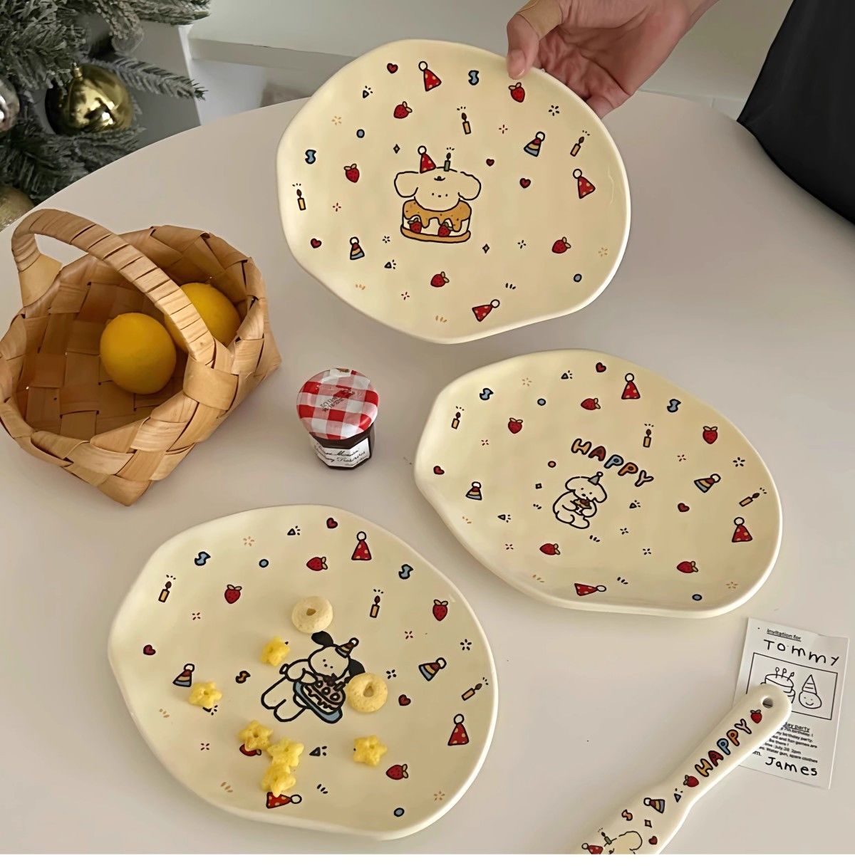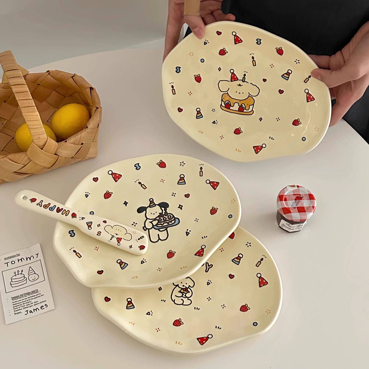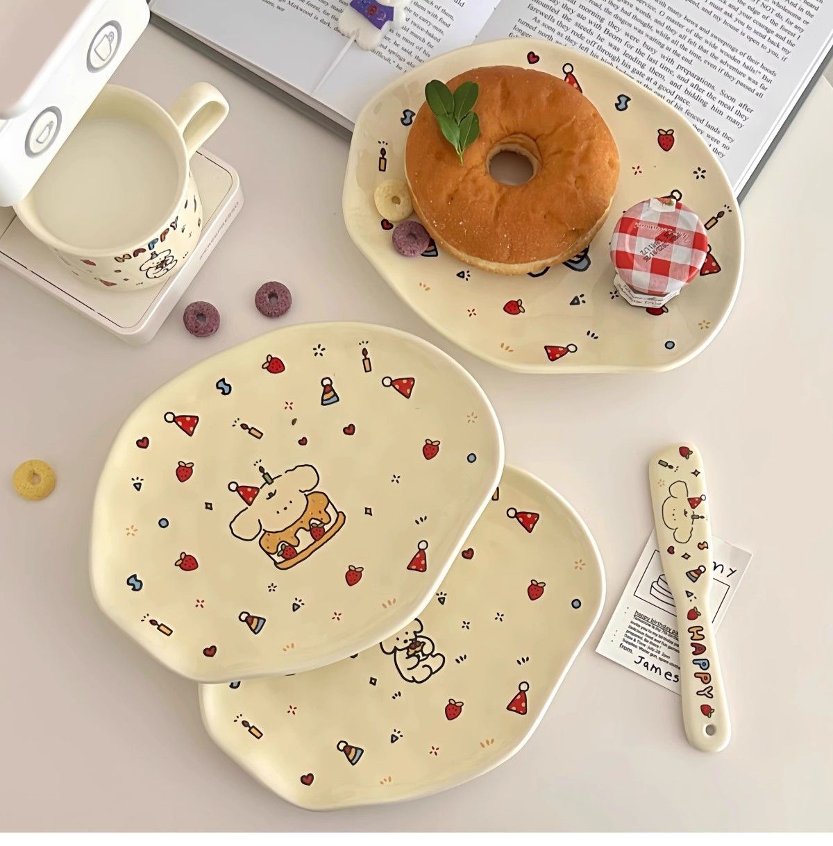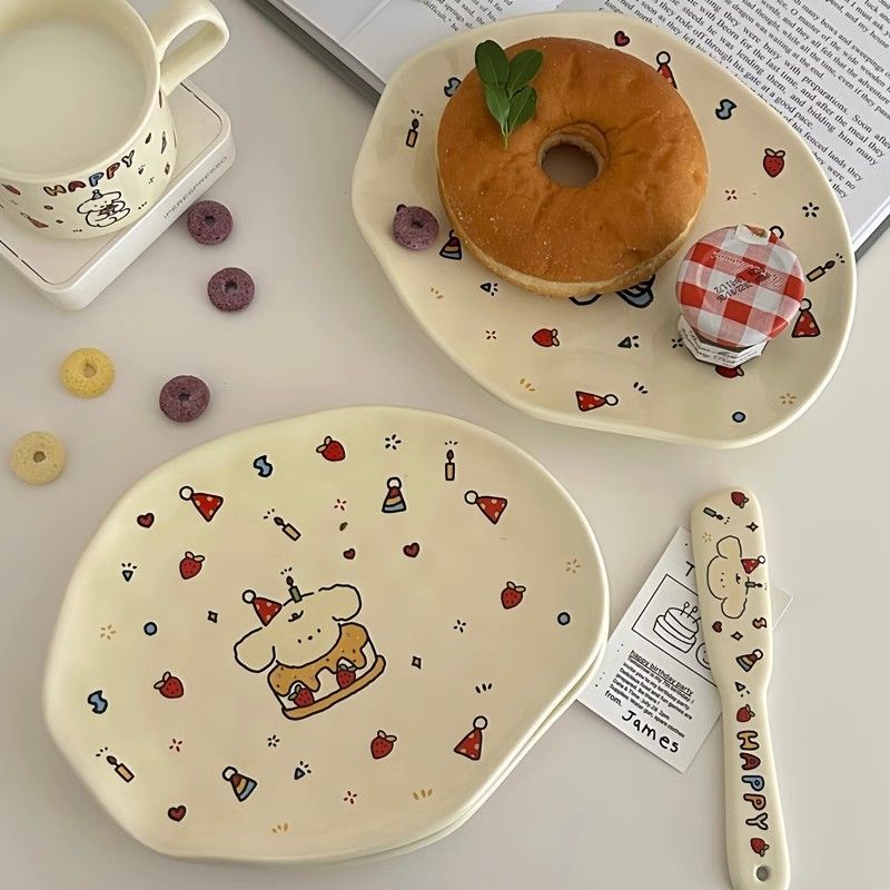 盘子ins高颜值碗盘套装小狗插画奶油色早餐盘陶瓷不规则盘家用盘