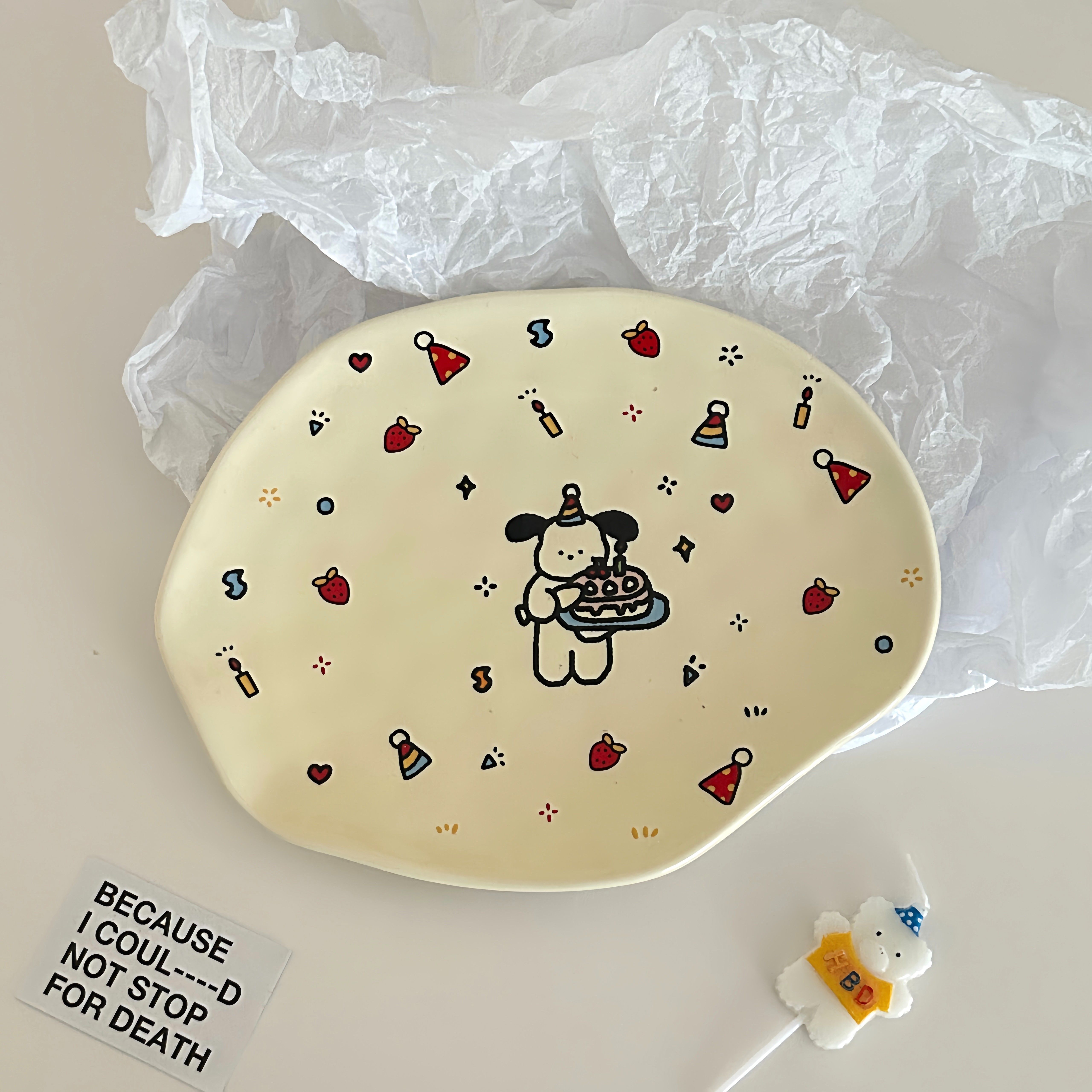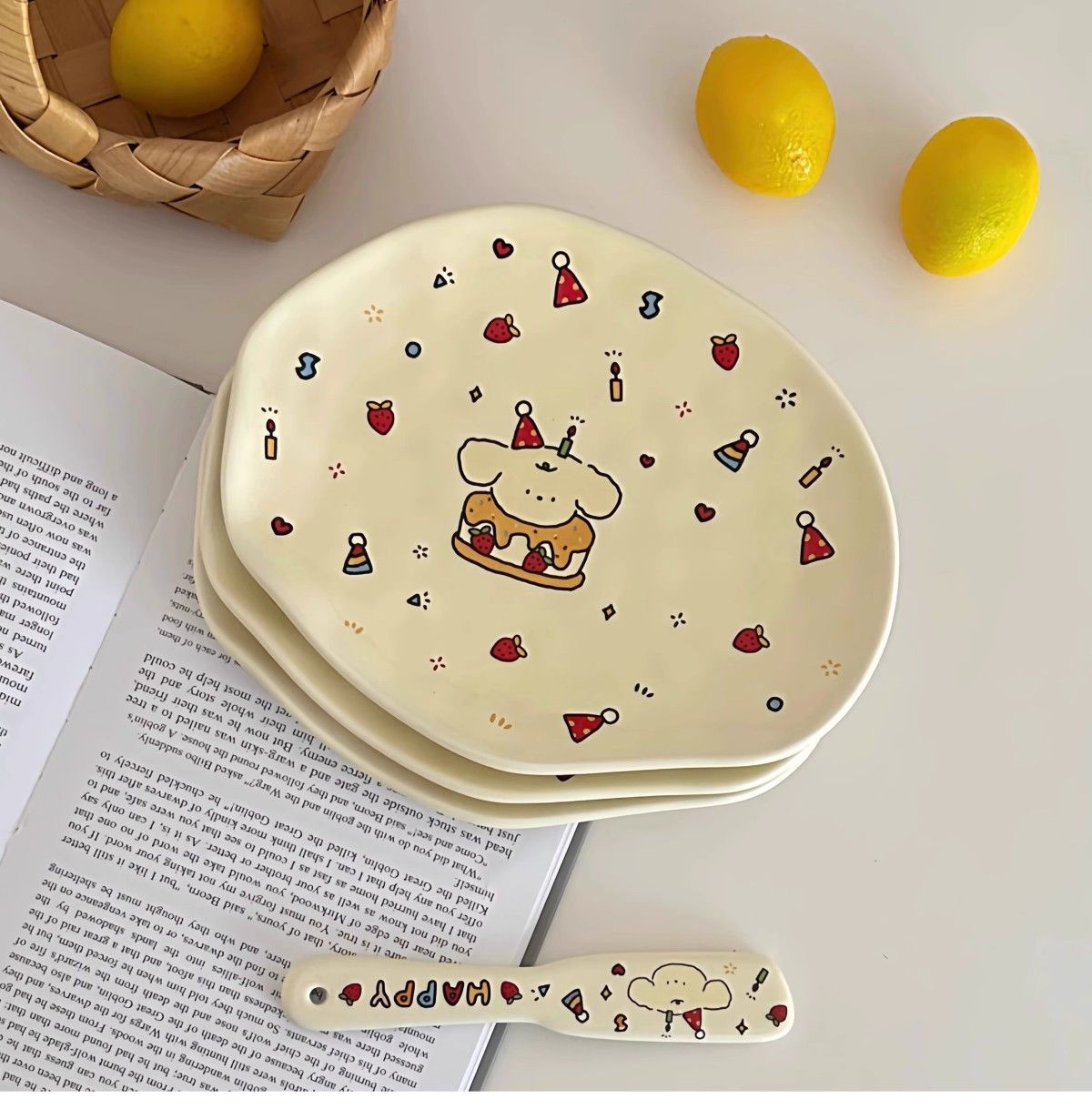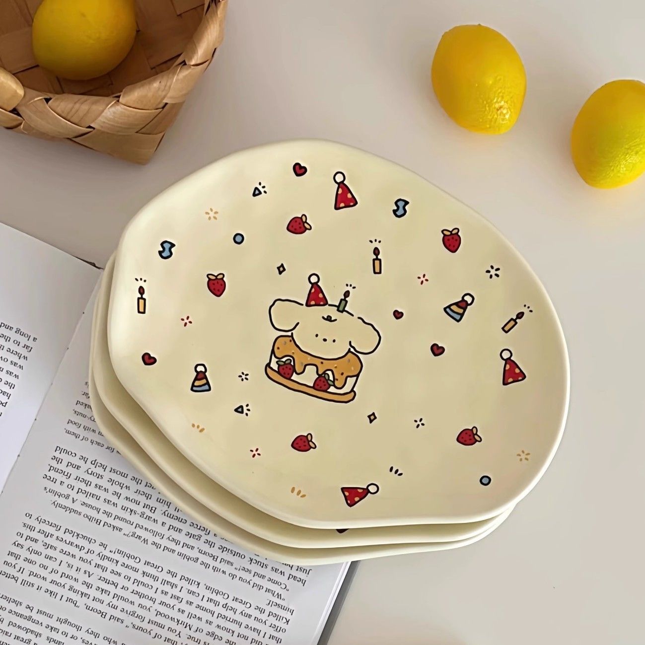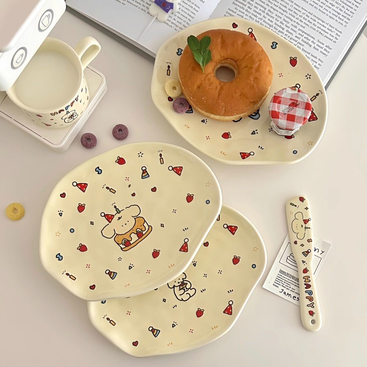 盘子ins高颜值碗盘套装小狗插画奶油色早餐盘陶瓷不规则盘家用盘