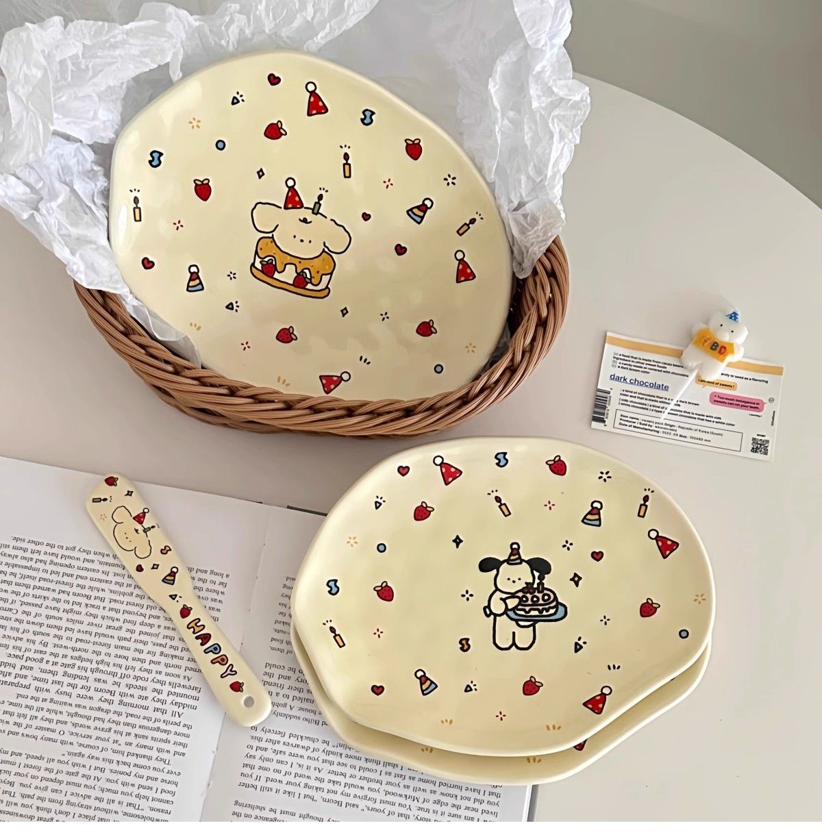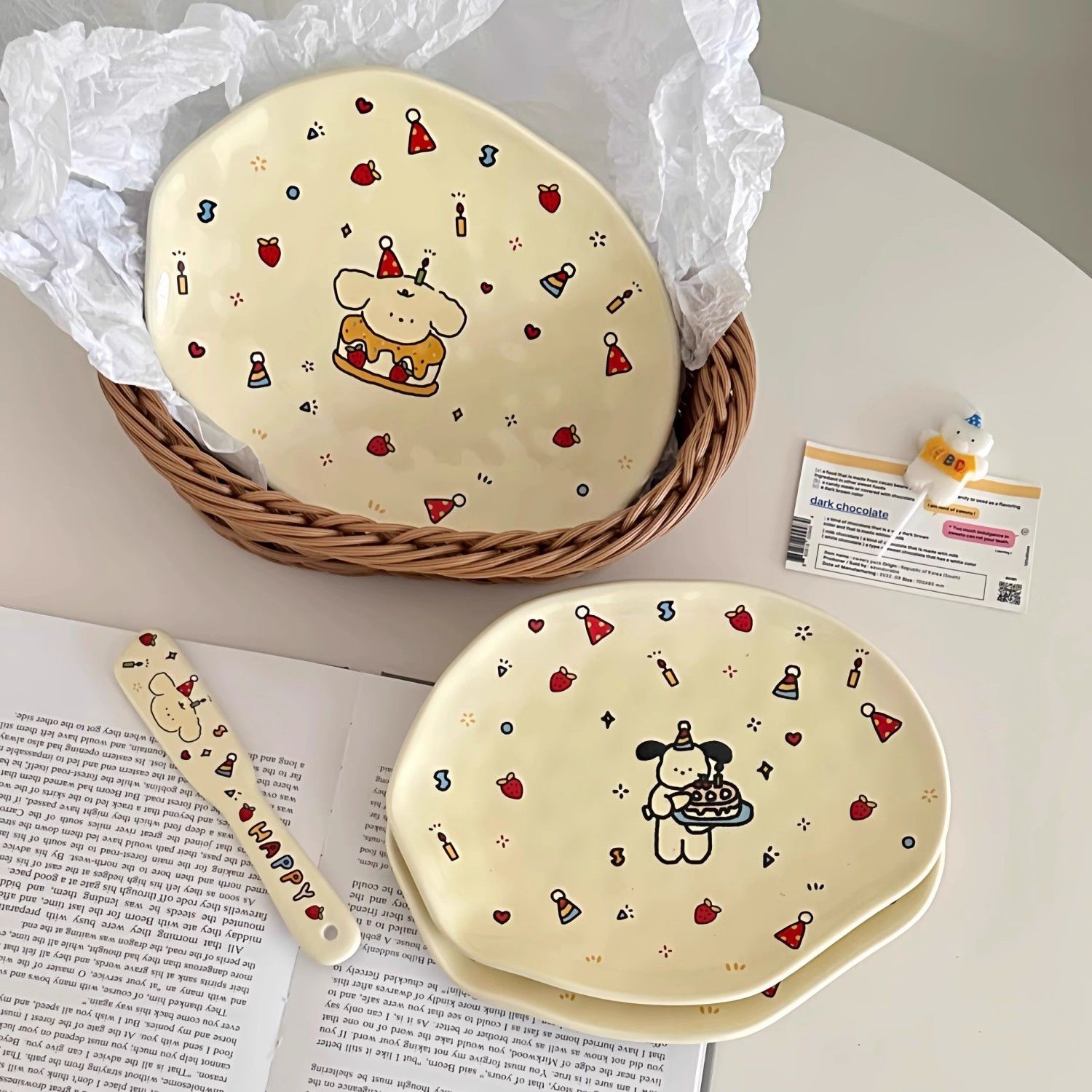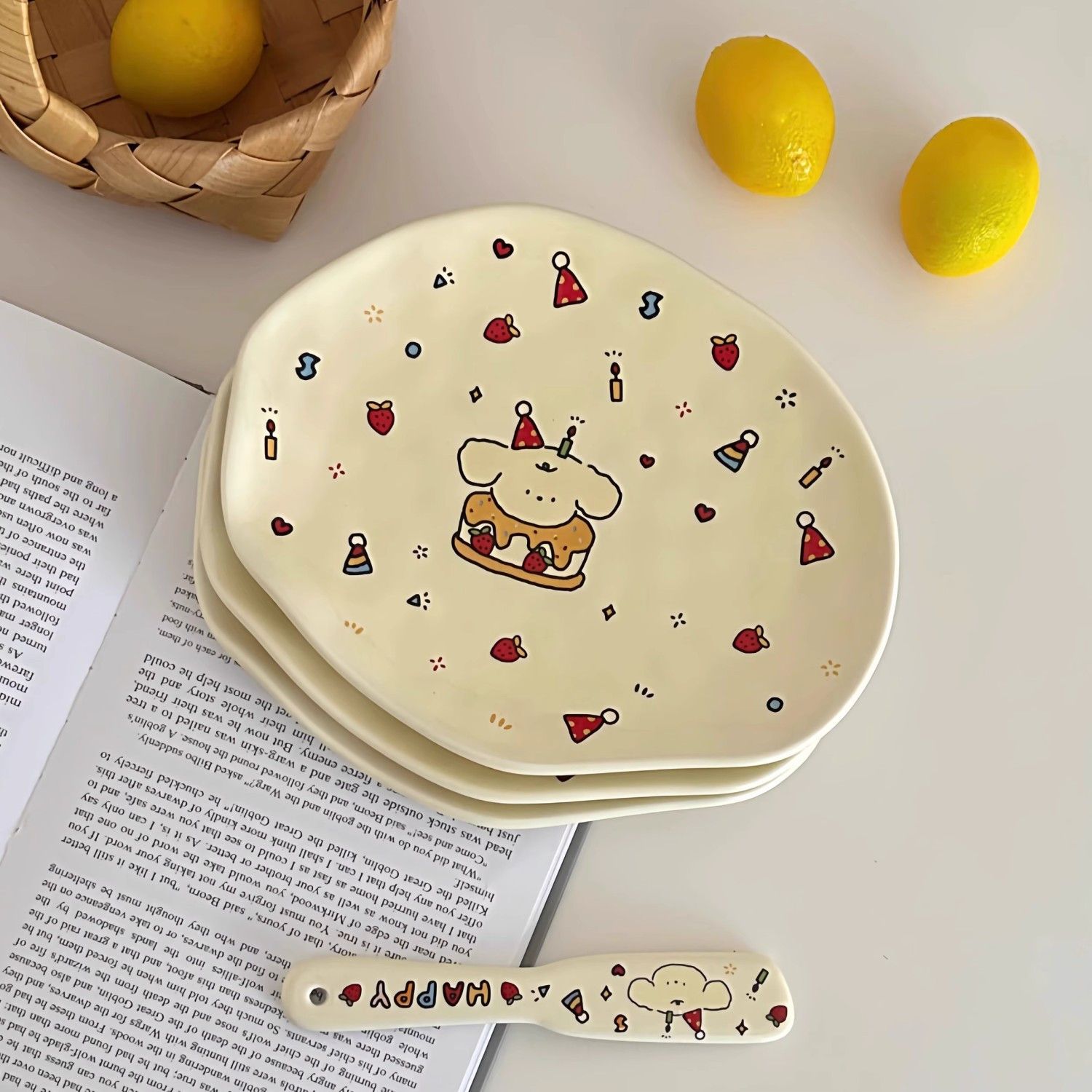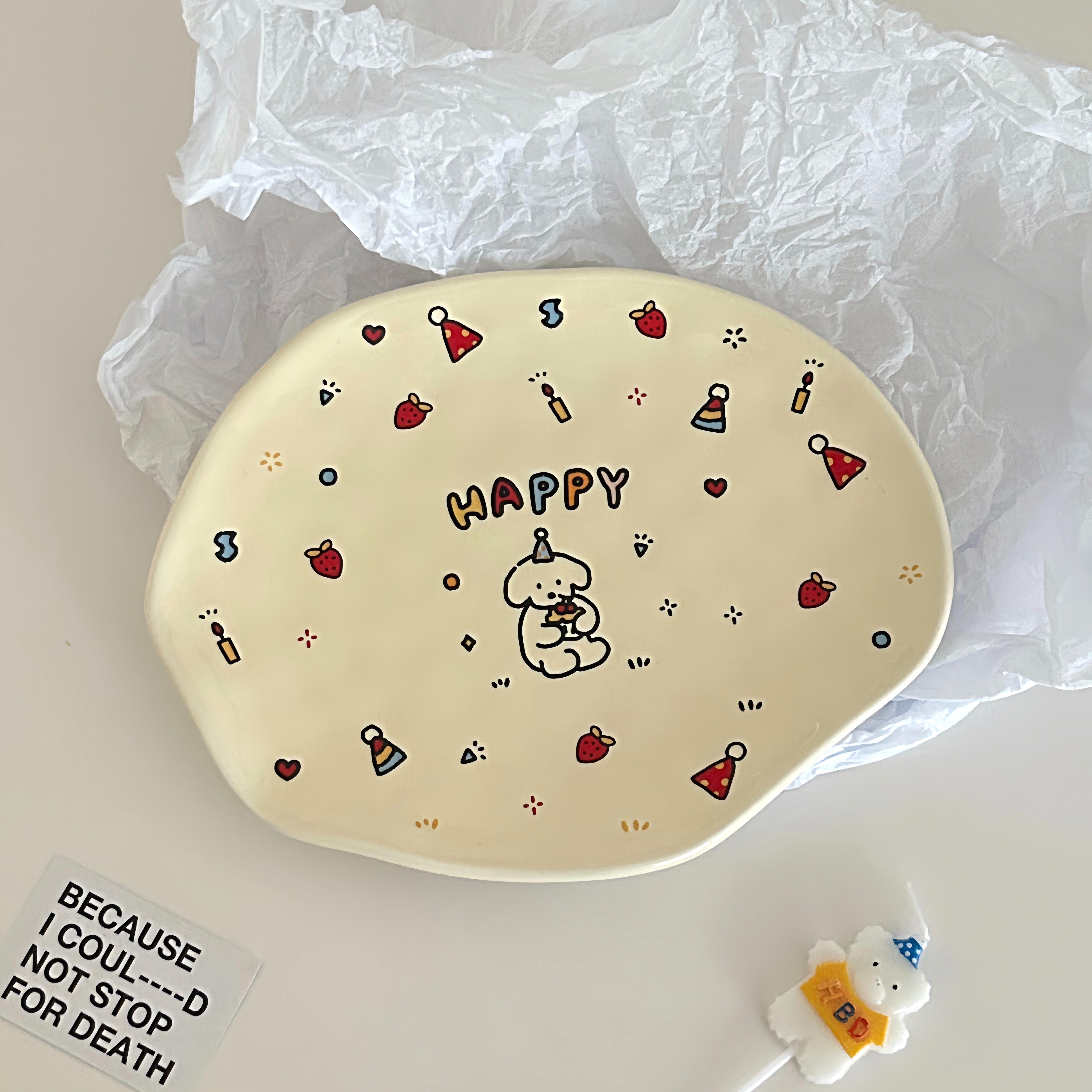 盘子ins高颜值碗盘套装小狗插画奶油色早餐盘陶瓷不规则盘家用盘