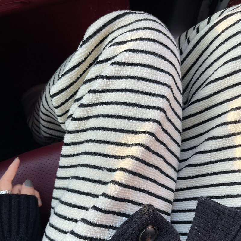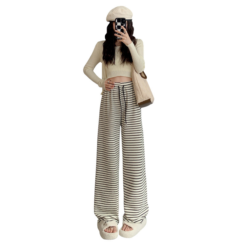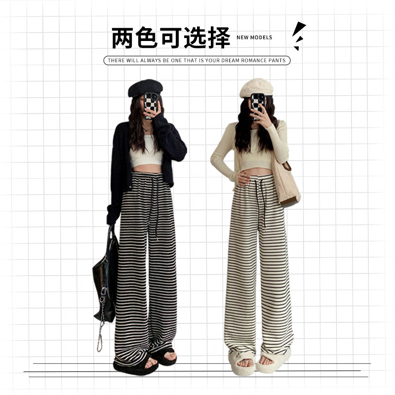 黑白条纹阔腿裤女春秋高腰垂感休闲遛弯裤软糯慵懒针织拖地长裤子