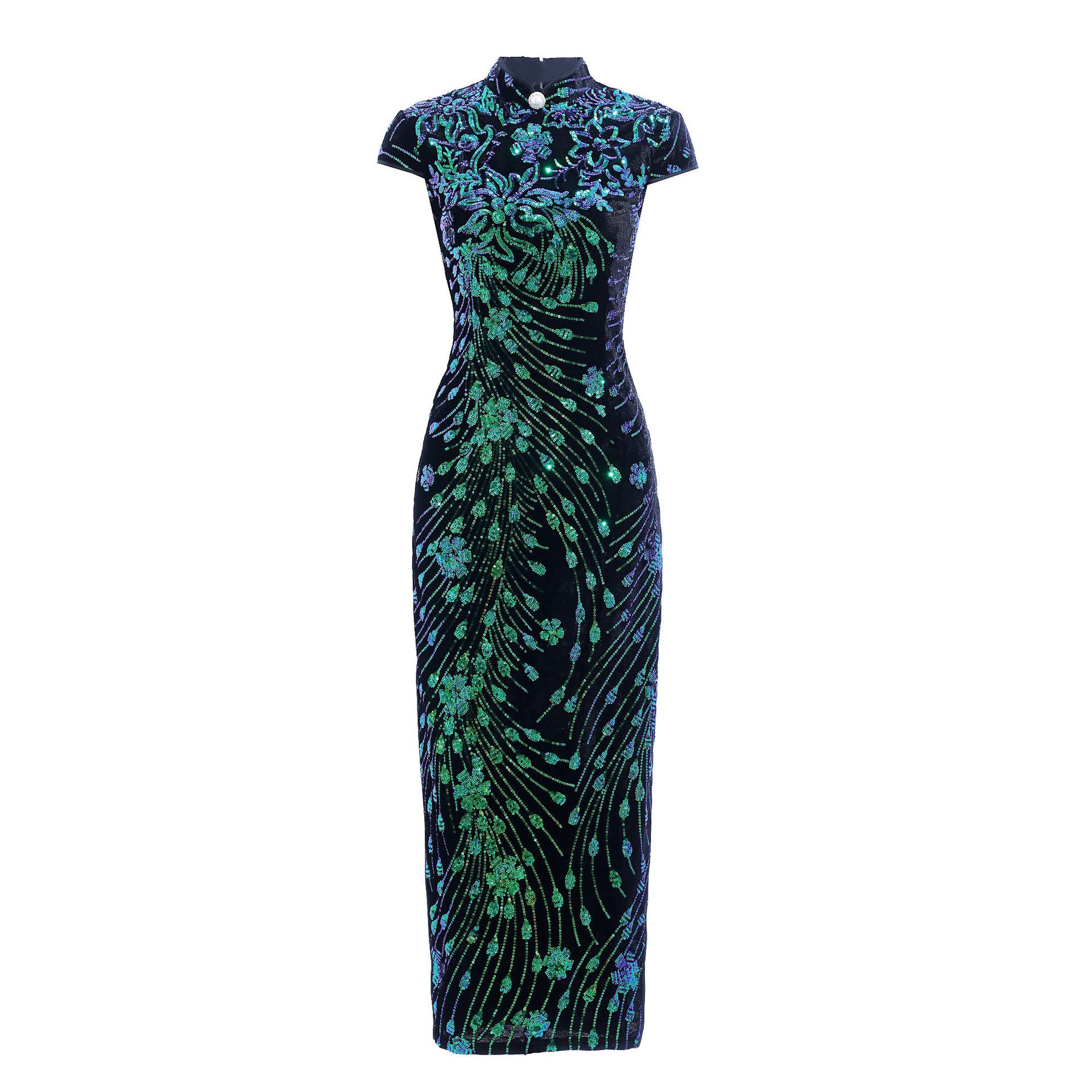 帛之艺春夏新款丝绒绣凤尾长款旗袍 年轻款宴会走秀旗袍连衣裙