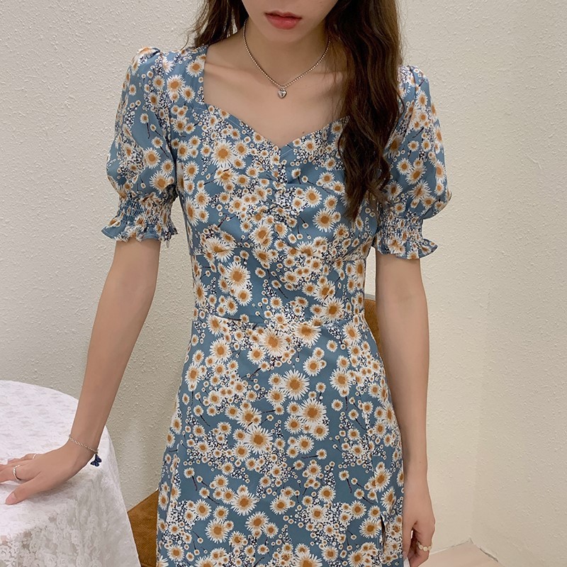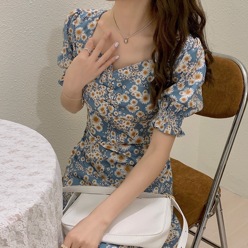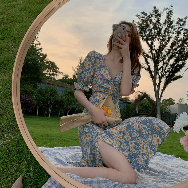 2023年新款一步开叉镂空旗袍法式复古桔梗裙子喇叭袖碎花连衣裙