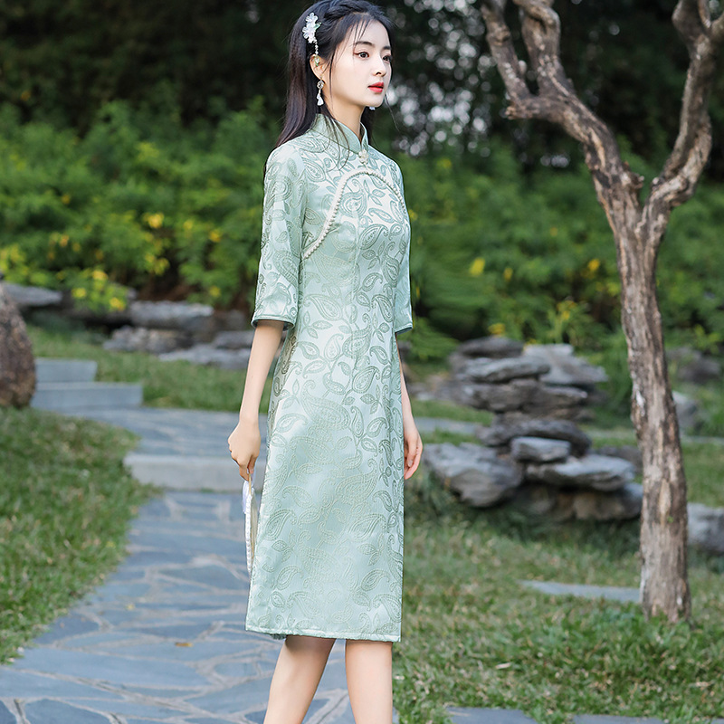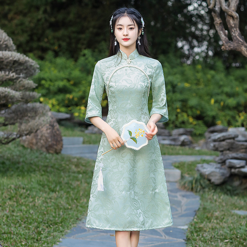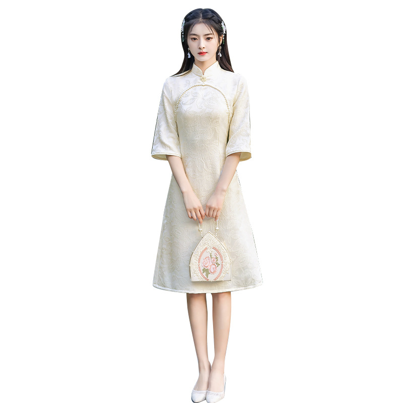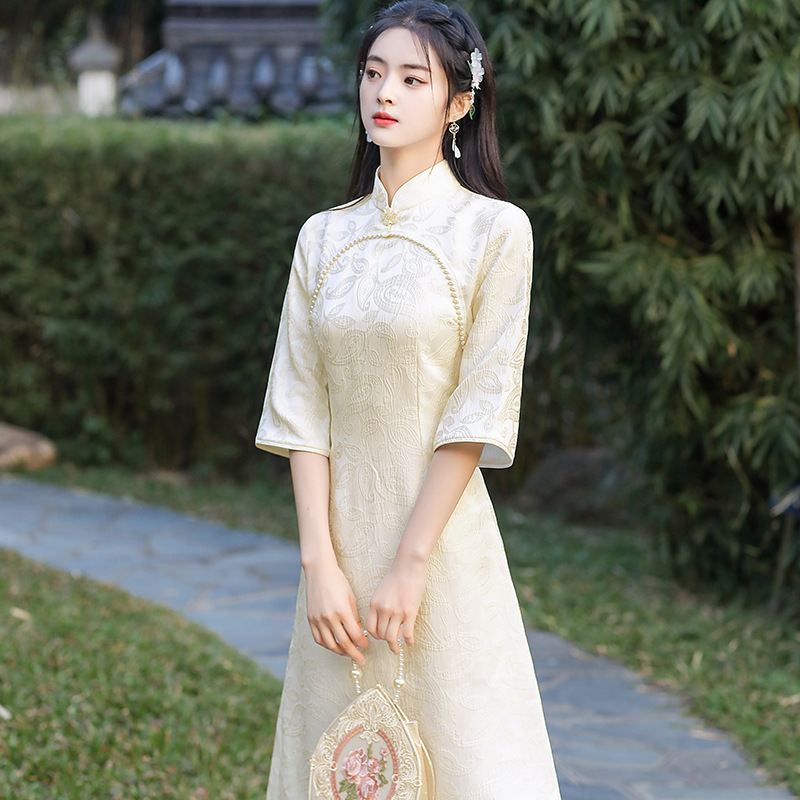 改良旗袍2024年新款素雅复古中国风米色中长款年轻款连衣裙A大摆