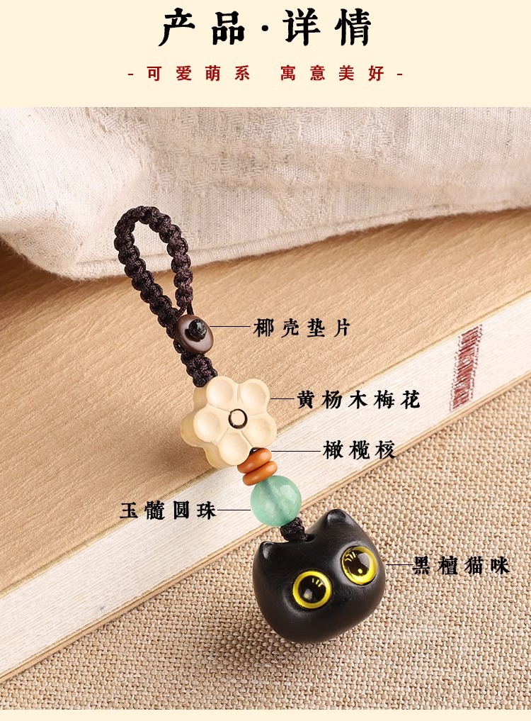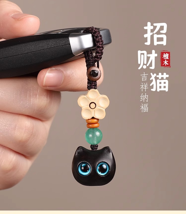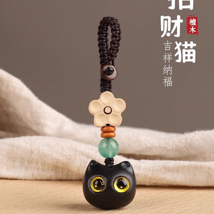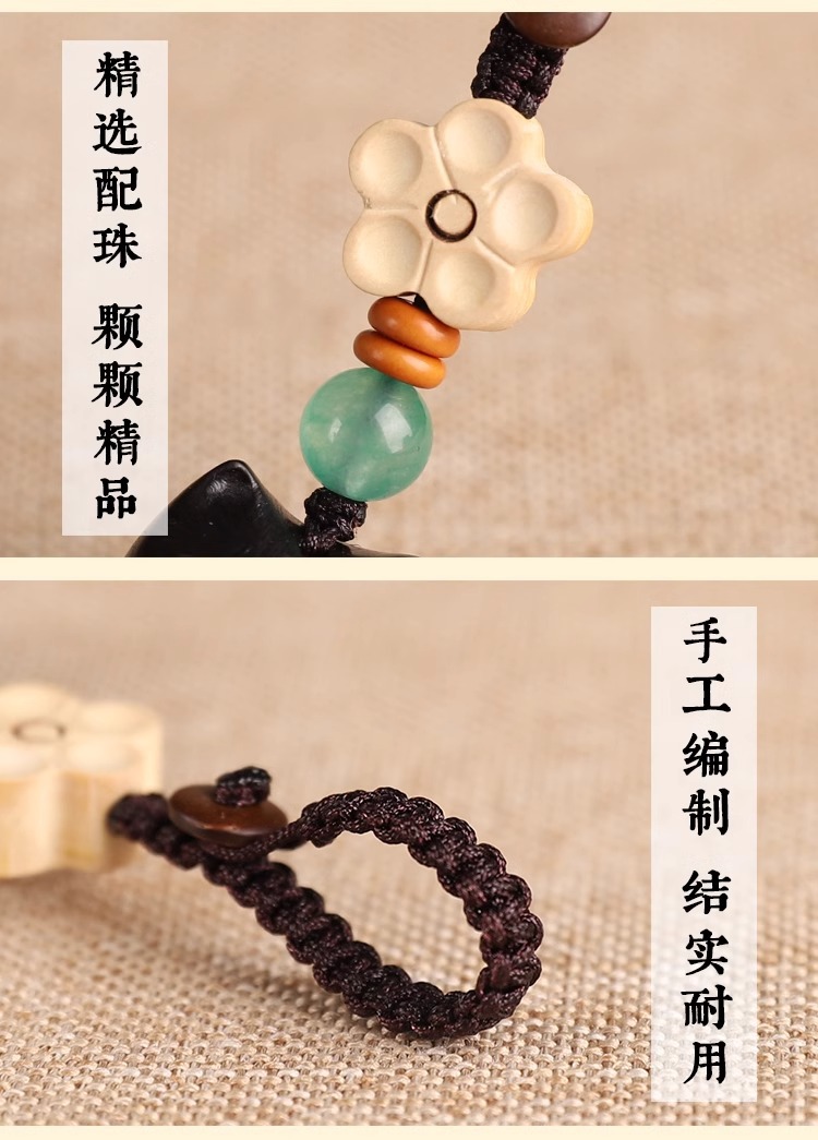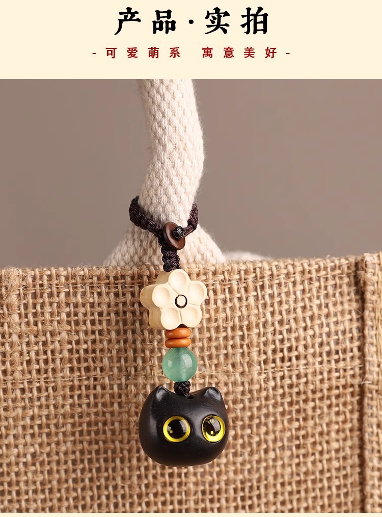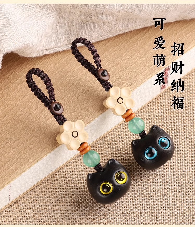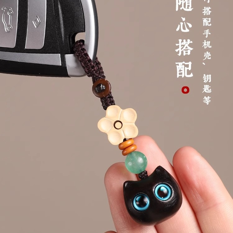 天然黑檀猫咪汽车钥匙扣黄杨木莲花文玩挂件吊坠饰品铃铛手机链