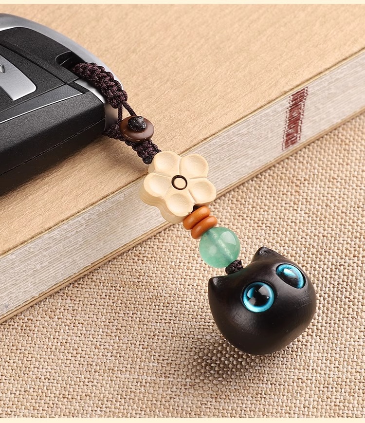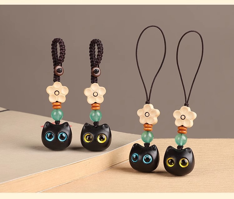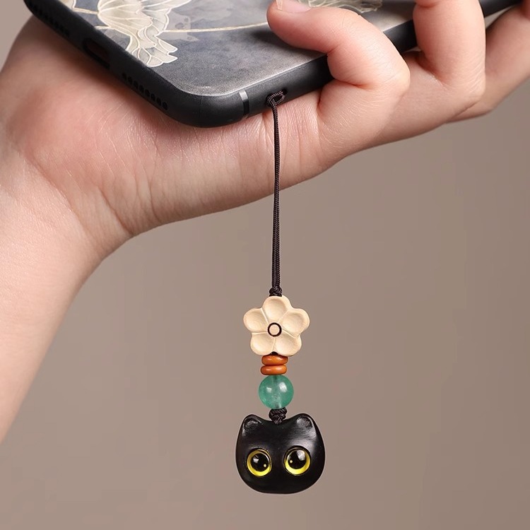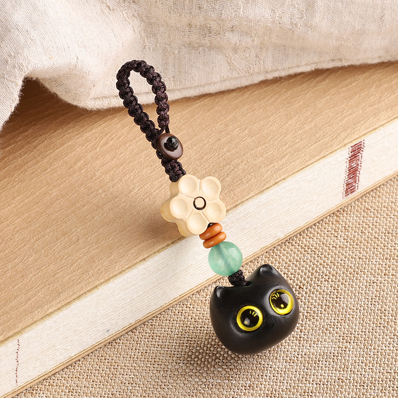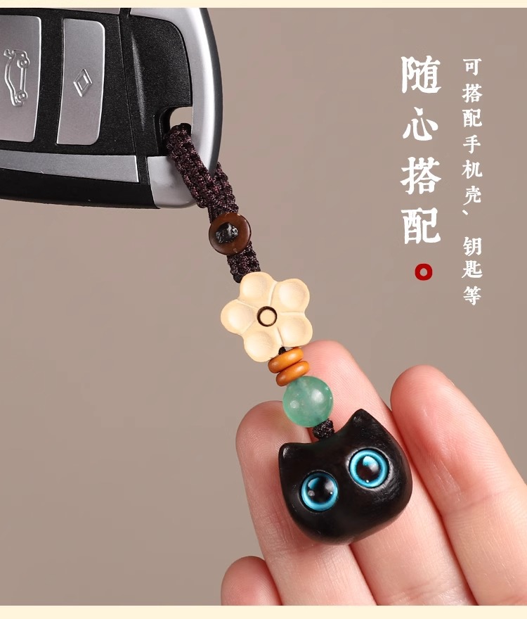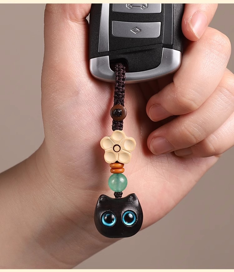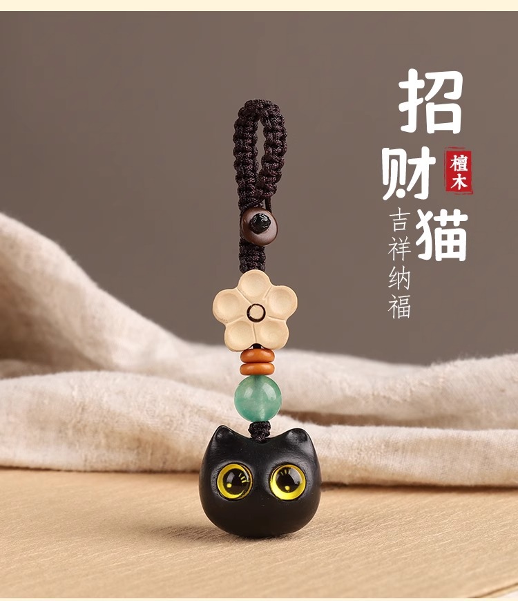 天然黑檀猫咪汽车钥匙扣黄杨木莲花文玩挂件吊坠饰品铃铛手机链