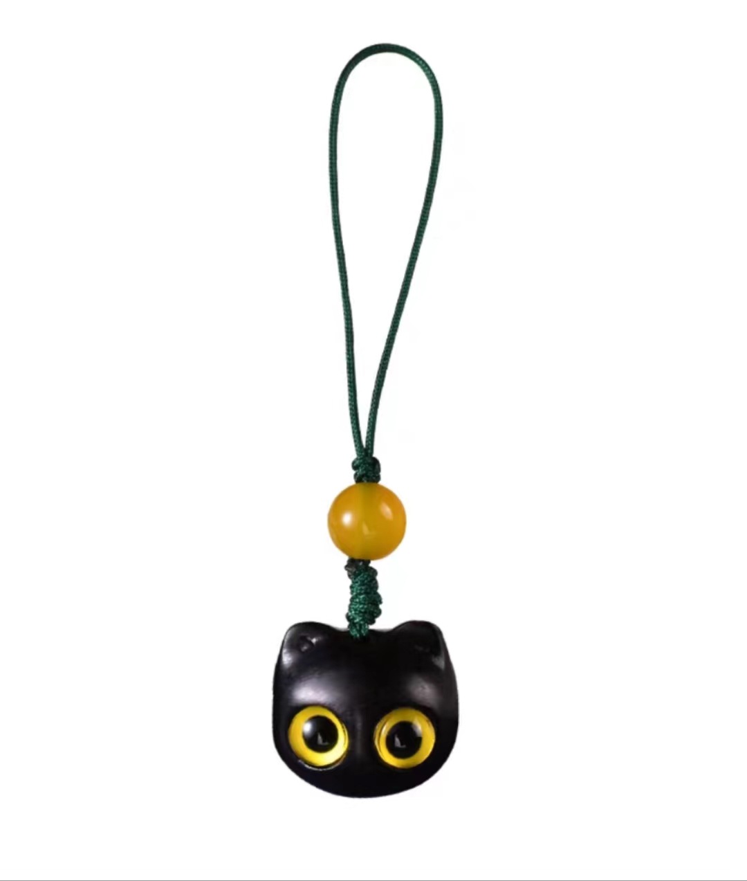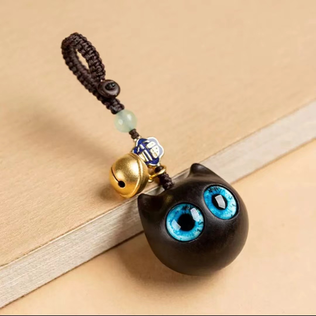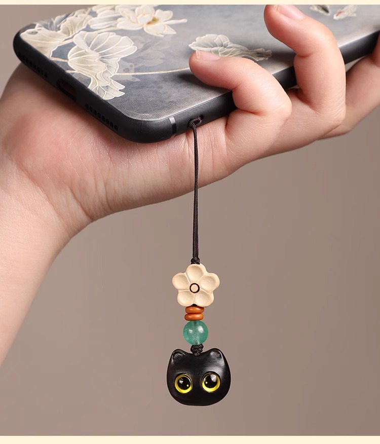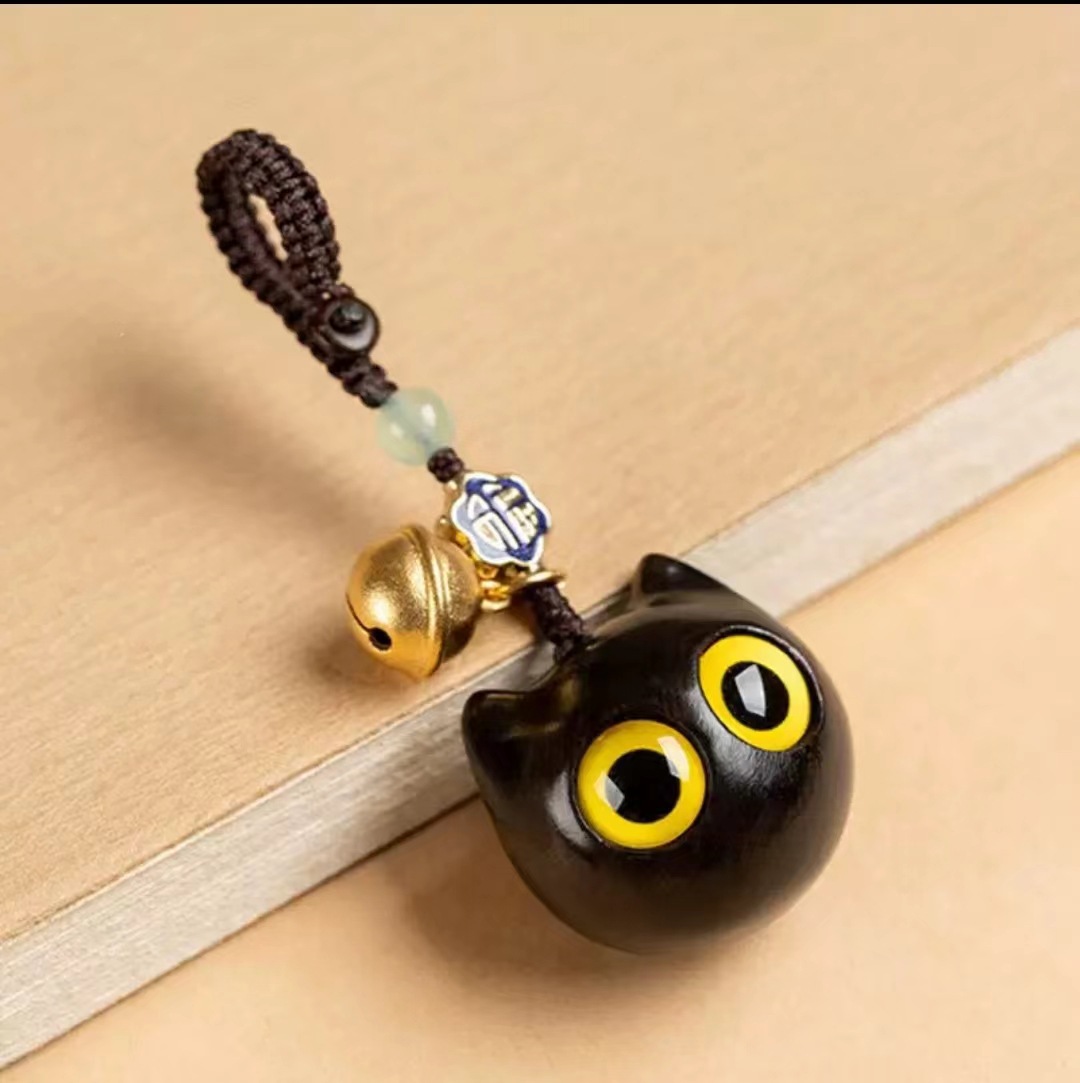 天然黑檀猫咪汽车钥匙扣黄杨木莲花文玩挂件吊坠饰品铃铛手机链