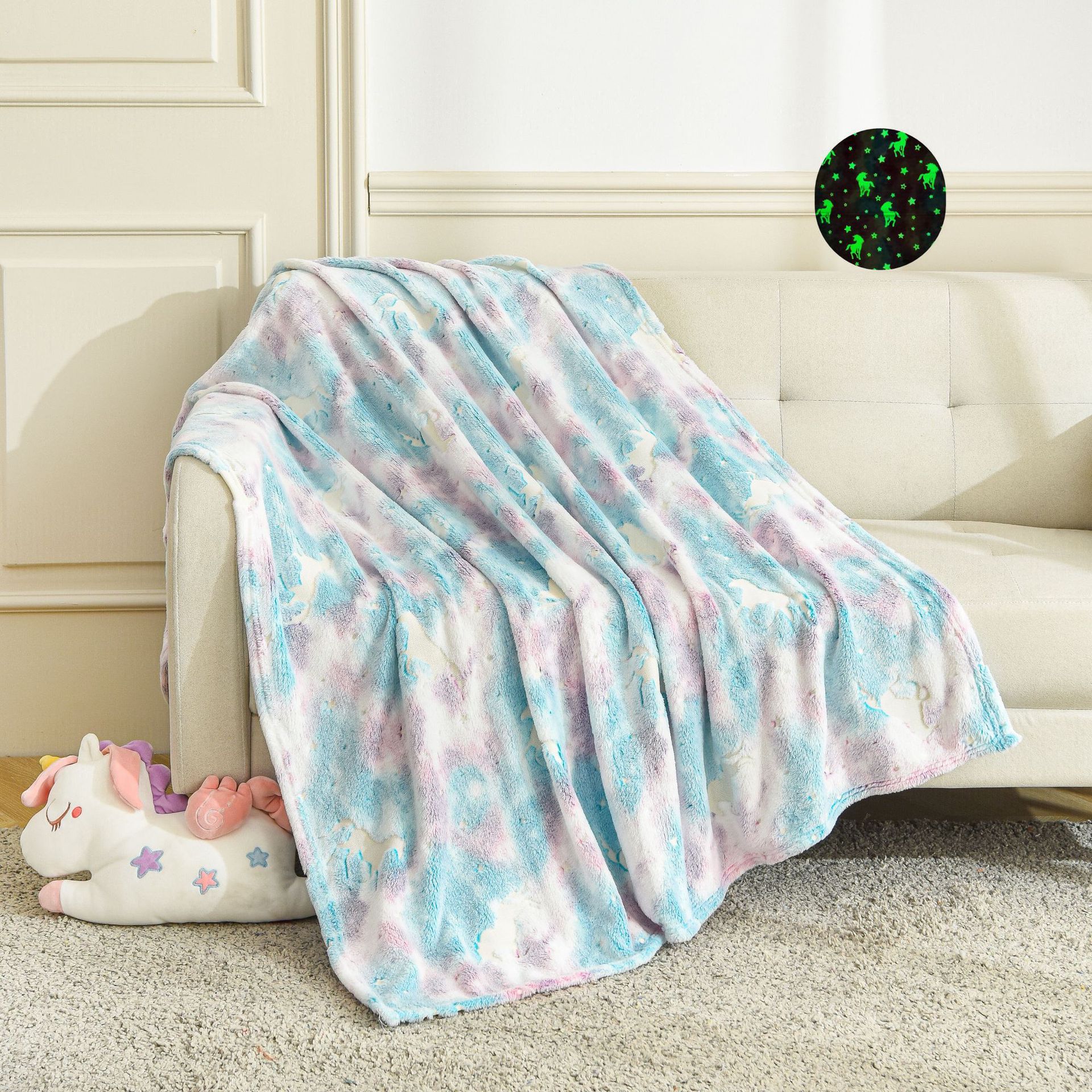 夜光独角兽毯子卡通恐龙荧光毯发光毯子儿童床上用品盖毯一件发货