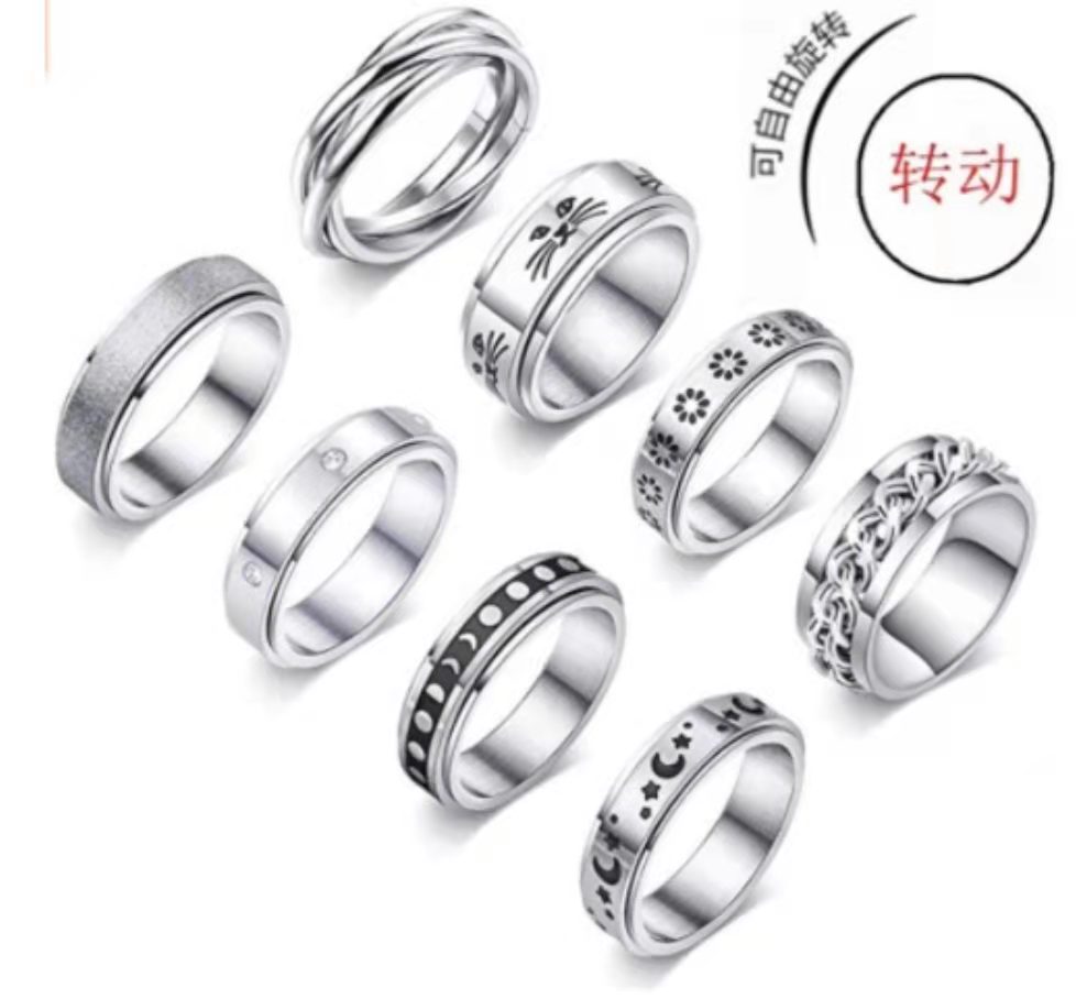 亚马逊跨境爆款 钛钢转动套装戒指 不锈钢星星月亮可旋转男士戒指