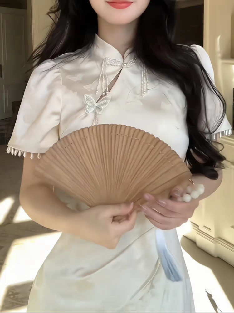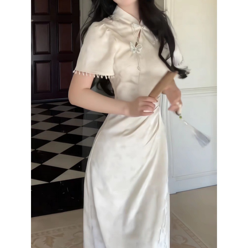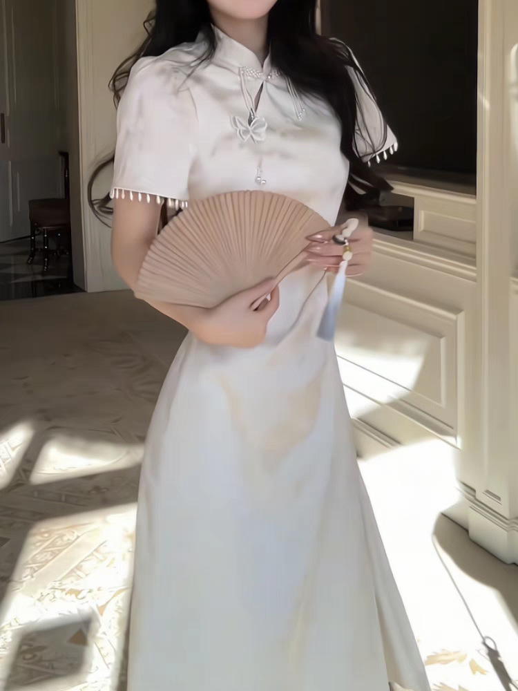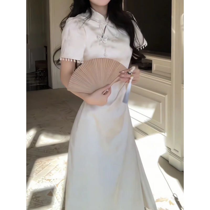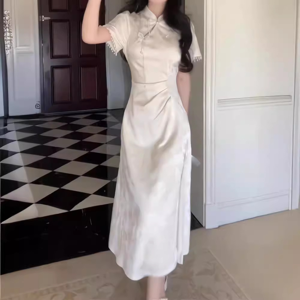 浅云霜韵 新中式提花斜襟高开衩旗袍连衣裙